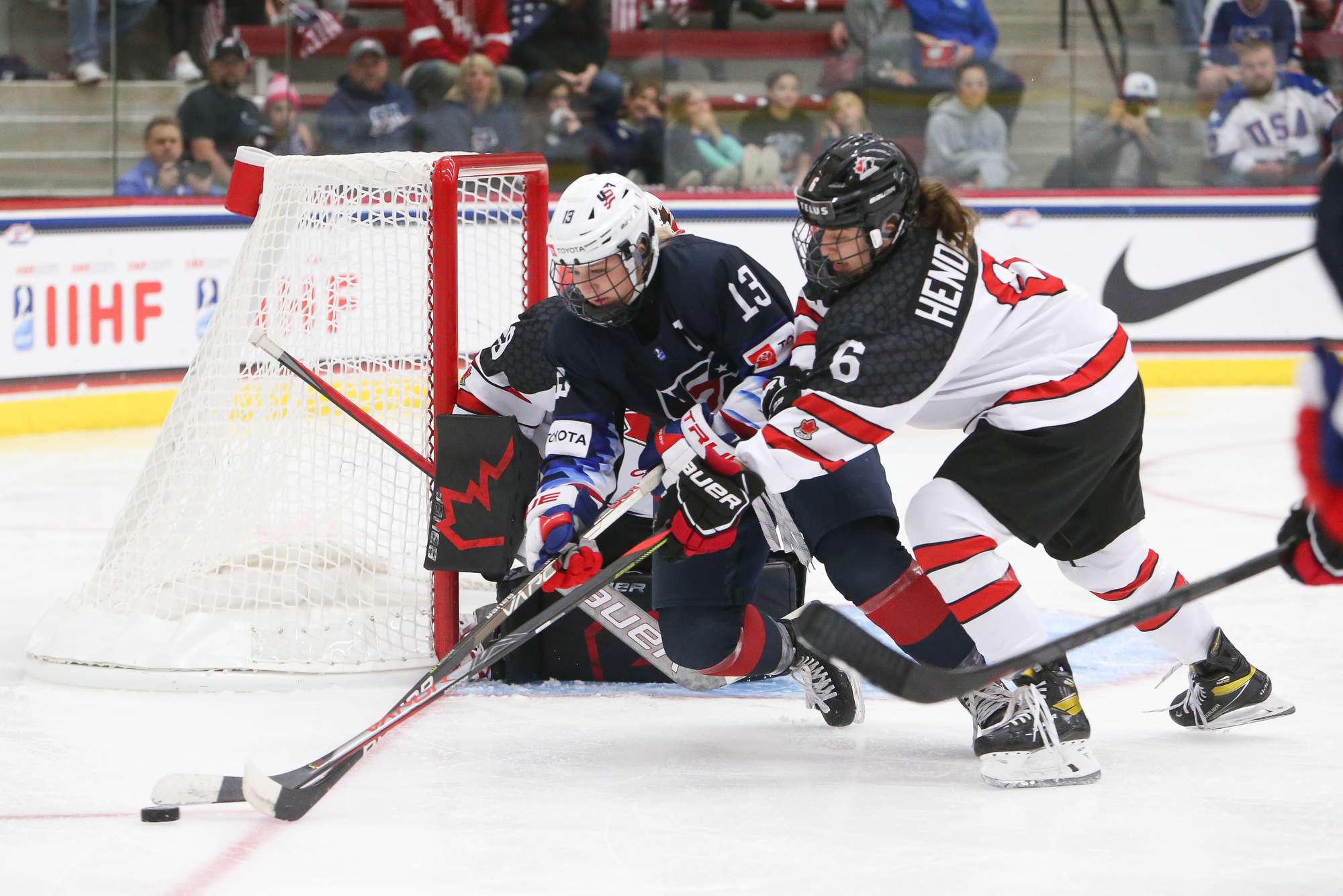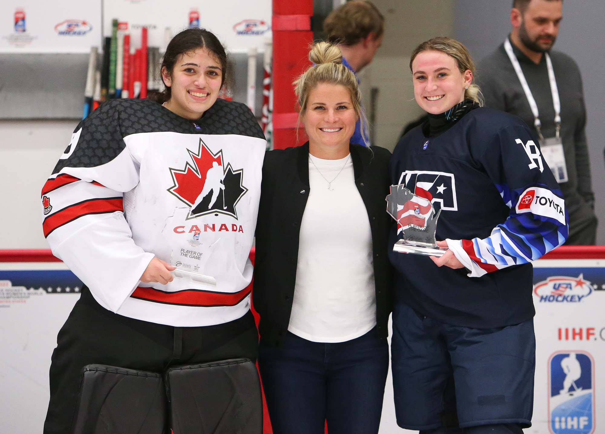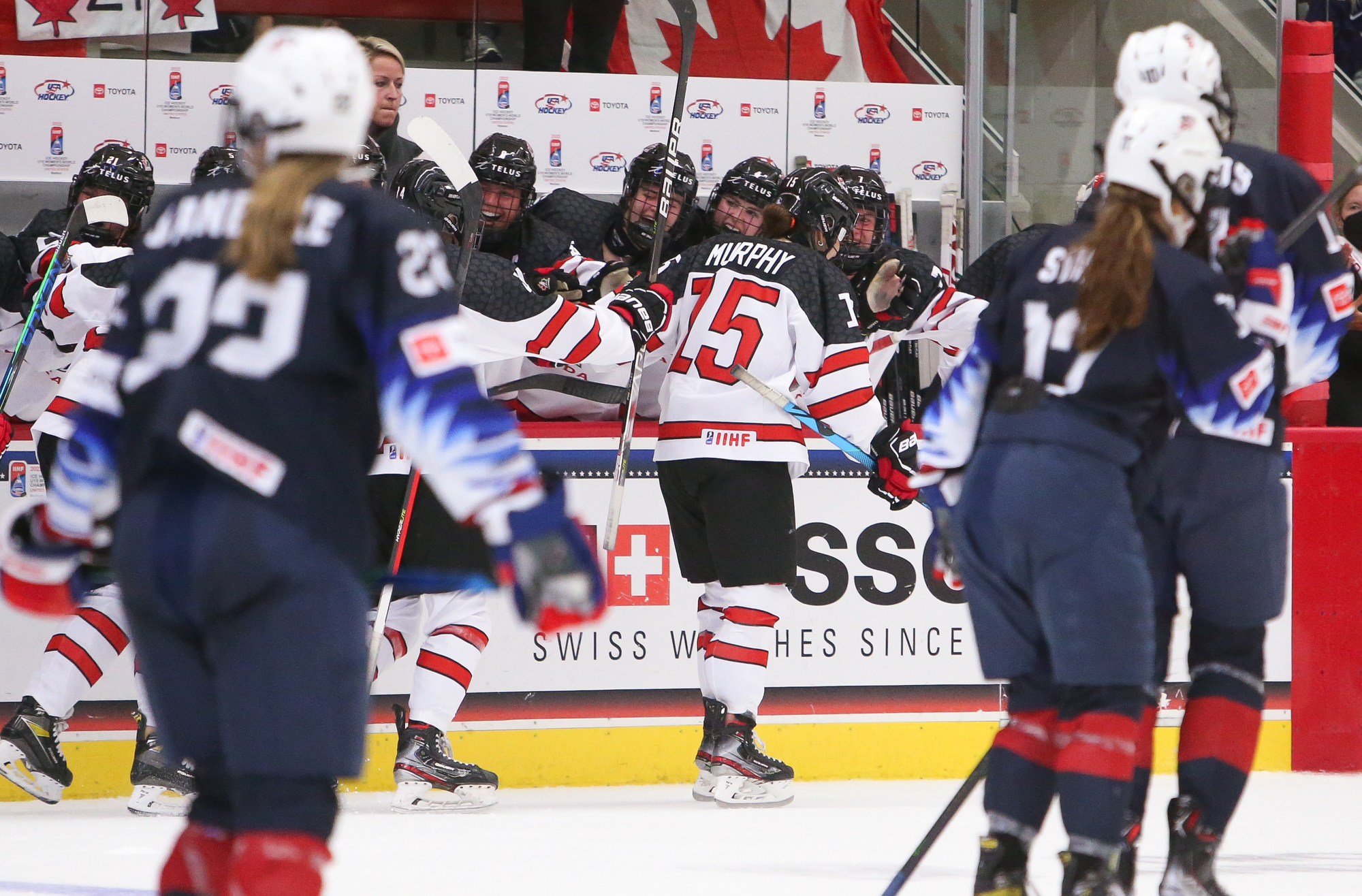 Canada jumped into a 2-0 lead at 11:36. Forward Jade Iginla, playing in her third playoff game after returning from an upper-body injury, hustled the puck into the American zone. The tenacious and talented daughter of Jarome Iginla tried to put the puck in at the side of the net and it squirted out into the slot to Murphy, who hammered it through Bergmann.