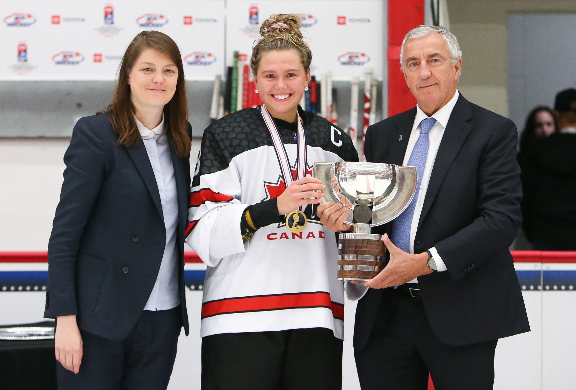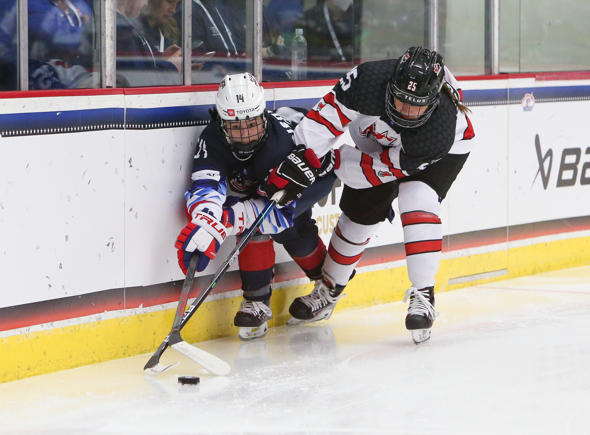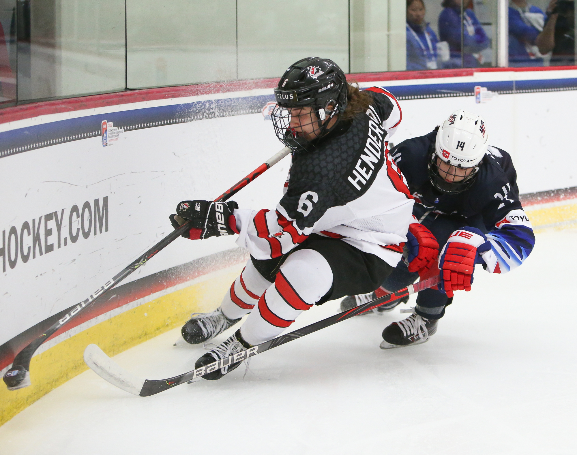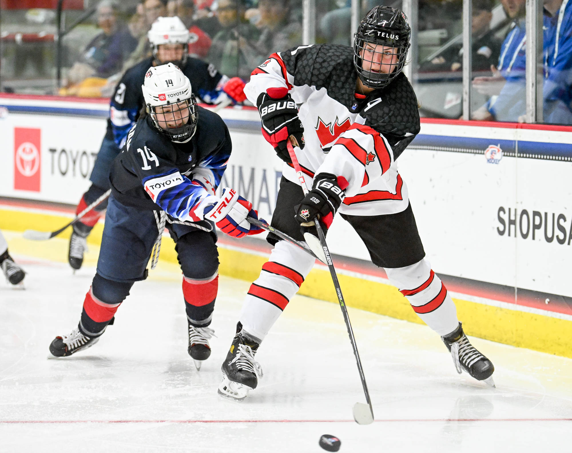 Canada jumped into a 2-0 lead at 11:36. Forward Jade Iginla, playing in her third playoff game after returning from an upper-body injury, hustled the puck into the American zone. The tenacious and talented daughter of Jarome Iginla tried to put the puck in at the side of the net and it squirted out into the slot to Murphy, who hammered it through Bergmann.