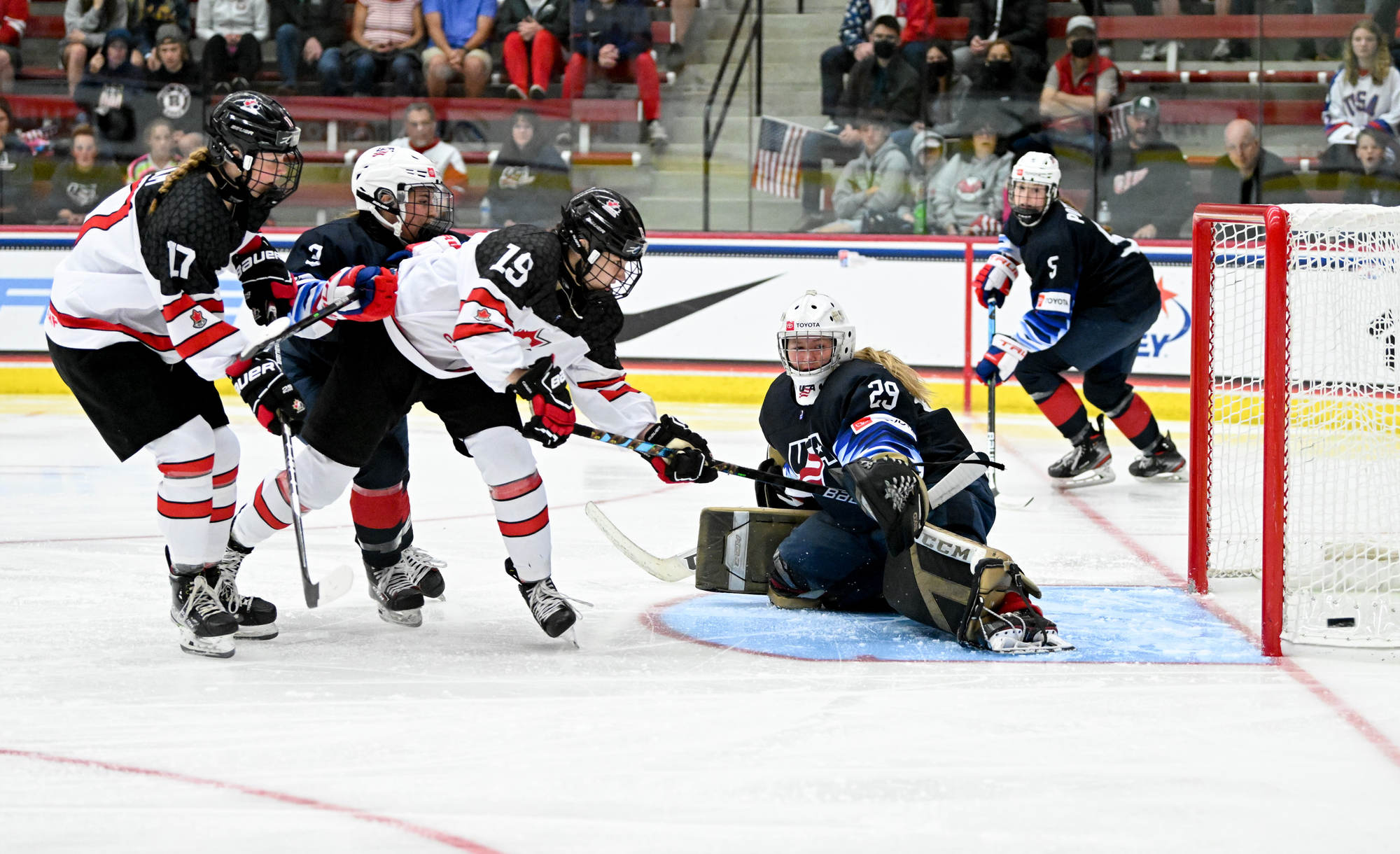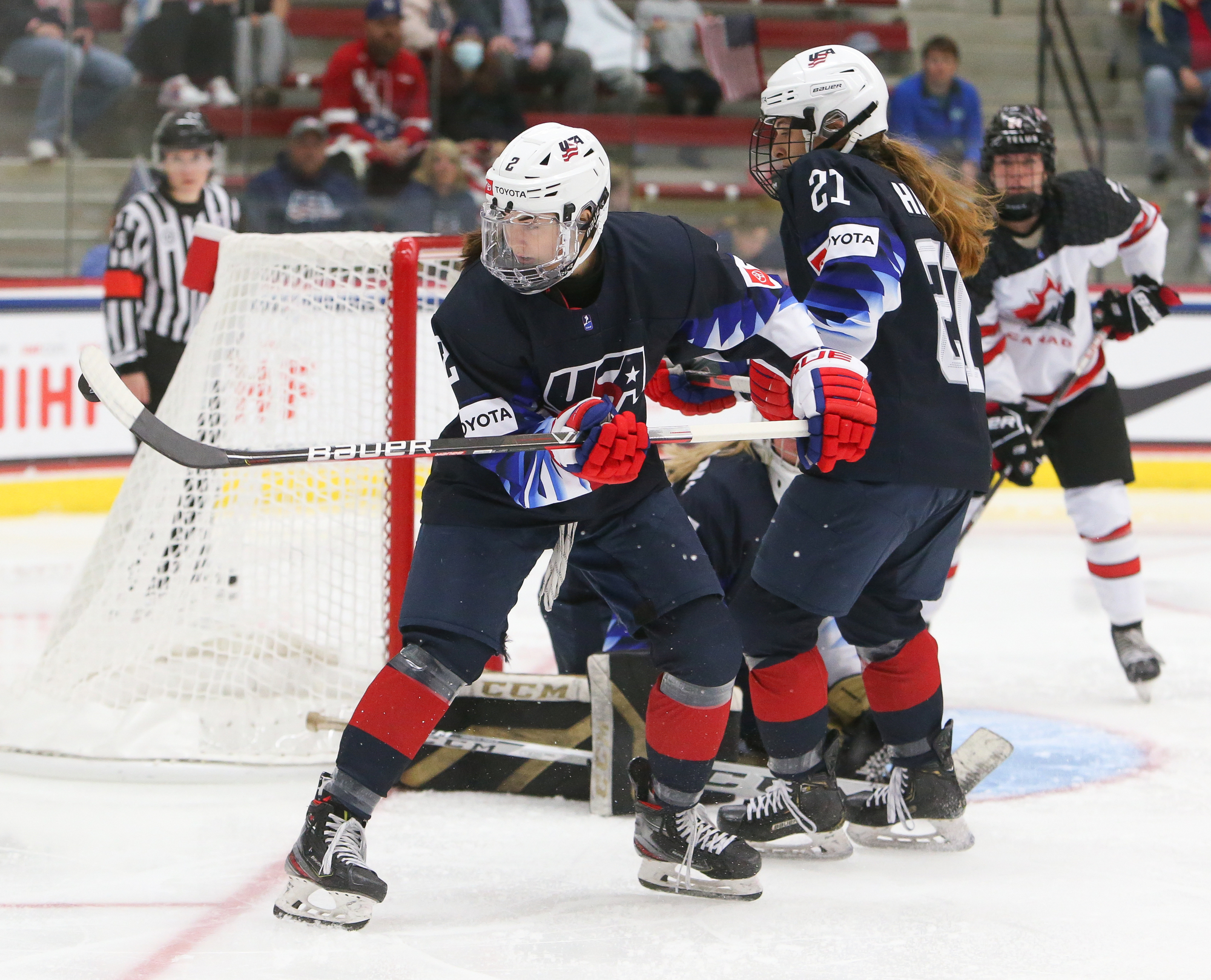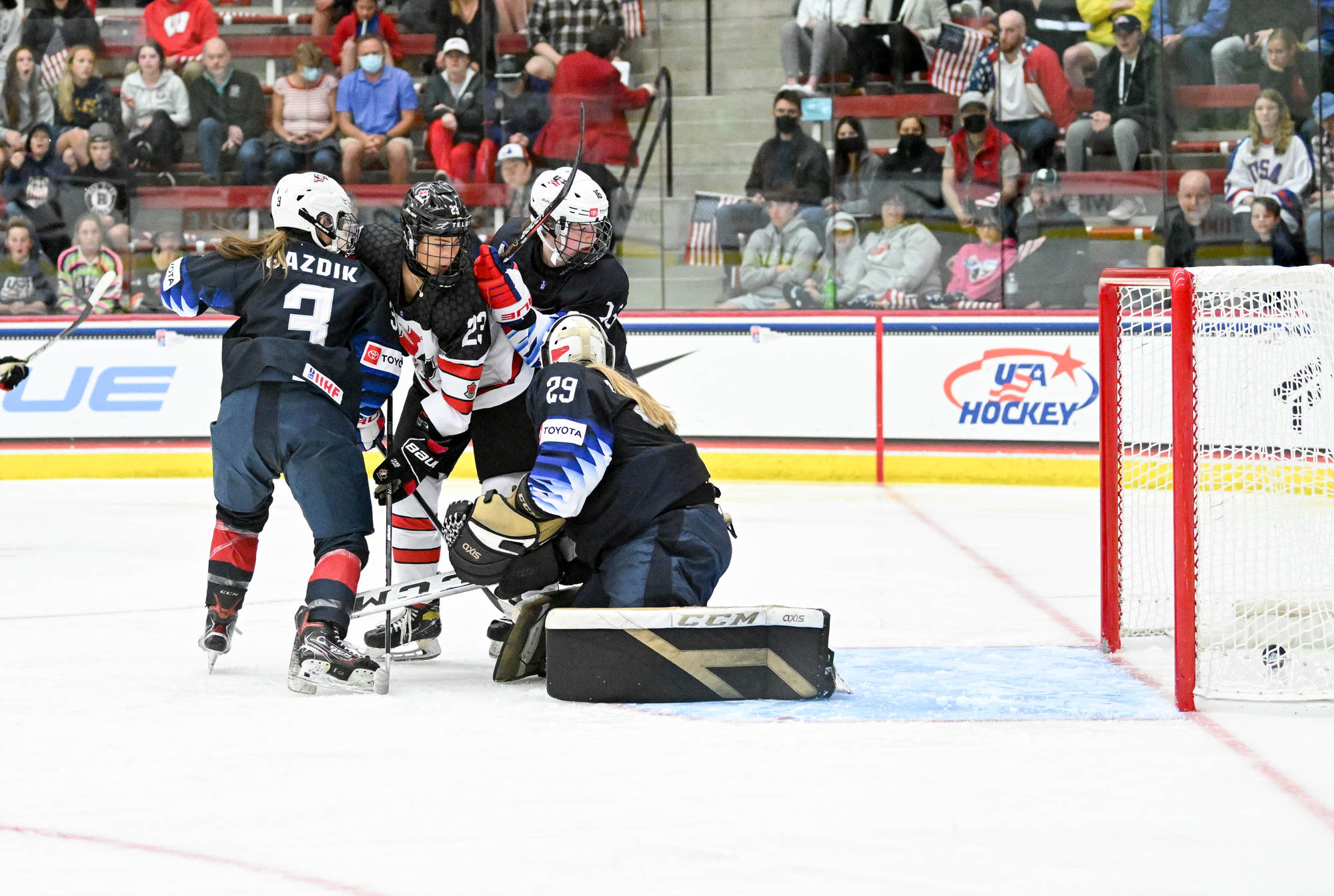 In the second period, the end-to-end action continued. Bergmann had to be quick with her right pad to stop Emmalee Pais with a spinaround shot from the slot. The U.S. goalie also stopped Jordan Baxter from point-blank range and kept the puck out during a ferocious goalmouth scrum.