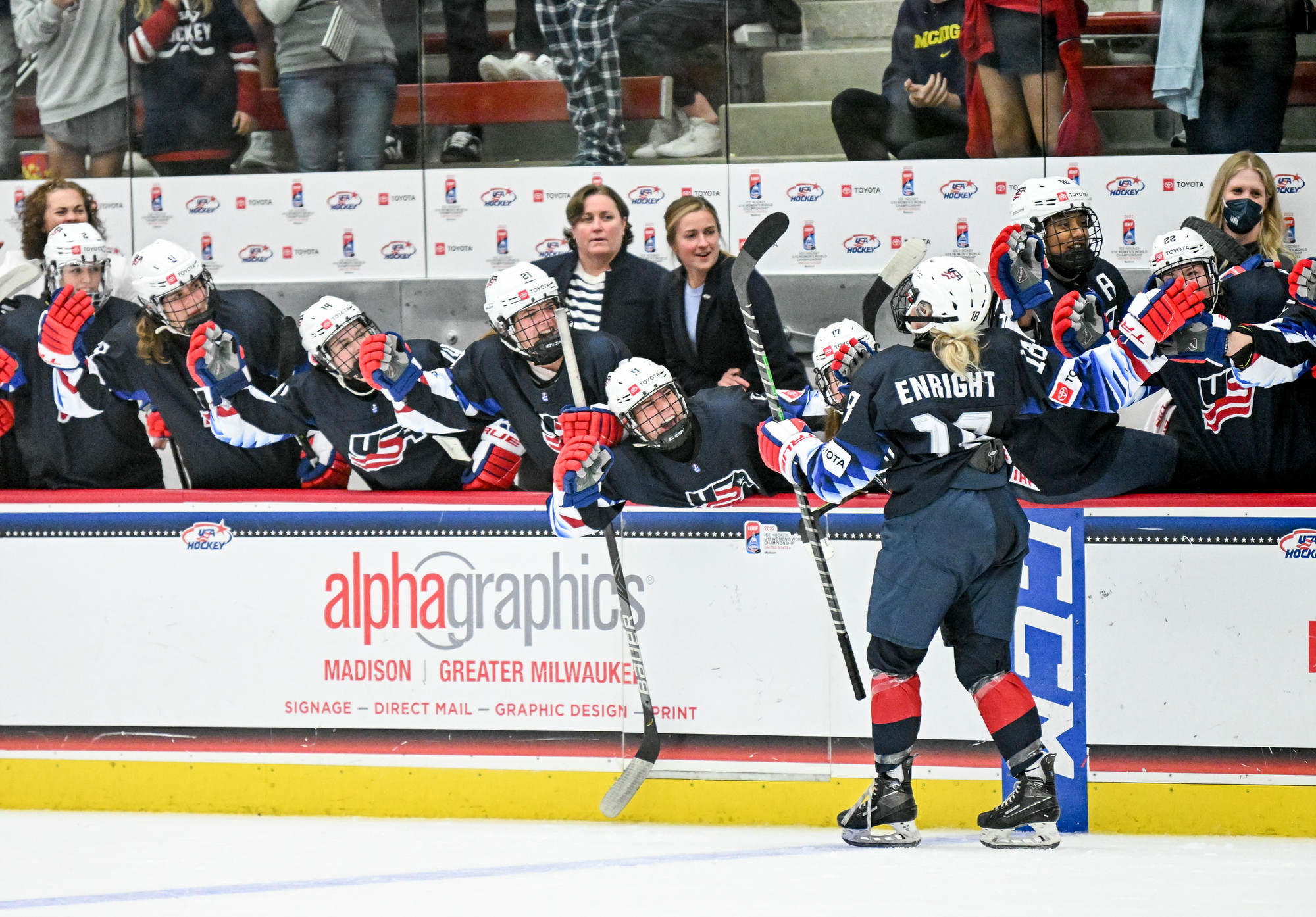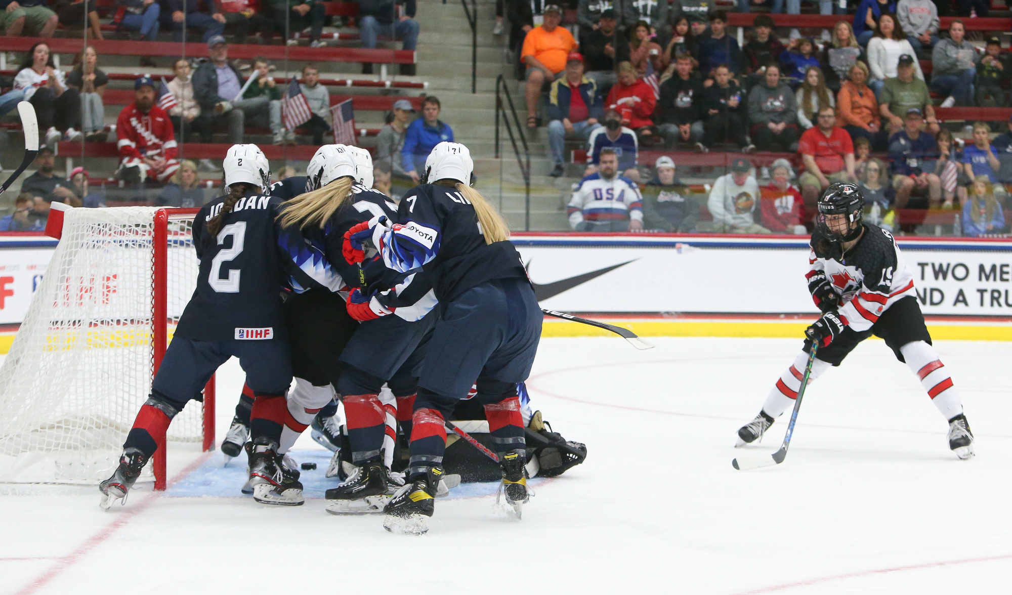 Off the centre-face off, Enright barged to the net and banged a loose puck over Pietersen to reduce Canada's lead to one goal. The gap between goals was just seven seconds. That equalled the tournament record set by fellow Americans Alex Carpenter and Kendall Coyne in 2010 versus the Czechs and by Abby Ness and Sydney Daniels in 2011 versus the Czechs. Now the chants of "USA!" were deafening.