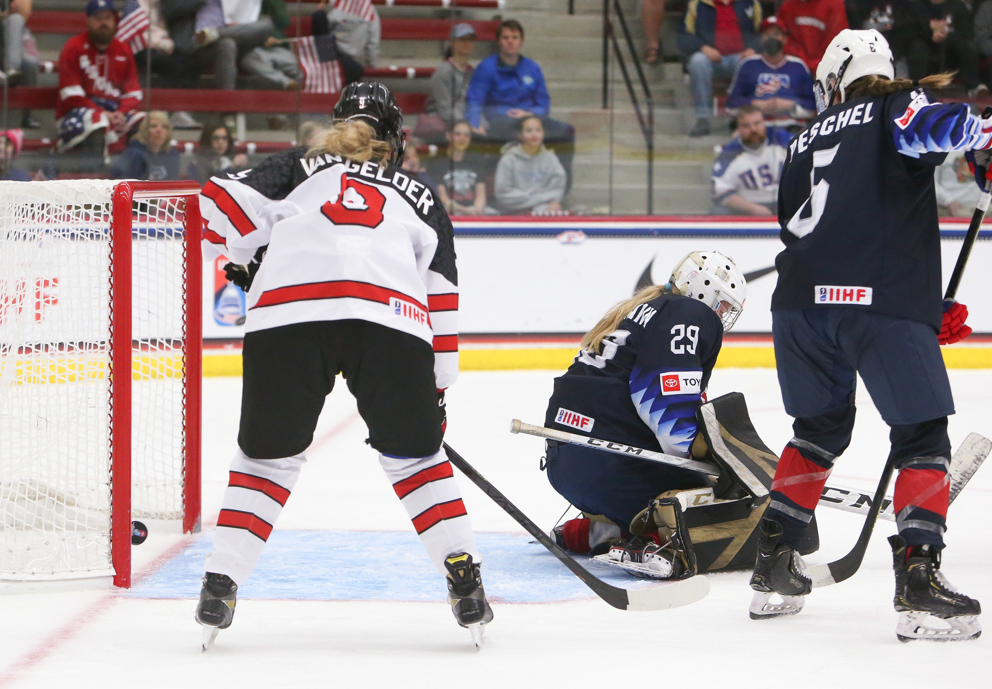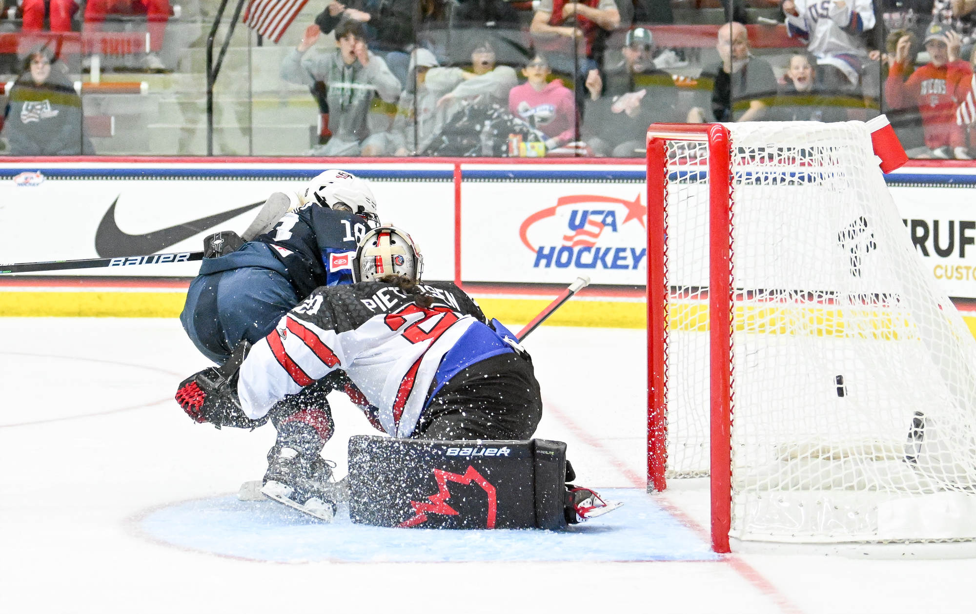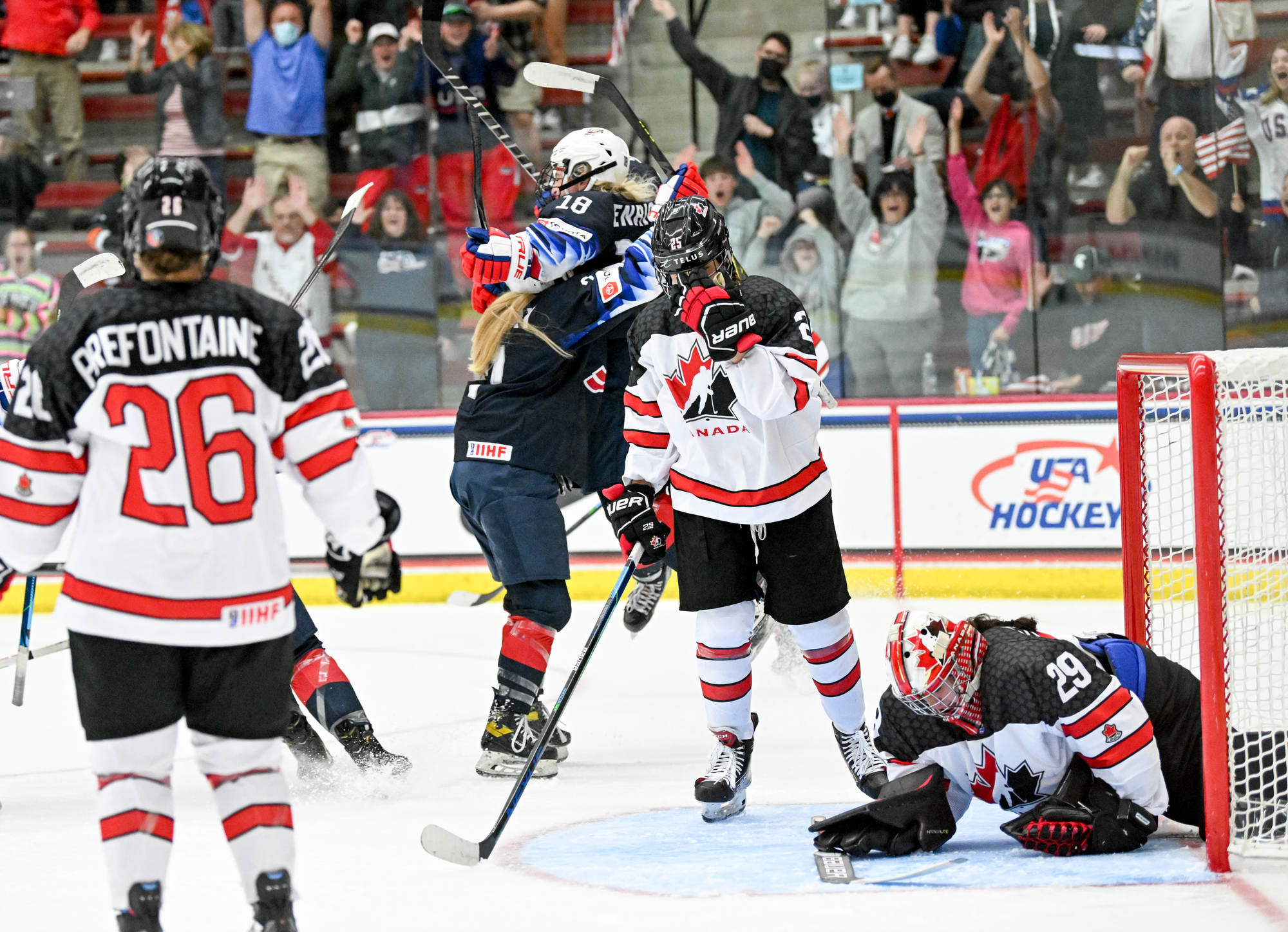 The high-tempo action matched the jacked-up atmosphere with a capacity crowd waving U.S. flags. Metallica’s "Enter Sandman" blasted at the opening faceoff, and ironically, the Americans were nearly caught napping on a first-minute 3-on-1 for Canada. Assistant captain Karel Prefontaine, who led all Canadians with seven shots in the 3-2 semi-final win over Sweden, blazed down left wing and rang one off the cross bar.
