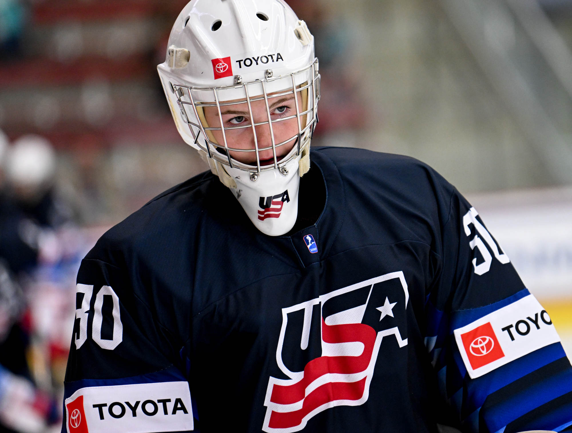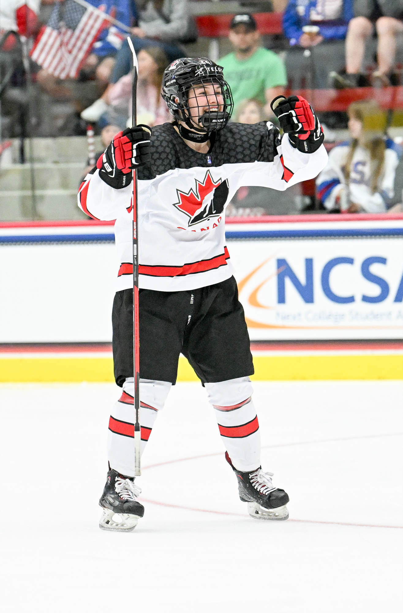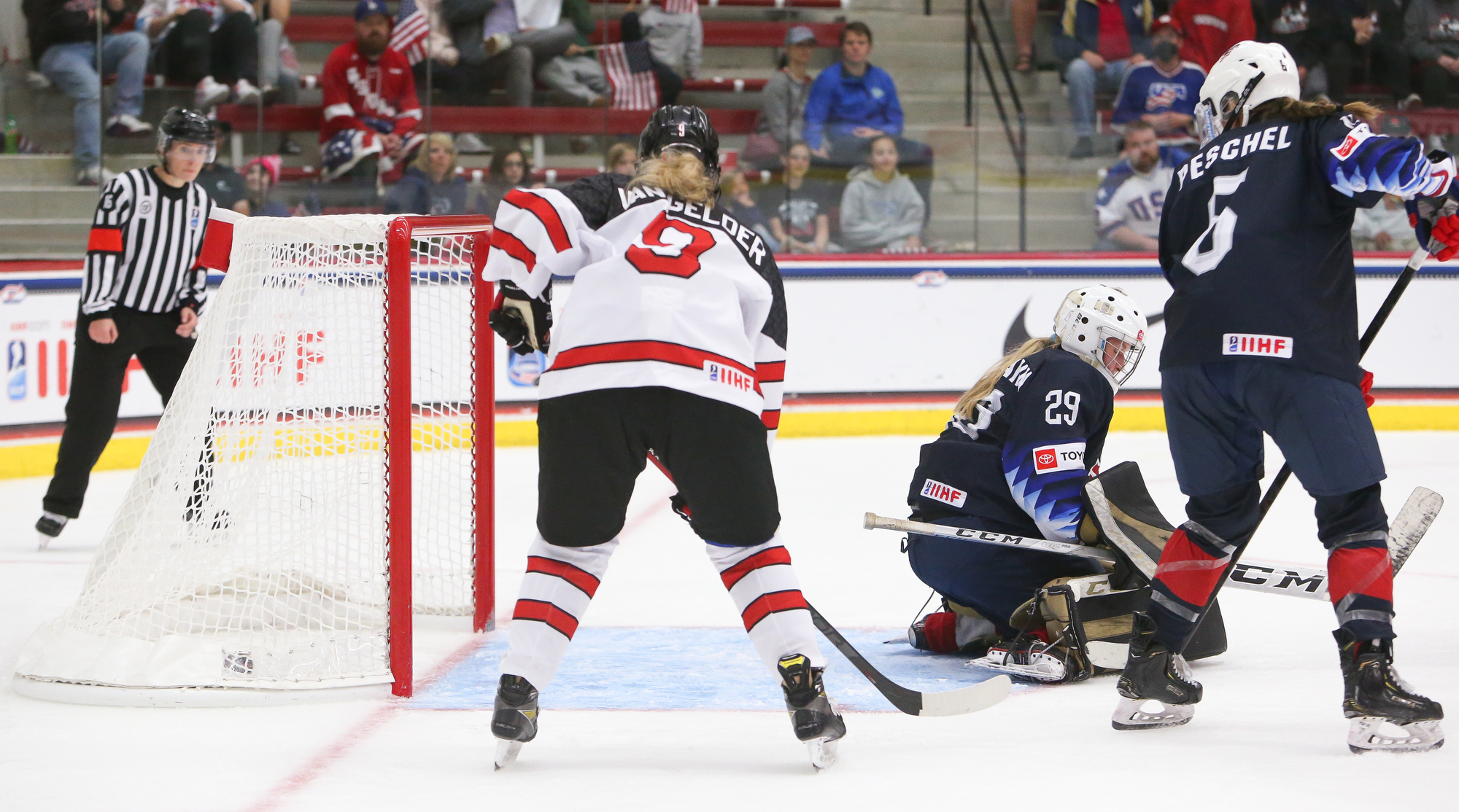 The high-tempo action matched the jacked-up atmosphere with a capacity crowd waving U.S. flags. Metallica’s "Enter Sandman" blasted at the opening faceoff, and ironically, the Americans were nearly caught napping on a first-minute 3-on-1 for Canada. Assistant captain Karel Prefontaine, who led all Canadians with seven shots in the 3-2 semi-final win over Sweden, blazed down left wing and rang one off the cross bar.
