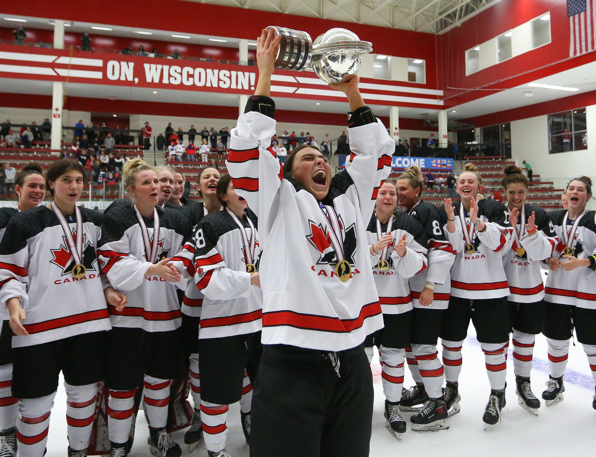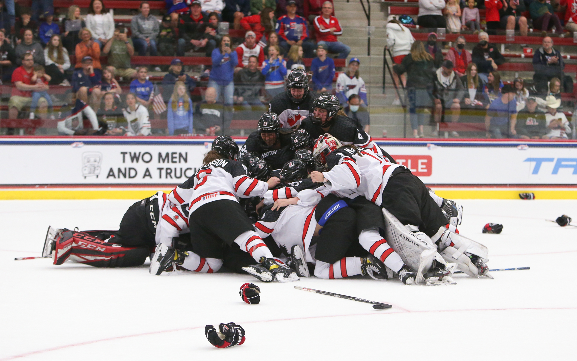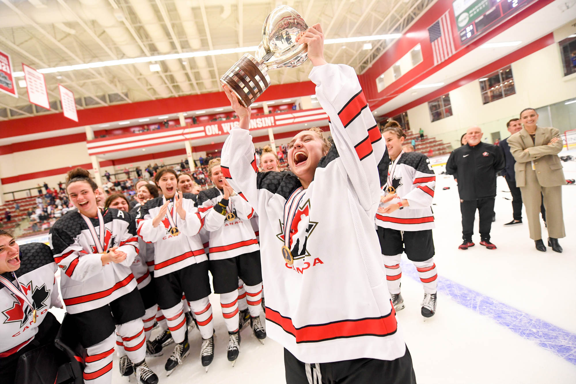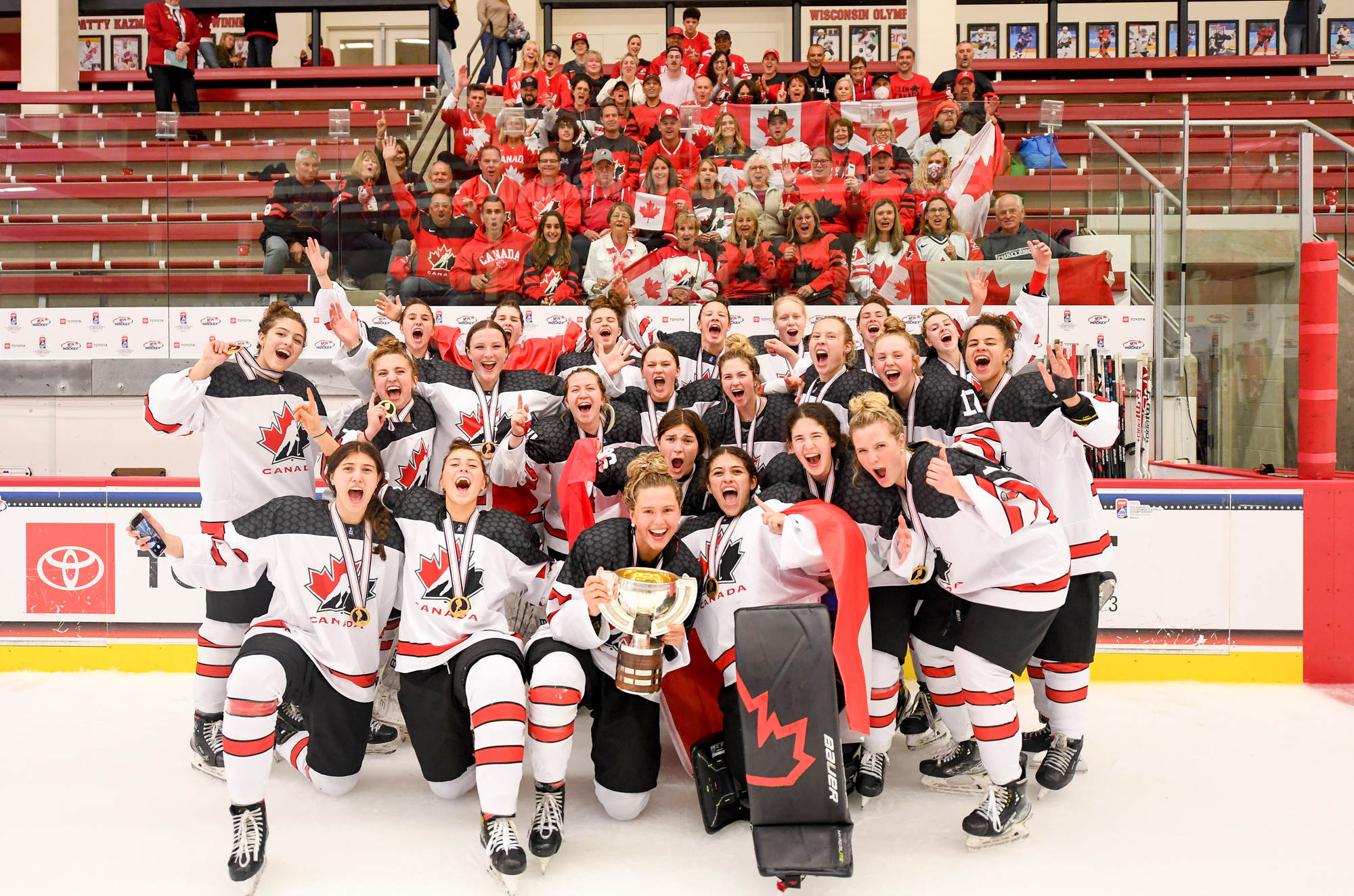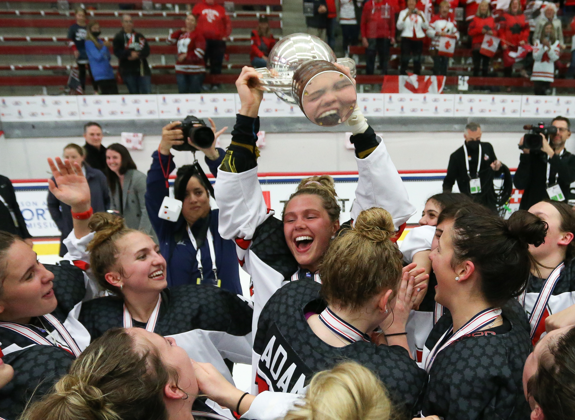 Canada celebrates after the 3-2 gold-medal victory over the host Americans at the 2022 IIHF Ice Hockey U18 World Championship in Madison, Wisconsin.
