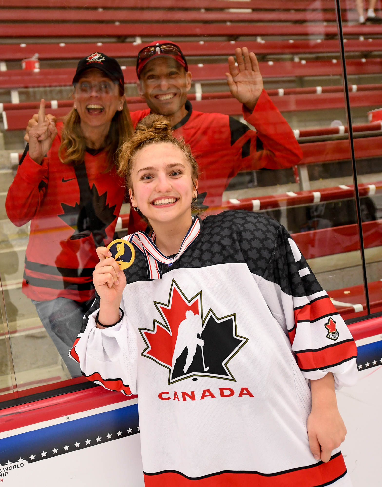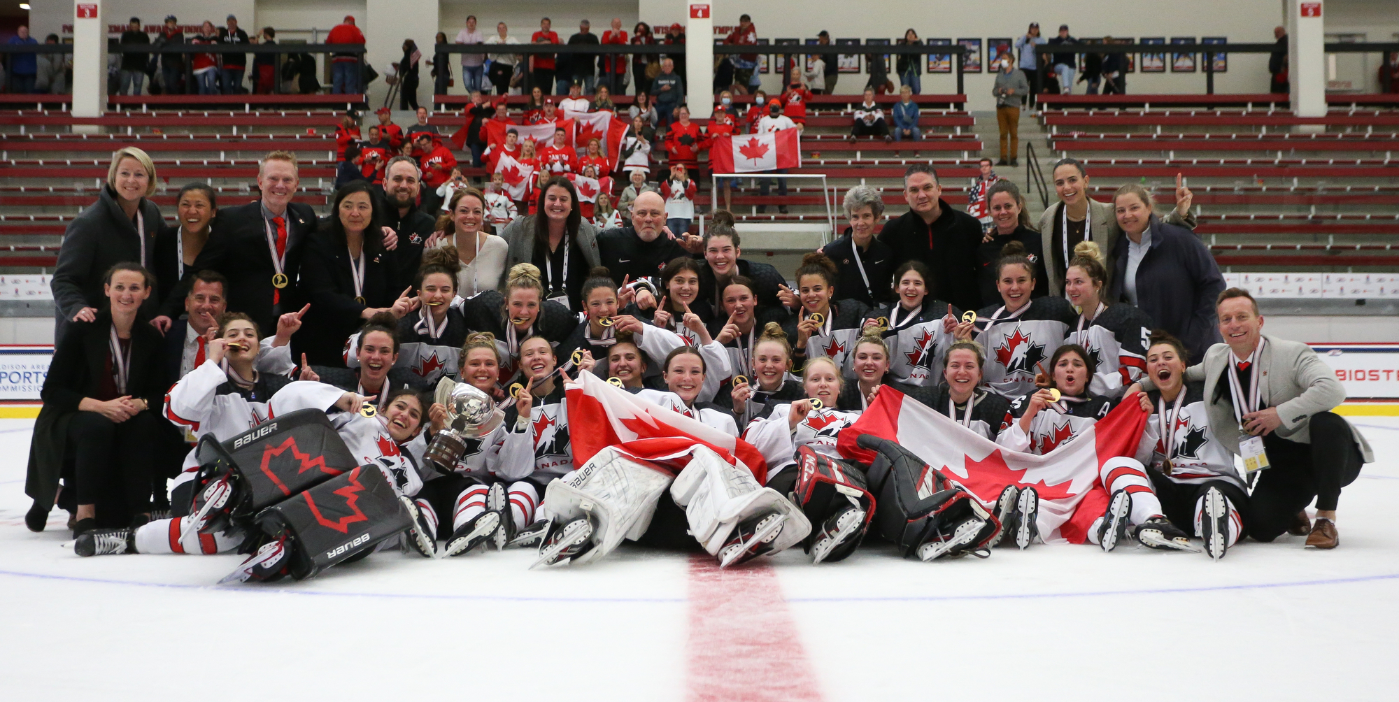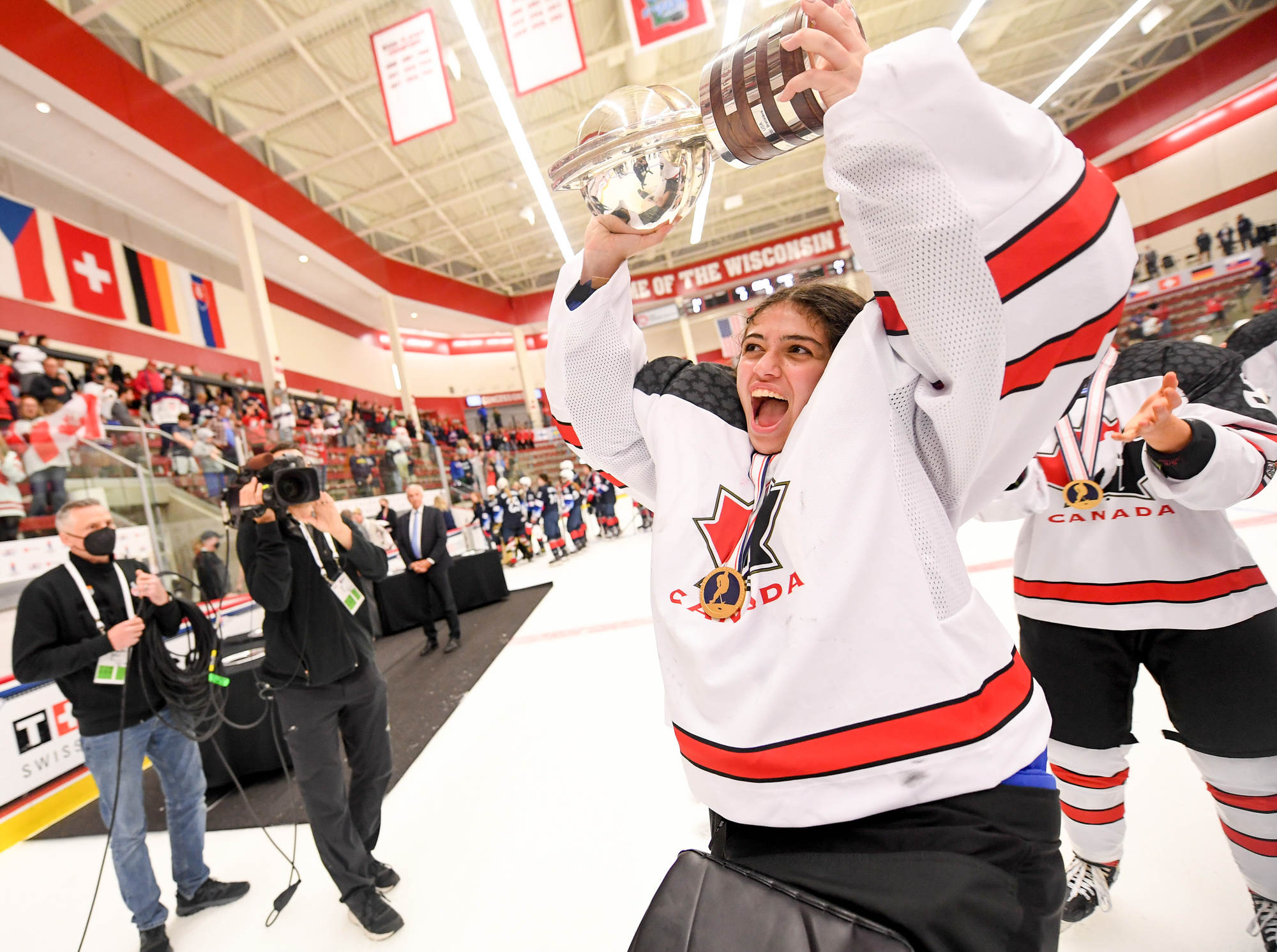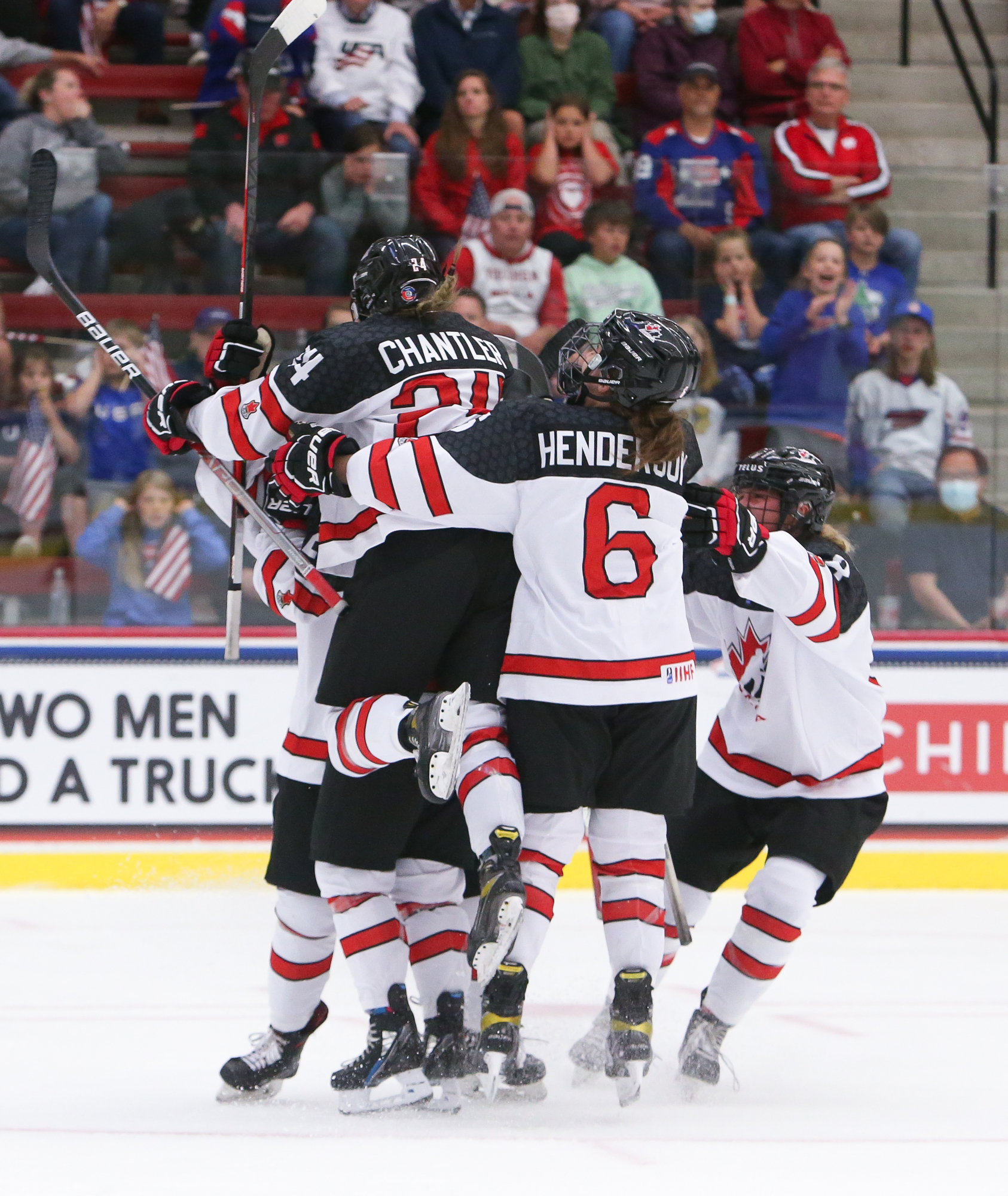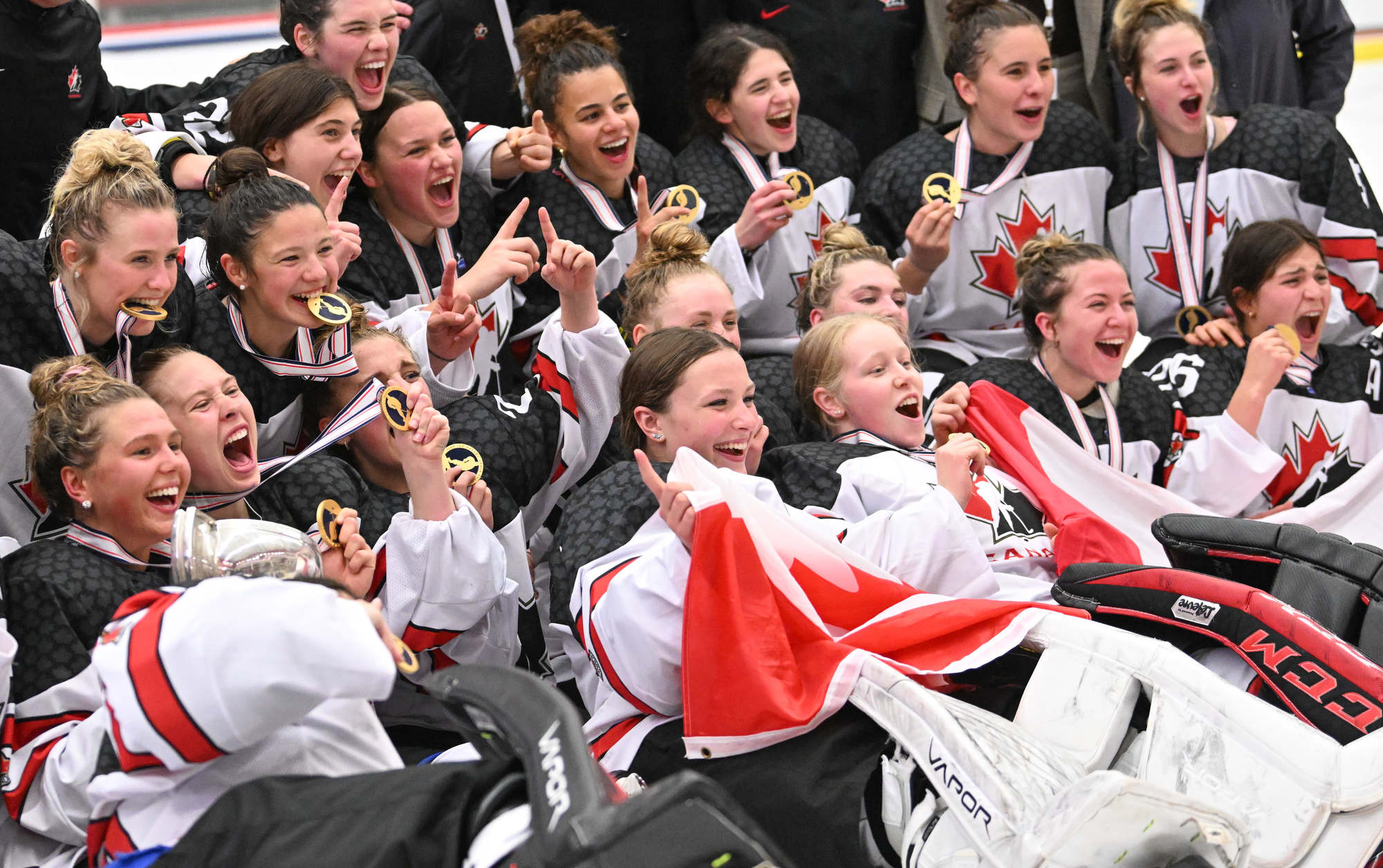 Canada celebrates after the 3-2 gold-medal victory over the host Americans at the 2022 IIHF Ice Hockey U18 World Championship in Madison, Wisconsin.