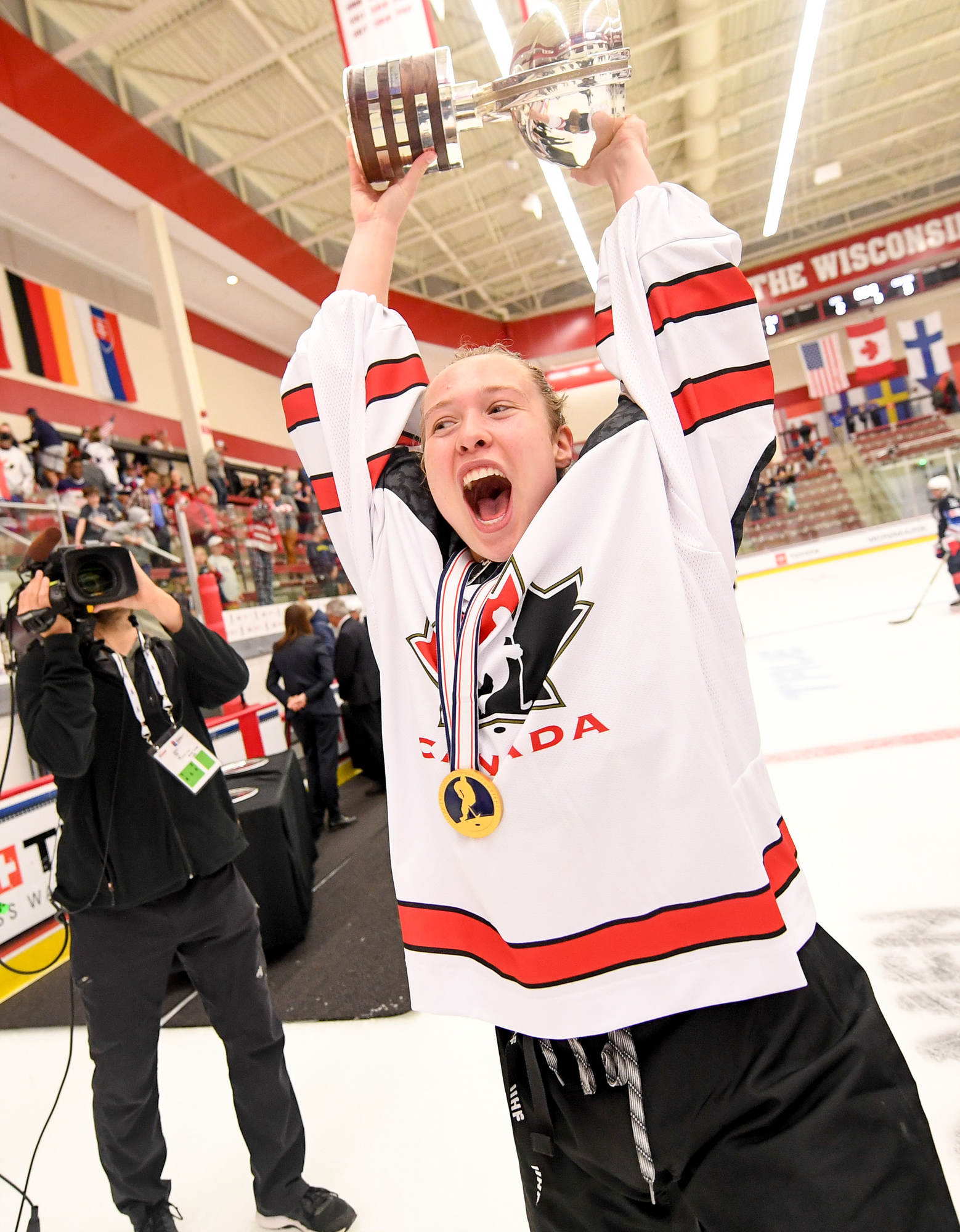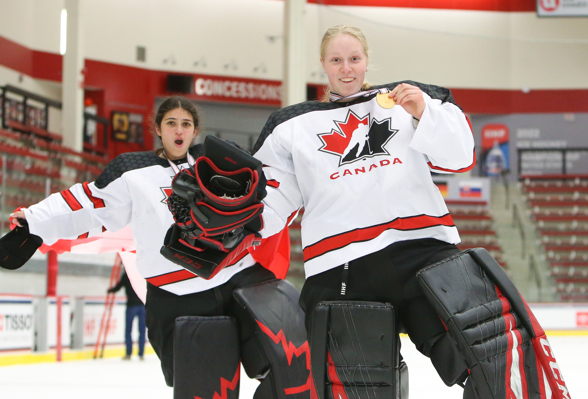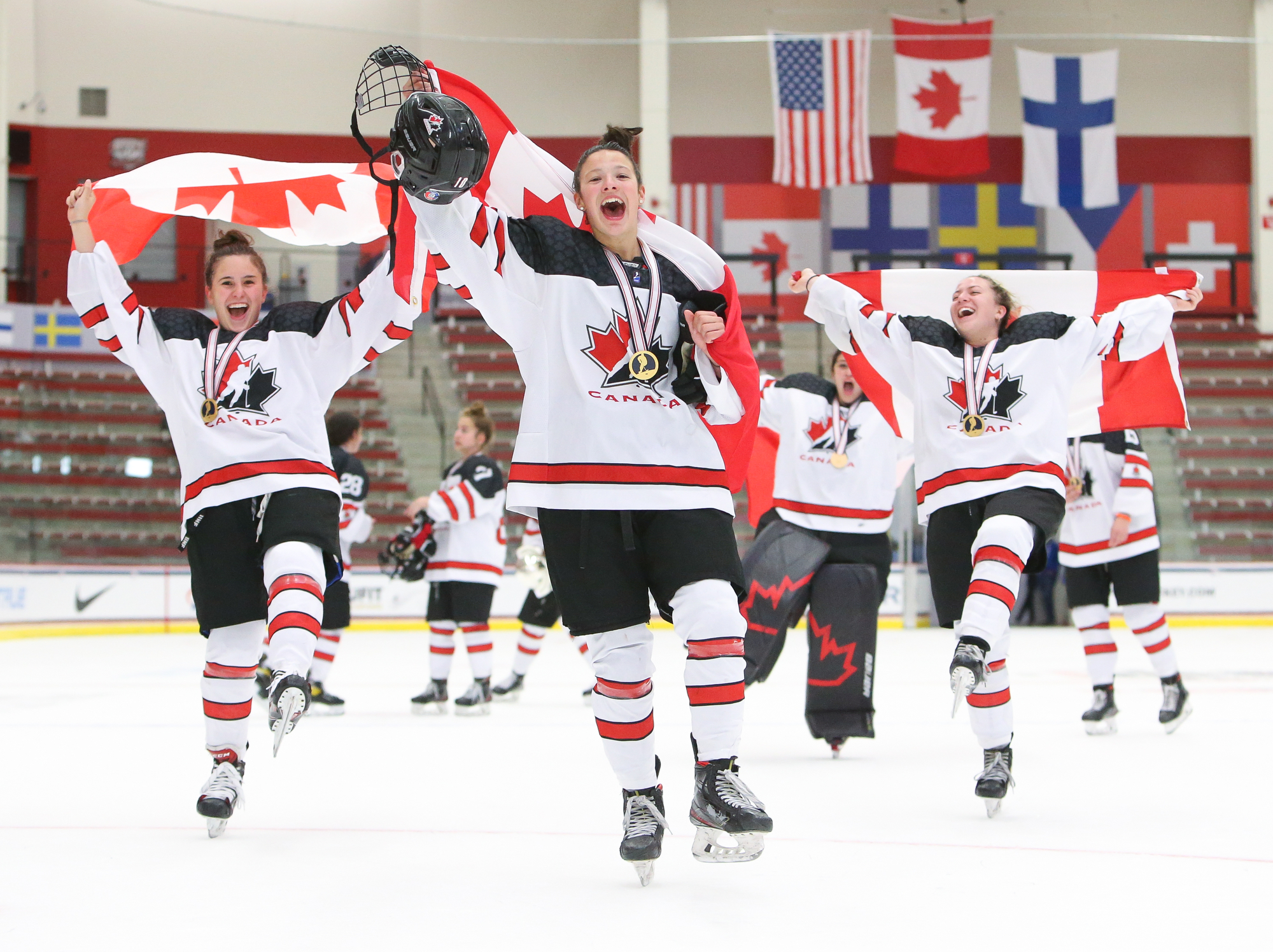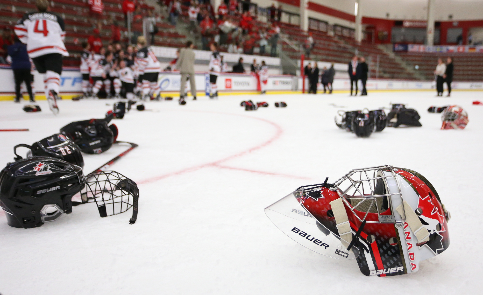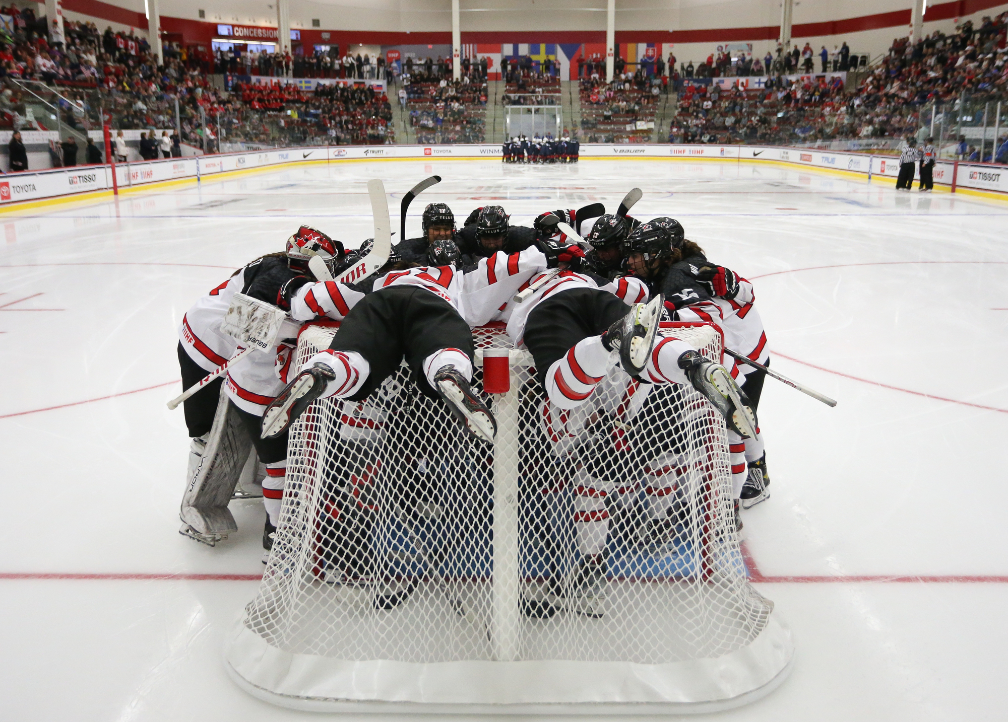 The Canadians joyously mobbed their goalie at the final buzzer.