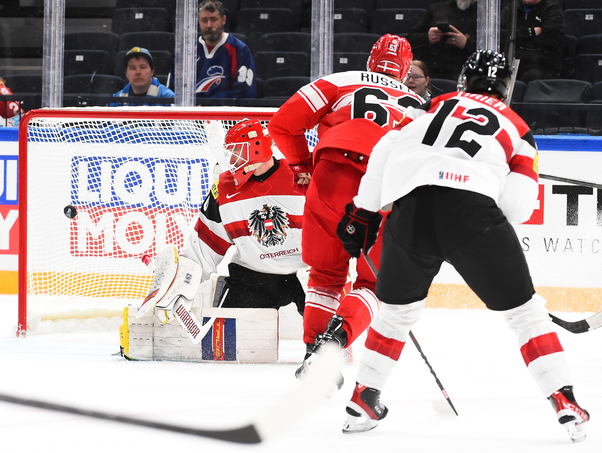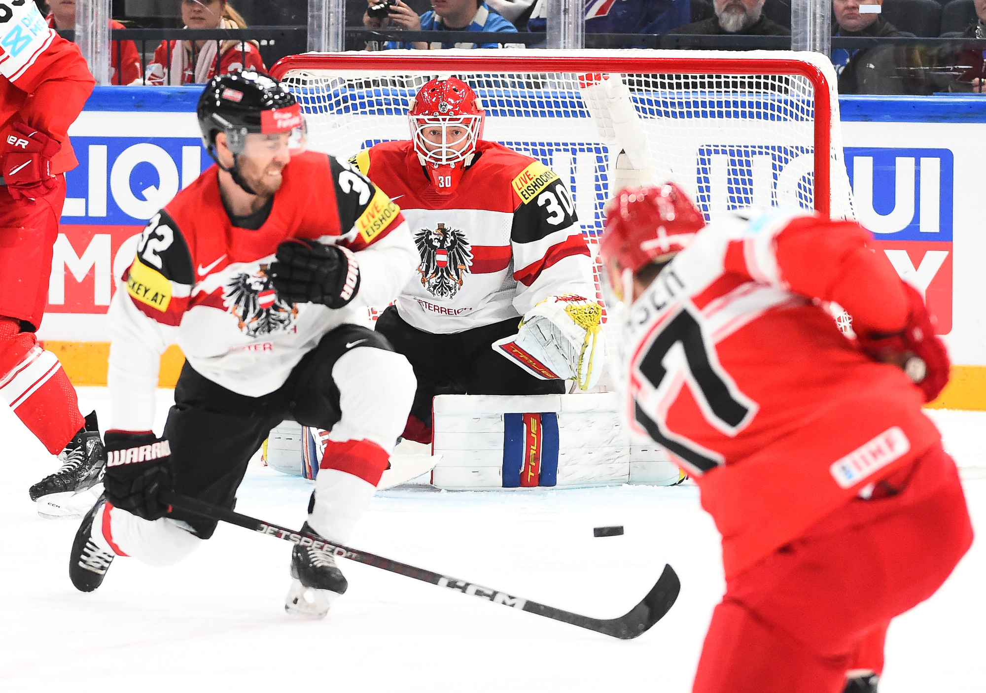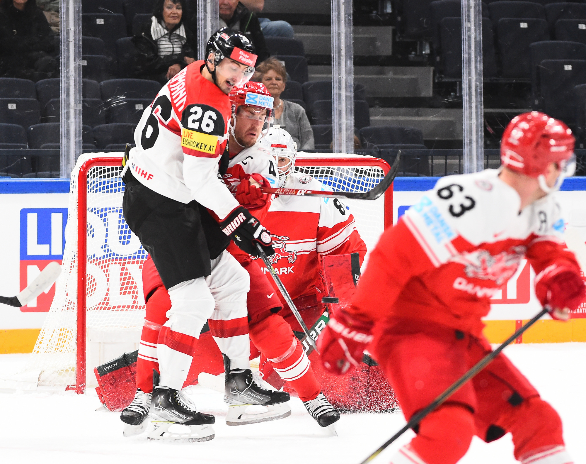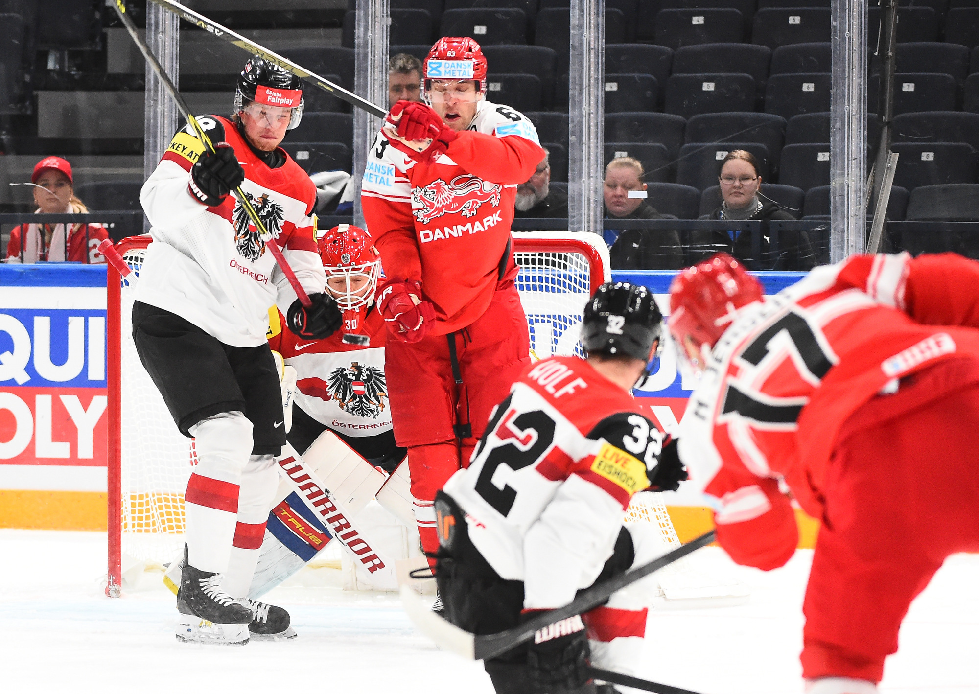 The physicality picked up as the opening stanza wore on, such as when Danish blueliner Anders Krogsgaard ran the 193-cm, 101-kg Austrian forward Paul Huber into the end boards. Austria’s Dominique Heinrich came close to equalizing, rattling a point shot off Dichow’s left post.