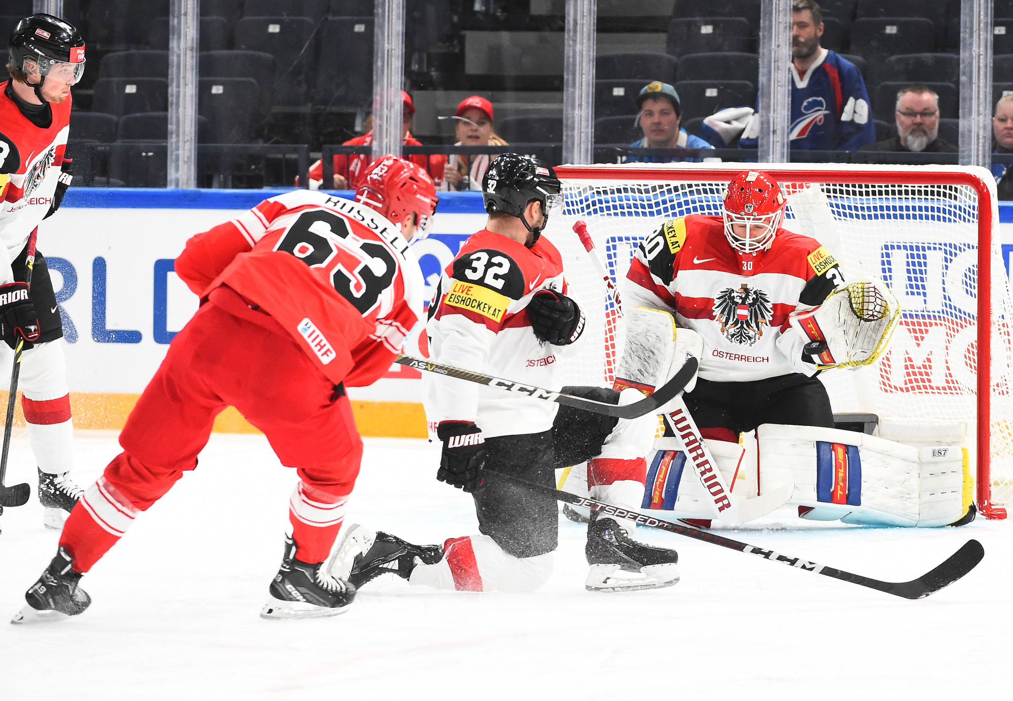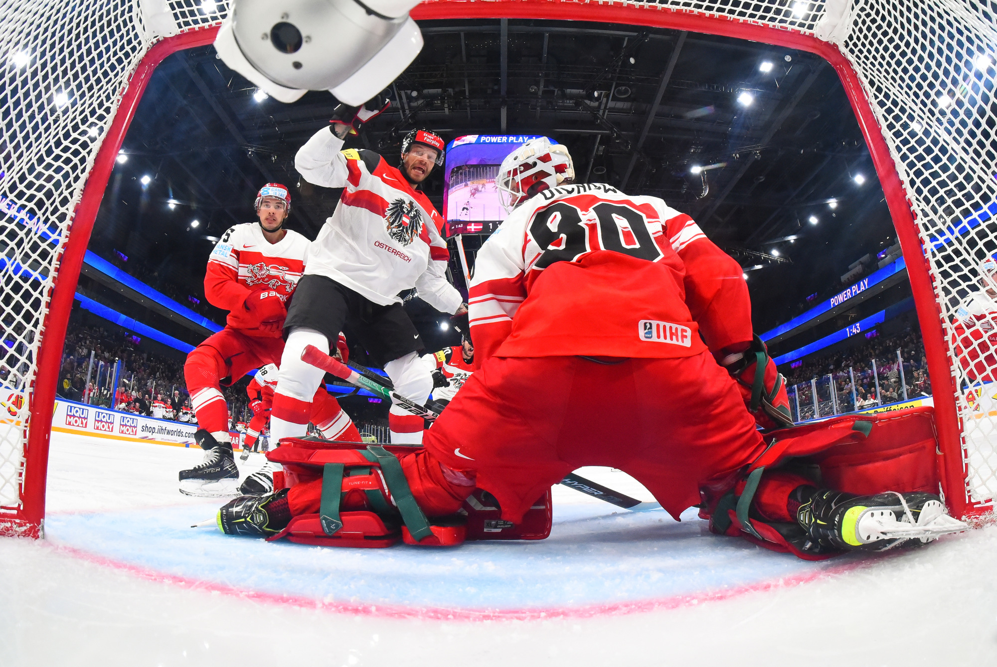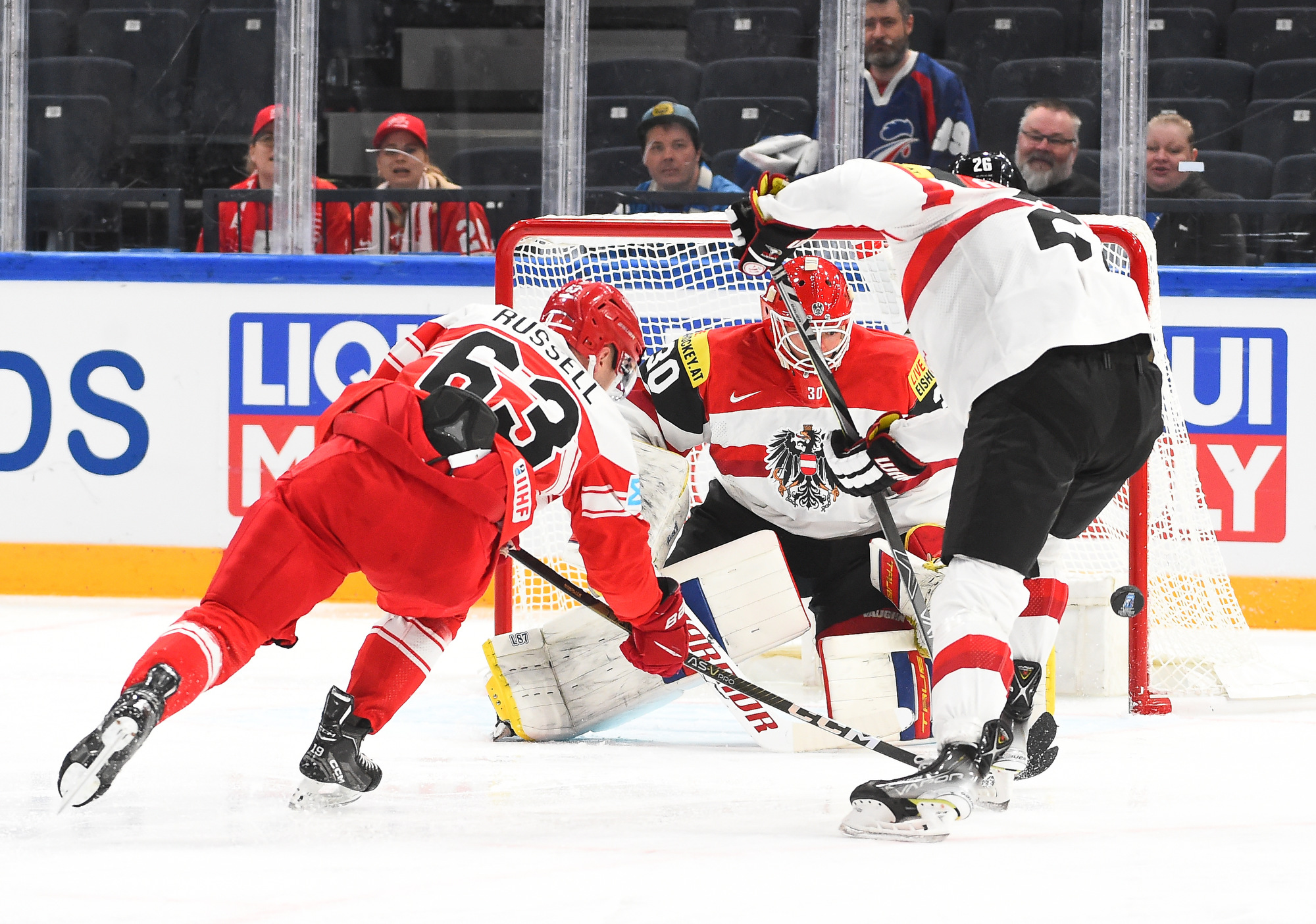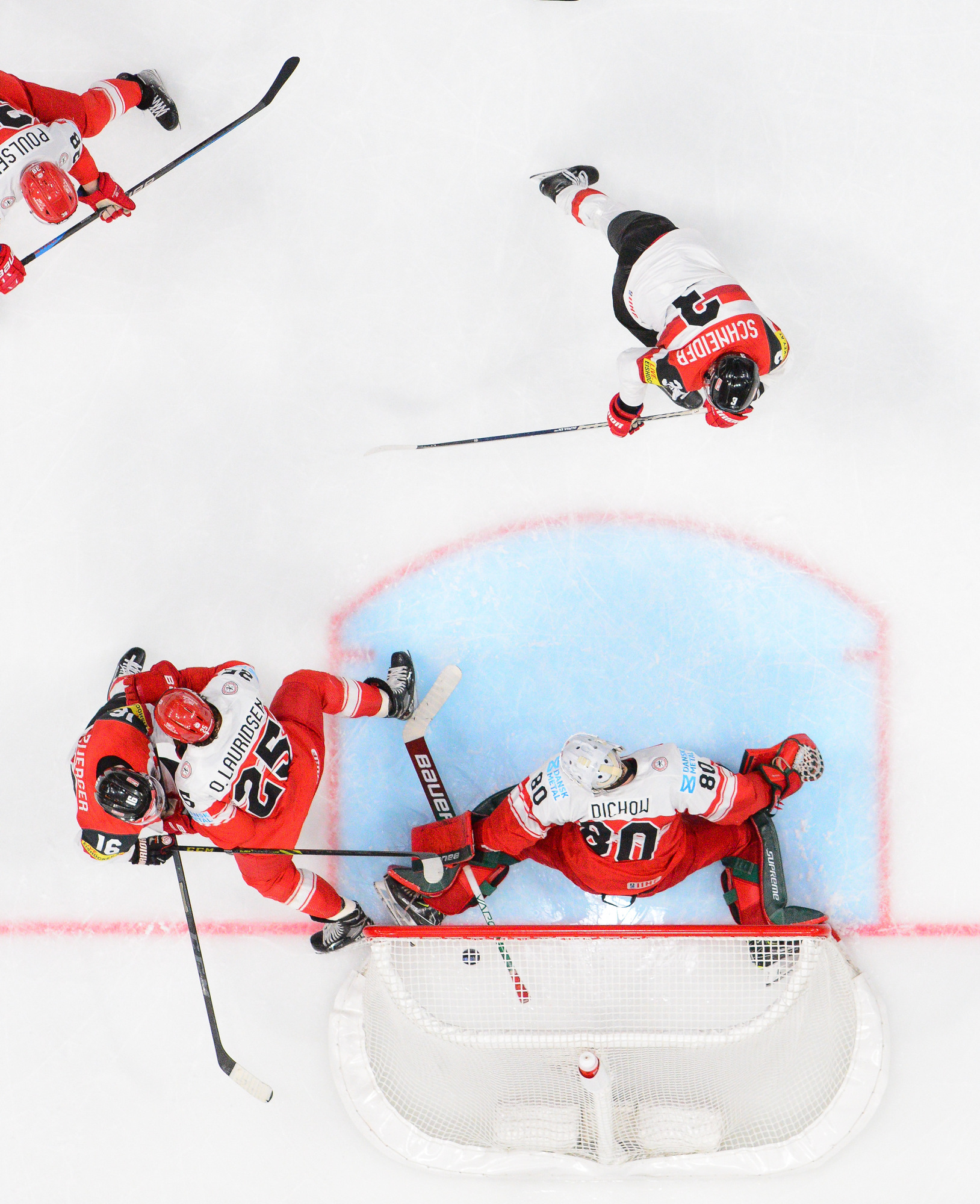 The physicality picked up as the opening stanza wore on, such as when Danish blueliner Anders Krogsgaard ran the 193-cm, 101-kg Austrian forward Paul Huber into the end boards. Austria’s Dominique Heinrich came close to equalizing, rattling a point shot off Dichow’s left post.