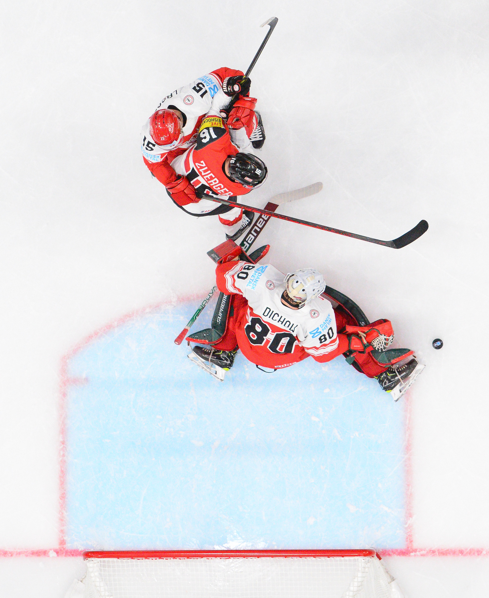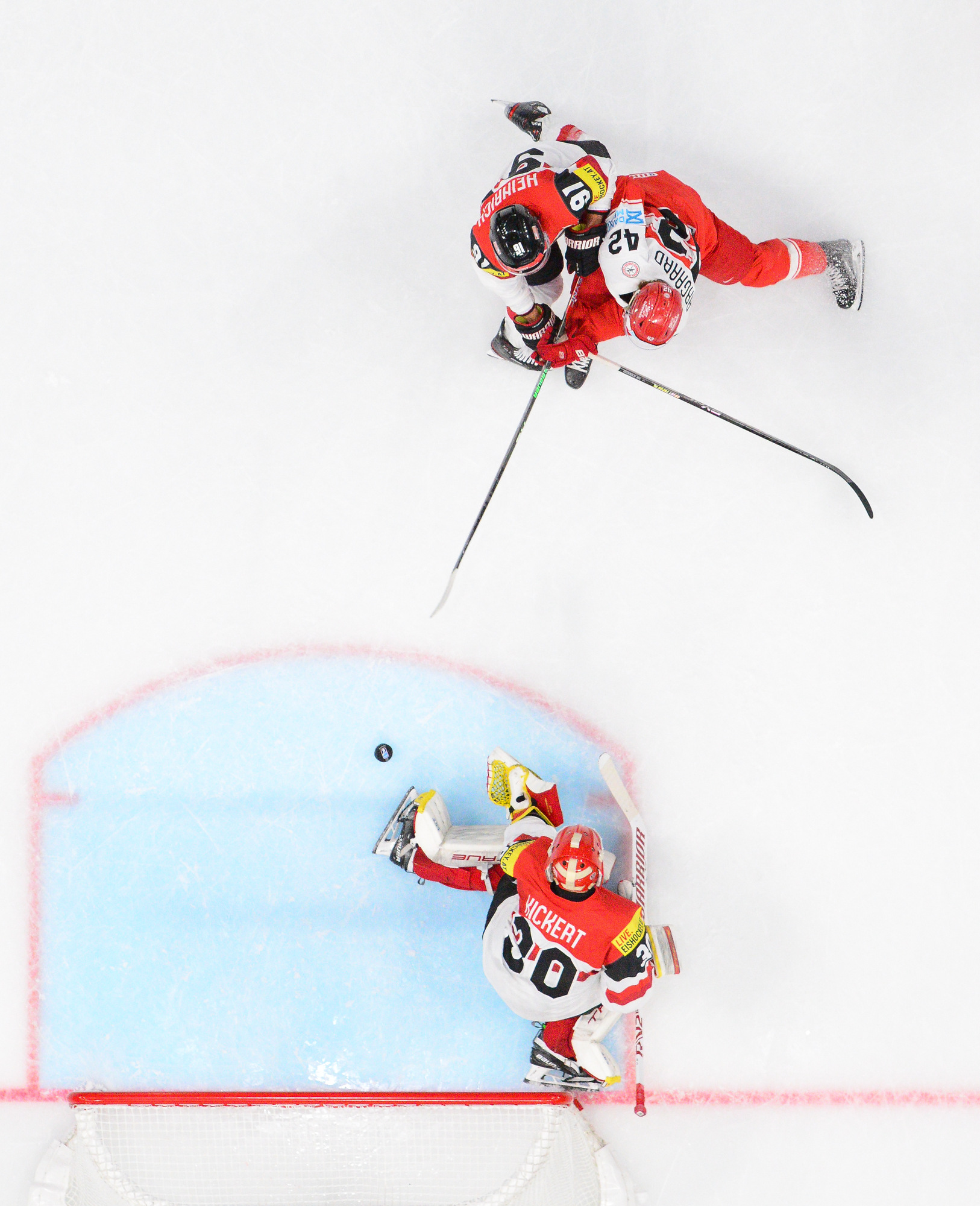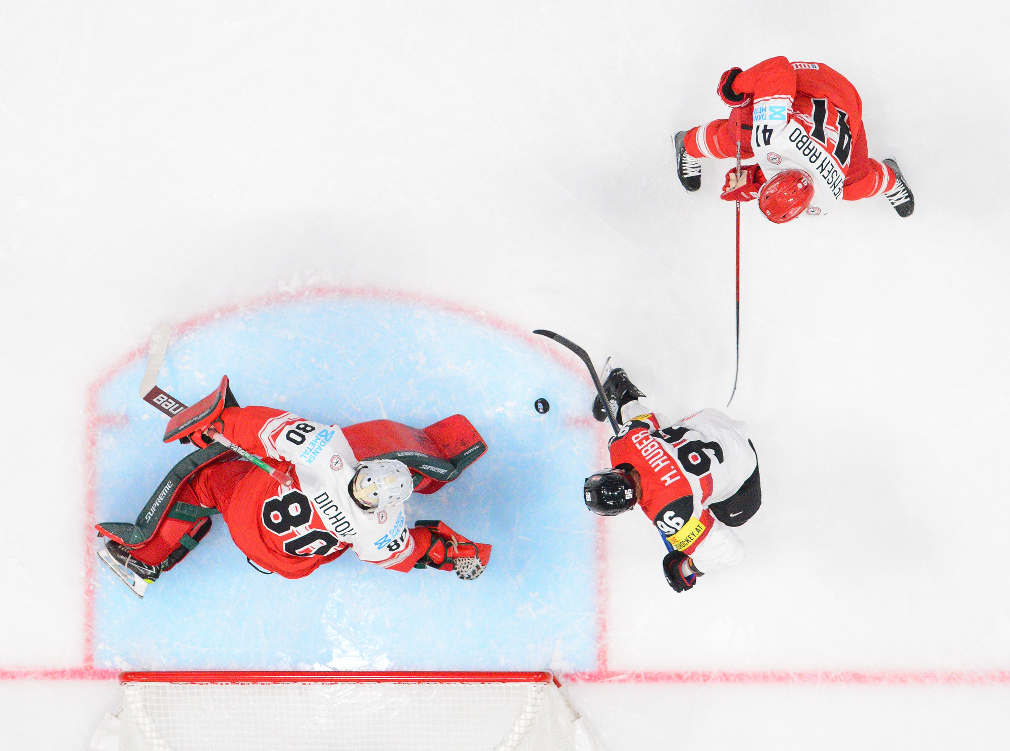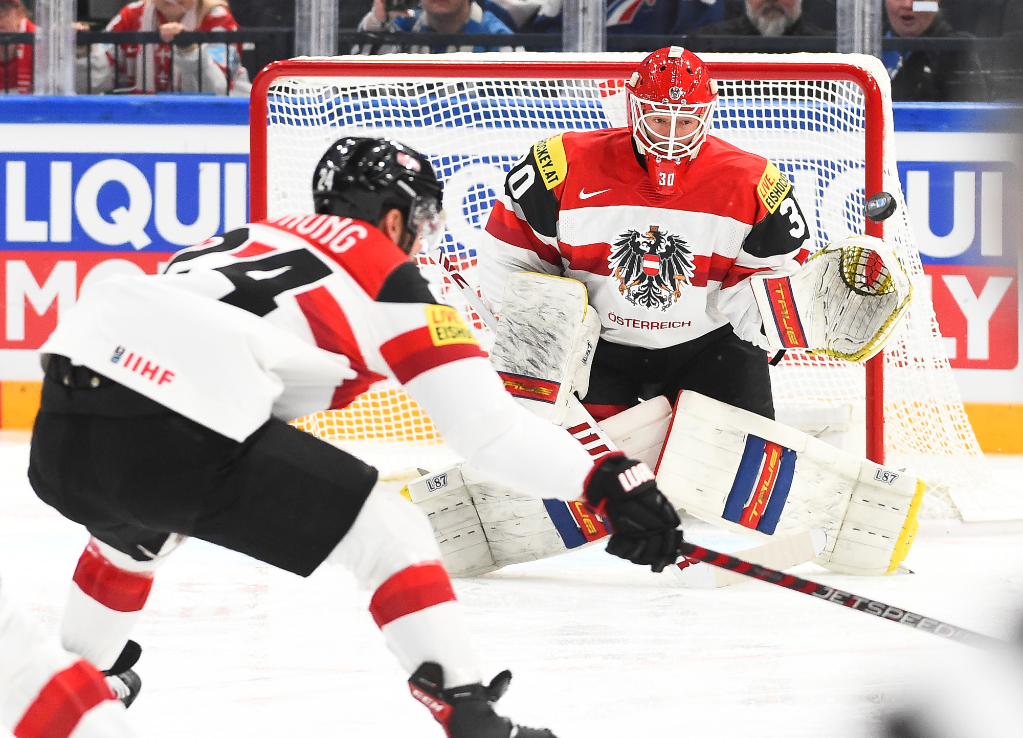 The physicality picked up as the opening stanza wore on, such as when Danish blueliner Anders Krogsgaard ran the 193-cm, 101-kg Austrian forward Paul Huber into the end boards. Austria’s Dominique Heinrich came close to equalizing, rattling a point shot off Dichow’s left post.