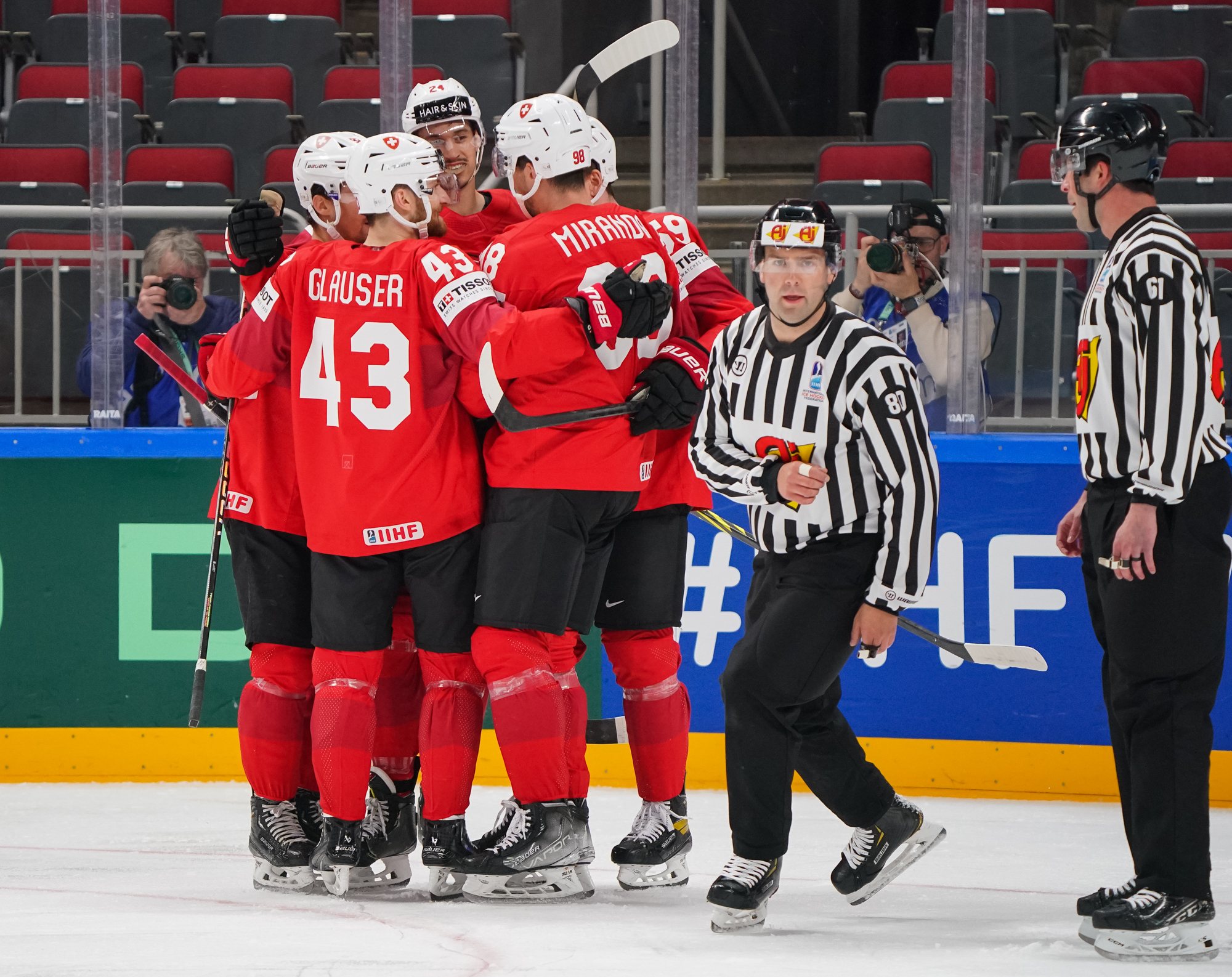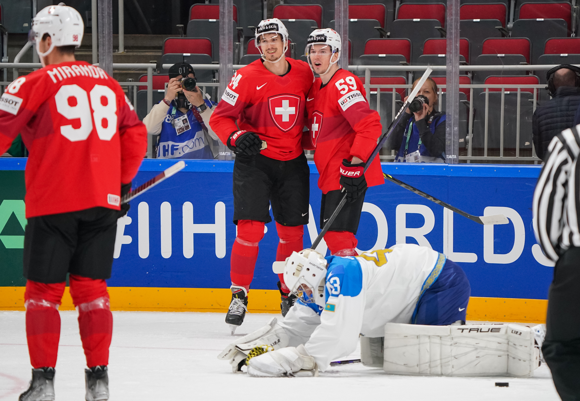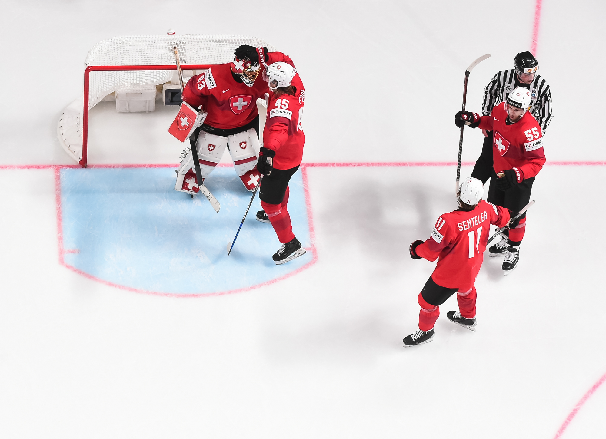 The Swiss added what they thought was a fourth goal off a nice series of passes, but referee Liam Sewell ruled that there was goalie interference when Andrea Glauser's shot entered the net.
