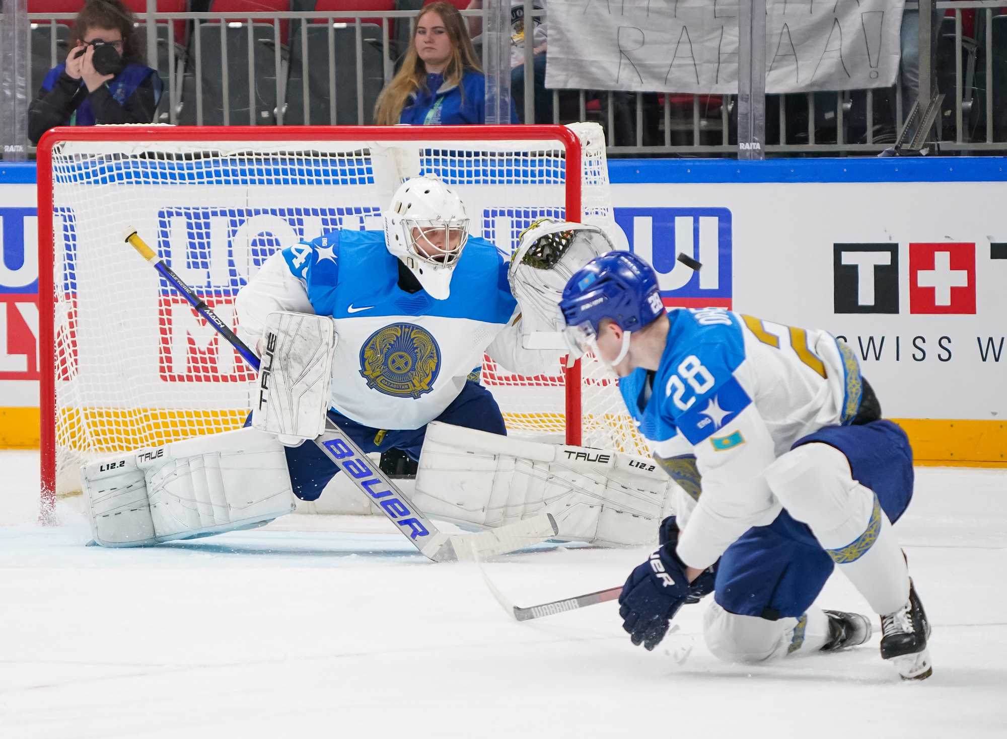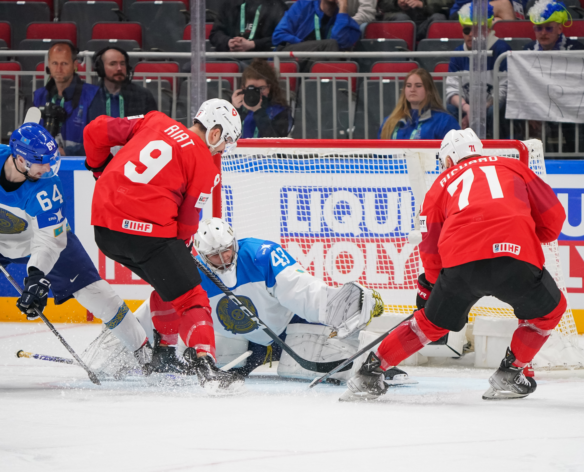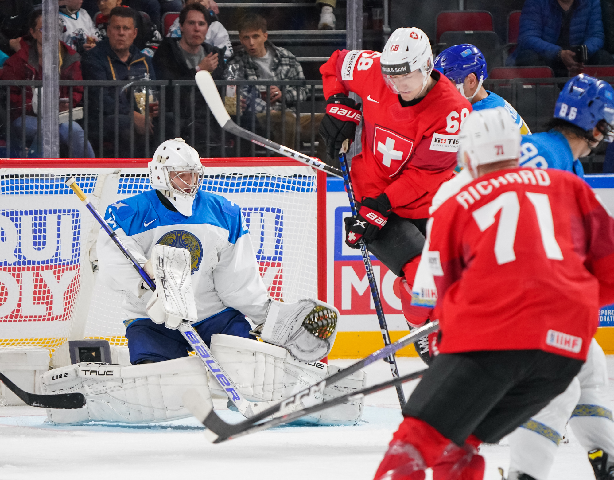 Three minutes later, it was 3-0, and the Swiss were moving the puck with confidence and speed. This time it was a quick steal behind the Kazakh net by Herzog that started the play. Tanner Richard claimed the puck and fired a pass to the slot where Riat snapped a quick shot past Shutov before he knew what had happened.