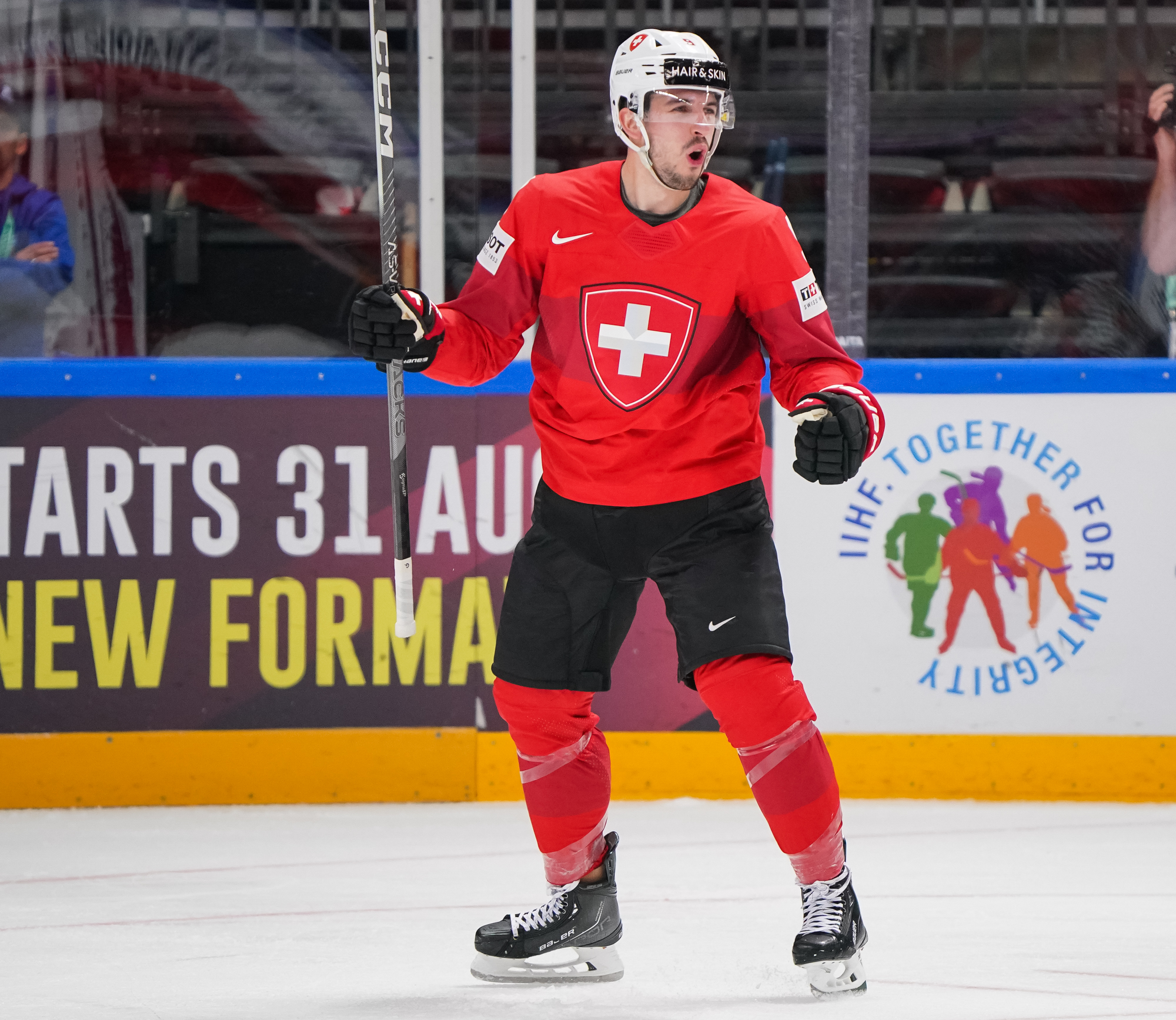 Shutov made a sensational save off a close-in chance from Enzo Corvi soon after the faceoff to start the second, but it was a mere delaying of what was to come. The Swiss made it 2-0 at 7:34 that started with another long shot, this by Michael Fora that was deflected in front by Fabrice Herzog.