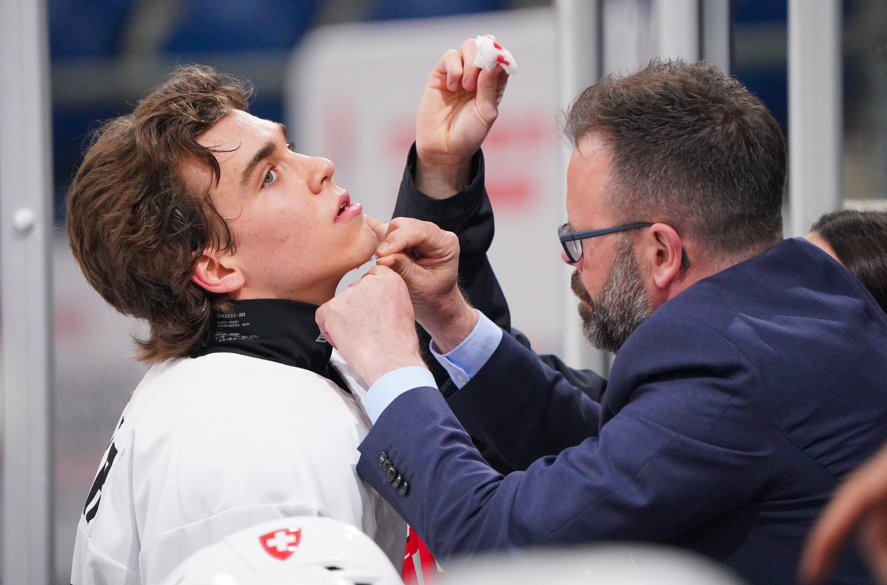 During Finland's 4-2 win over Switzerland at the 2023 U18 Worlds in Basel, Finnish forward Konsta Helenius confronts Swiss goalie Ewan Huet.