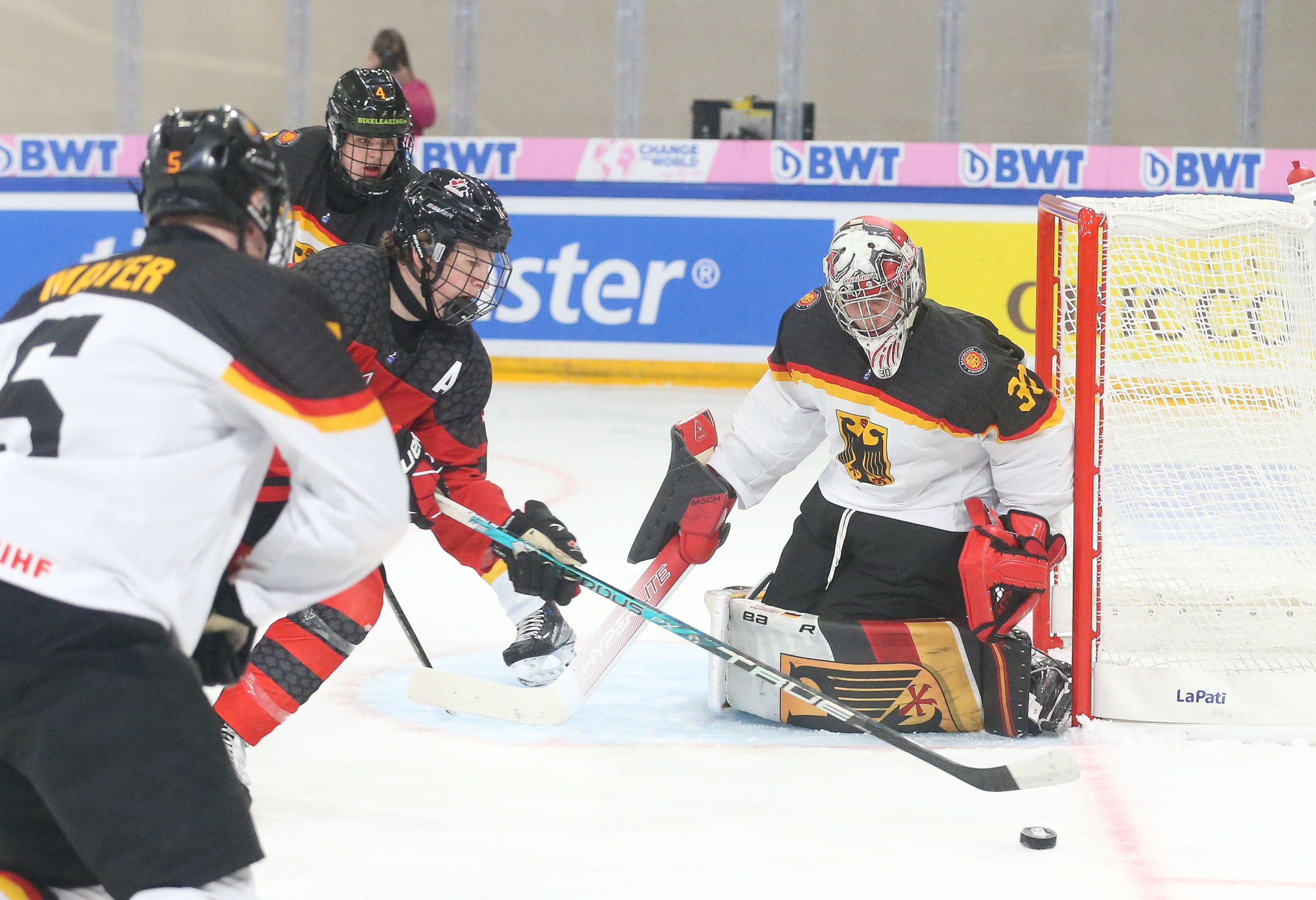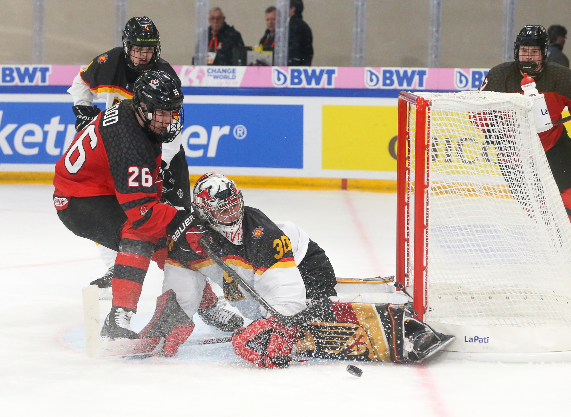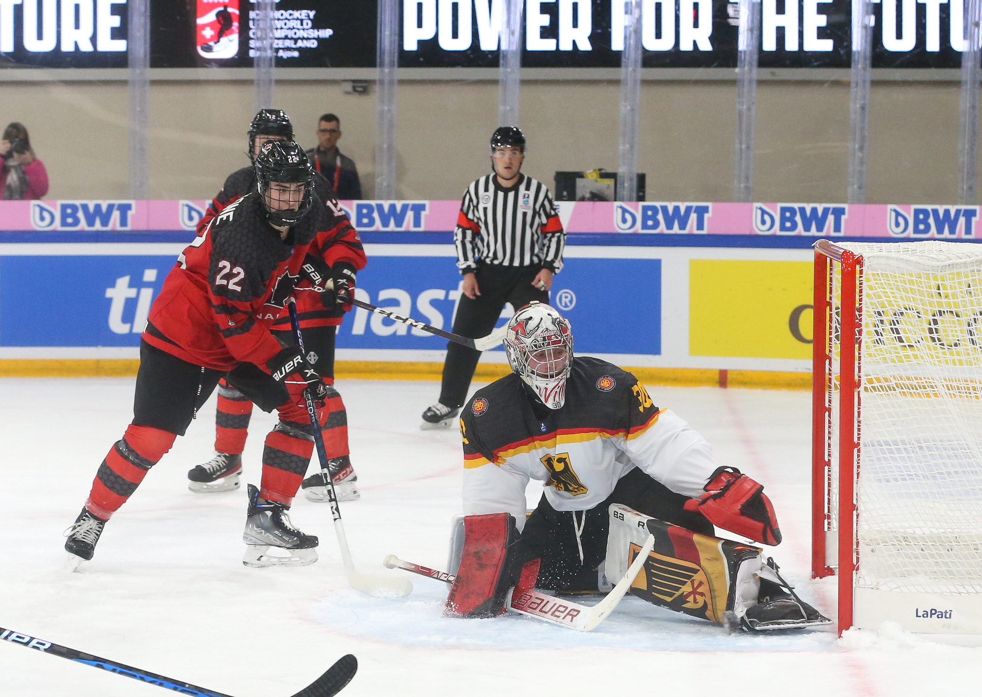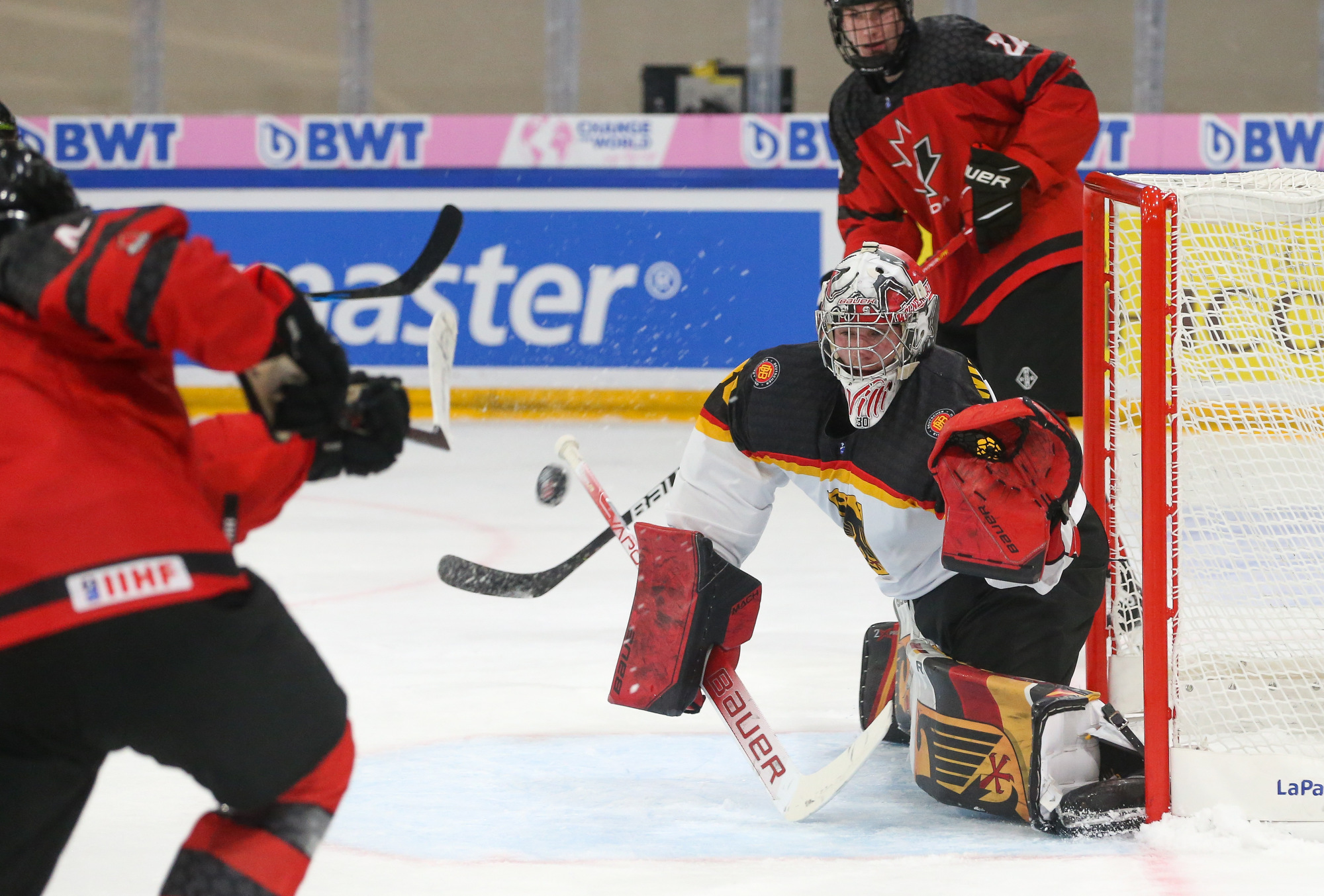 Jeff Truite’s team came into Friday’s action with a point to prove after Thursday’s heavy loss against Sweden, and the Canadians grabbed the initiative from the first seconds. Germany took a penalty in the first minute and spent the opening stages fighting fires in front of Leon Willerscheid’s net. By the midpoint of the first period, the shot count was 10-0 for Canada, while Calum Ritchie could add an effort off the piping to that tally. There was brief respite for Germany when Tristan Bertucci took Canada’s first penalty of the day, but the game was largely one-way traffic.