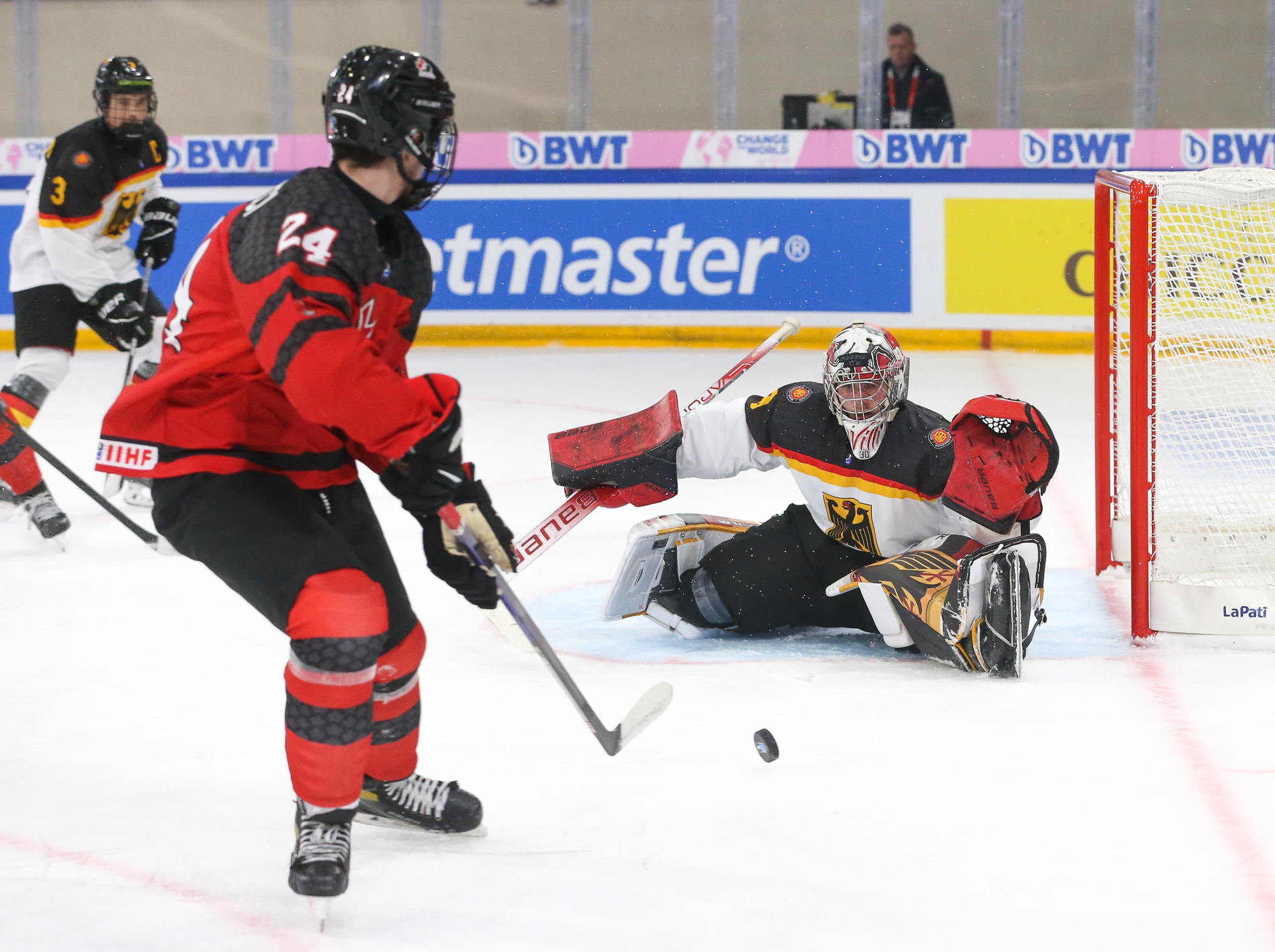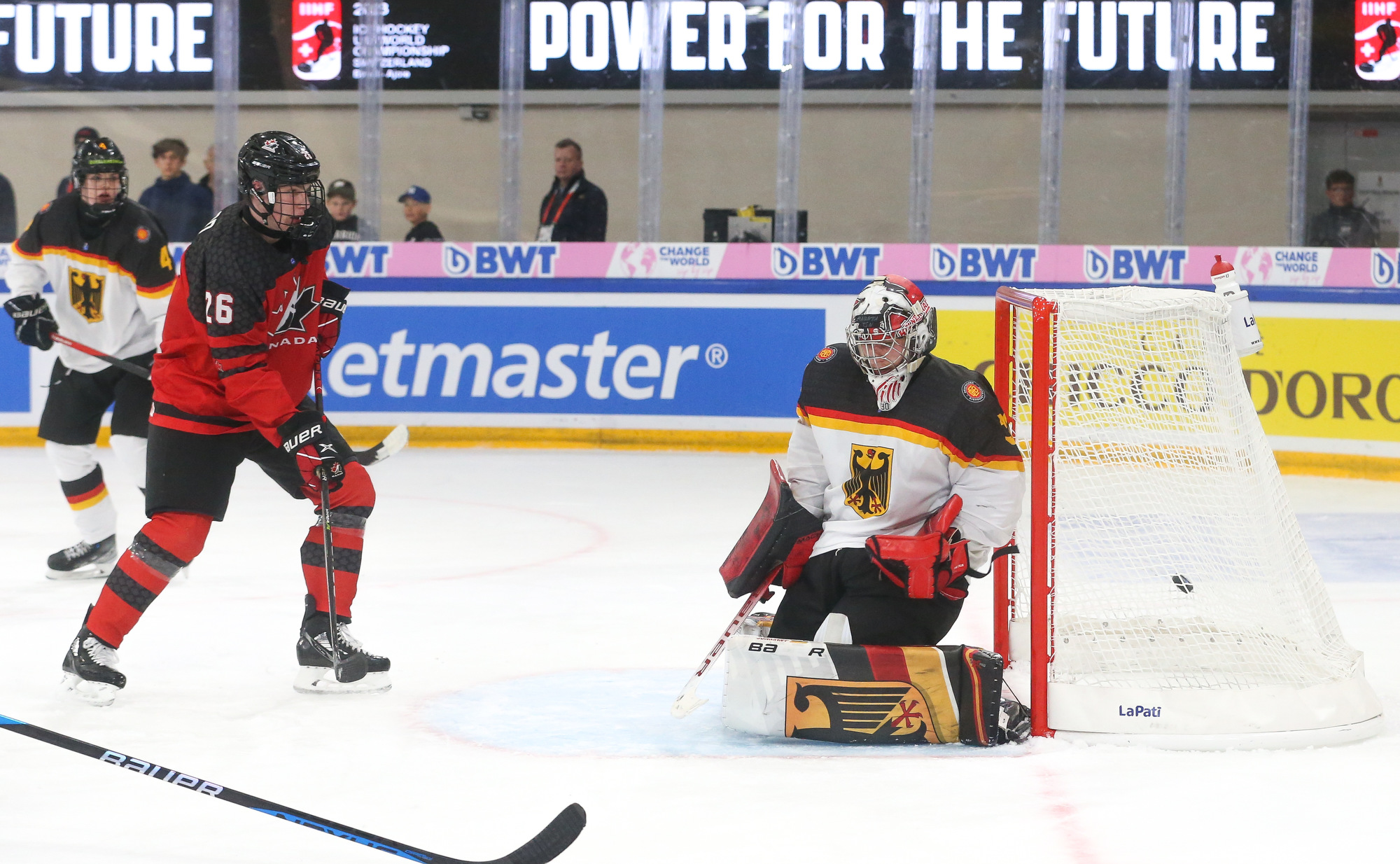 Early in the third, Willerscheid stopped a penalty shot from Colby Barlow as the pressure on the German net continued. The German goalie, who was part of the 2022 roster but did not get on the ice in Bavaria, finished the day with more than 40 saves – a creditable performance despite the lopsided scoreline. However, he could do little when Calum Ritchie followed up to convert a rebound from Macklin Celebrini’s shot.