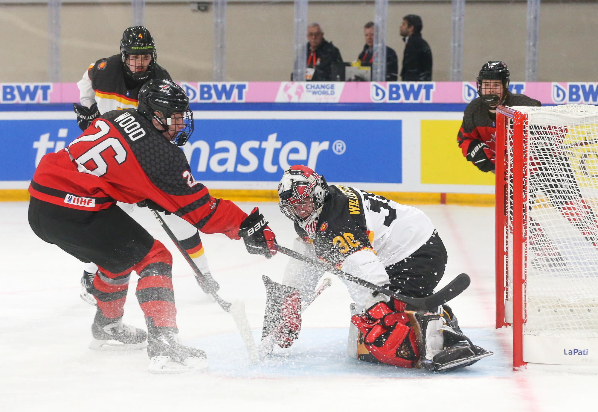 Germany’s resistance was broken by two quick power play goals after Lua Niehus took a major penalty for an illegal hit to the head or neck in the 15th minute. Just 23 seconds later, Canada got the lead when Nick Lardis arrived in space at the foot of the right-hand circle to convert Porter Martone’s feed. Then Wood looked to get the puck to the slot, only for it to come back to him from Andrew Cristall. The finish from the doorstep was emphatic and Germany faced a long road back.