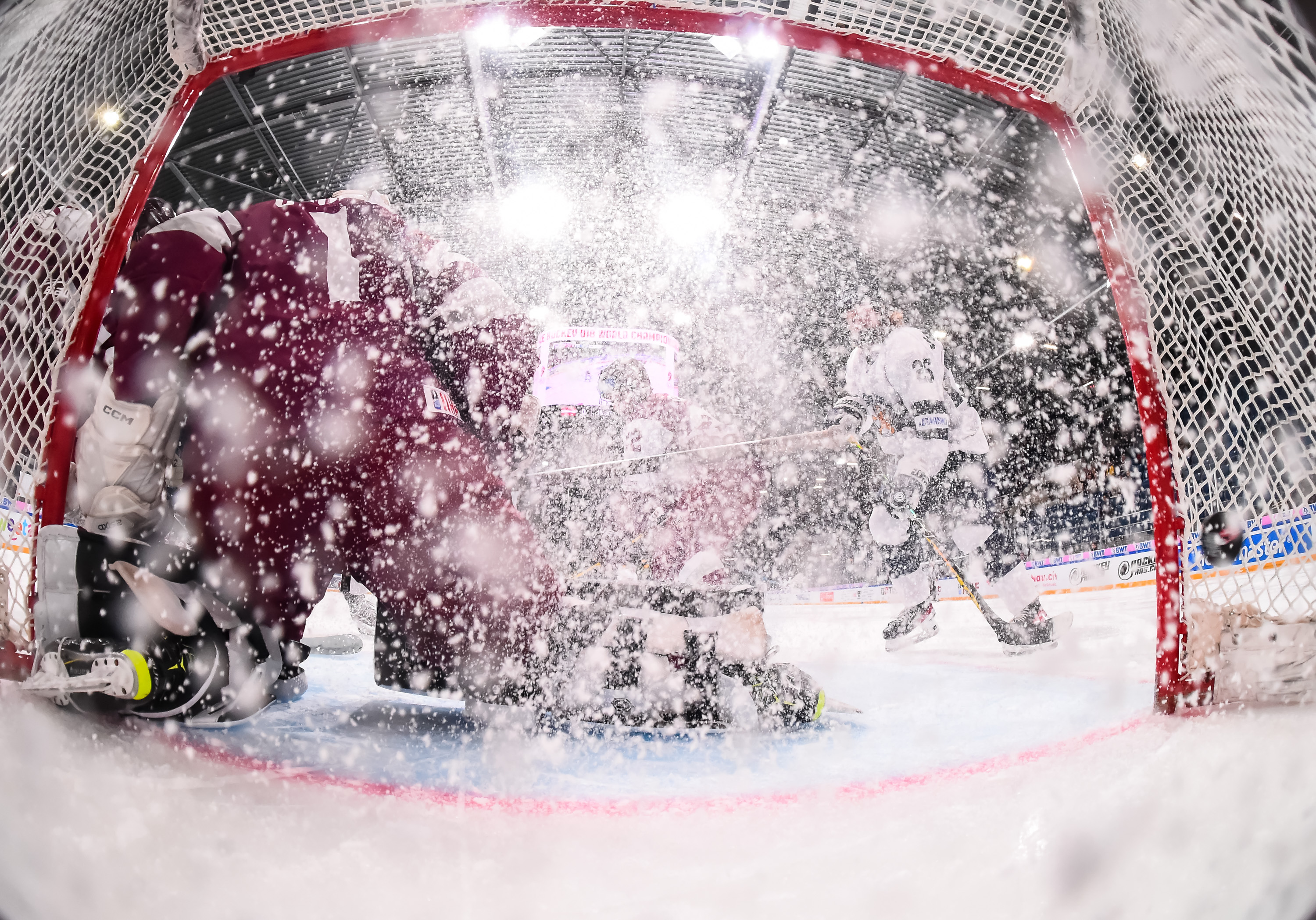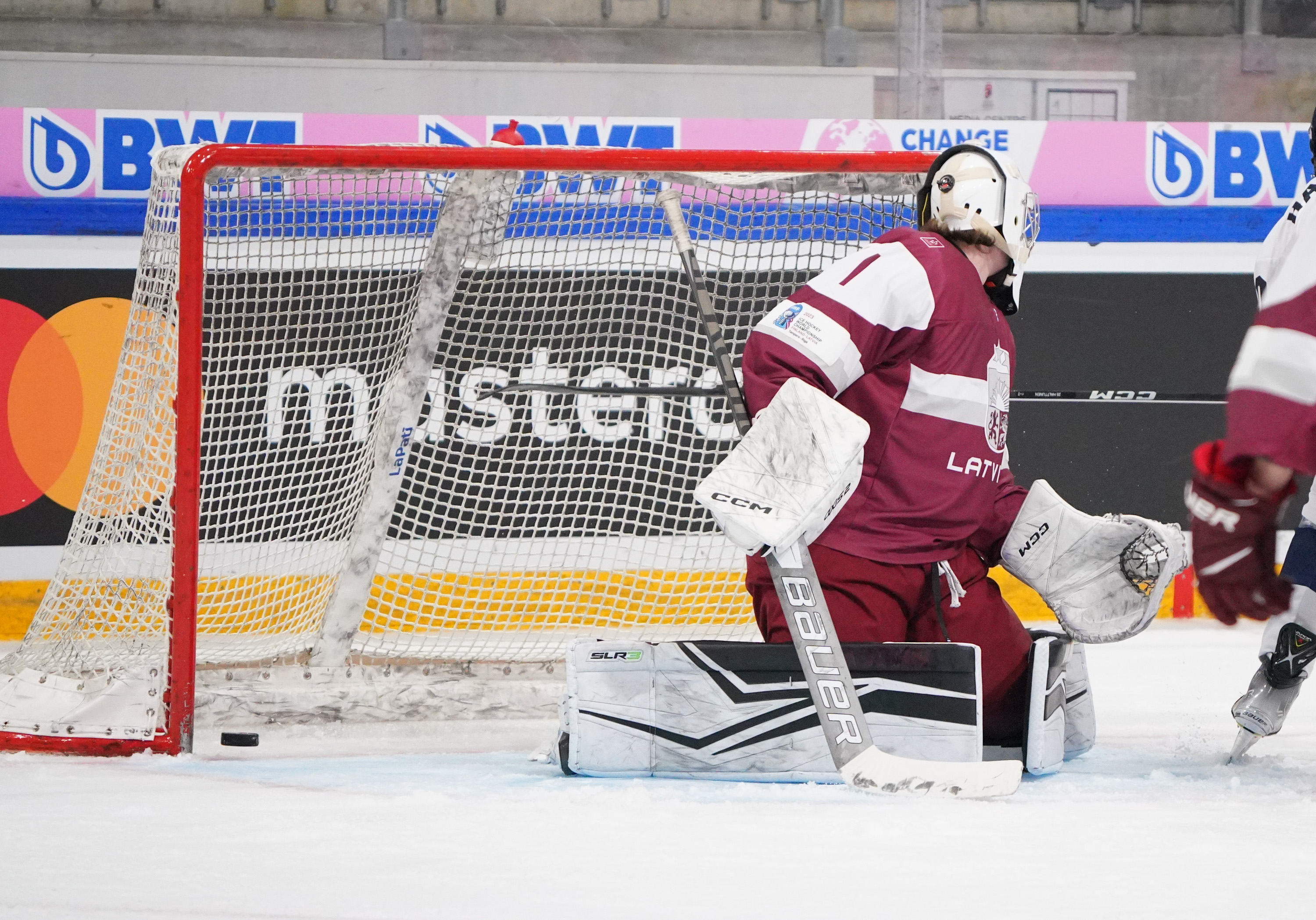 Latvian goalie Aksels Ozols, who also played the first two periods in the 7-1 loss to the Americans, did his best under fire.