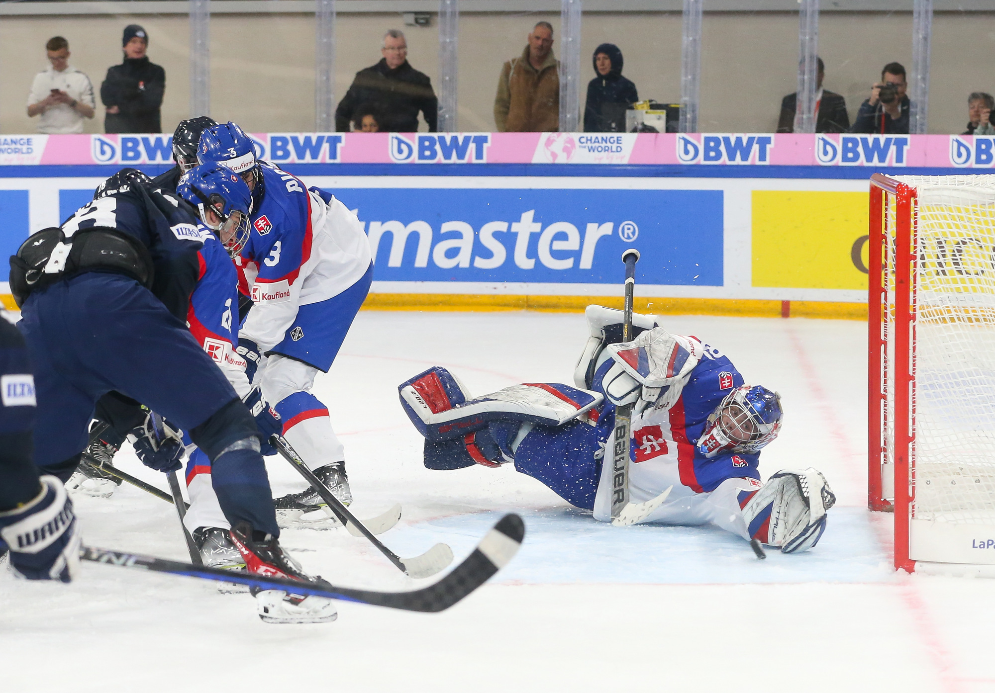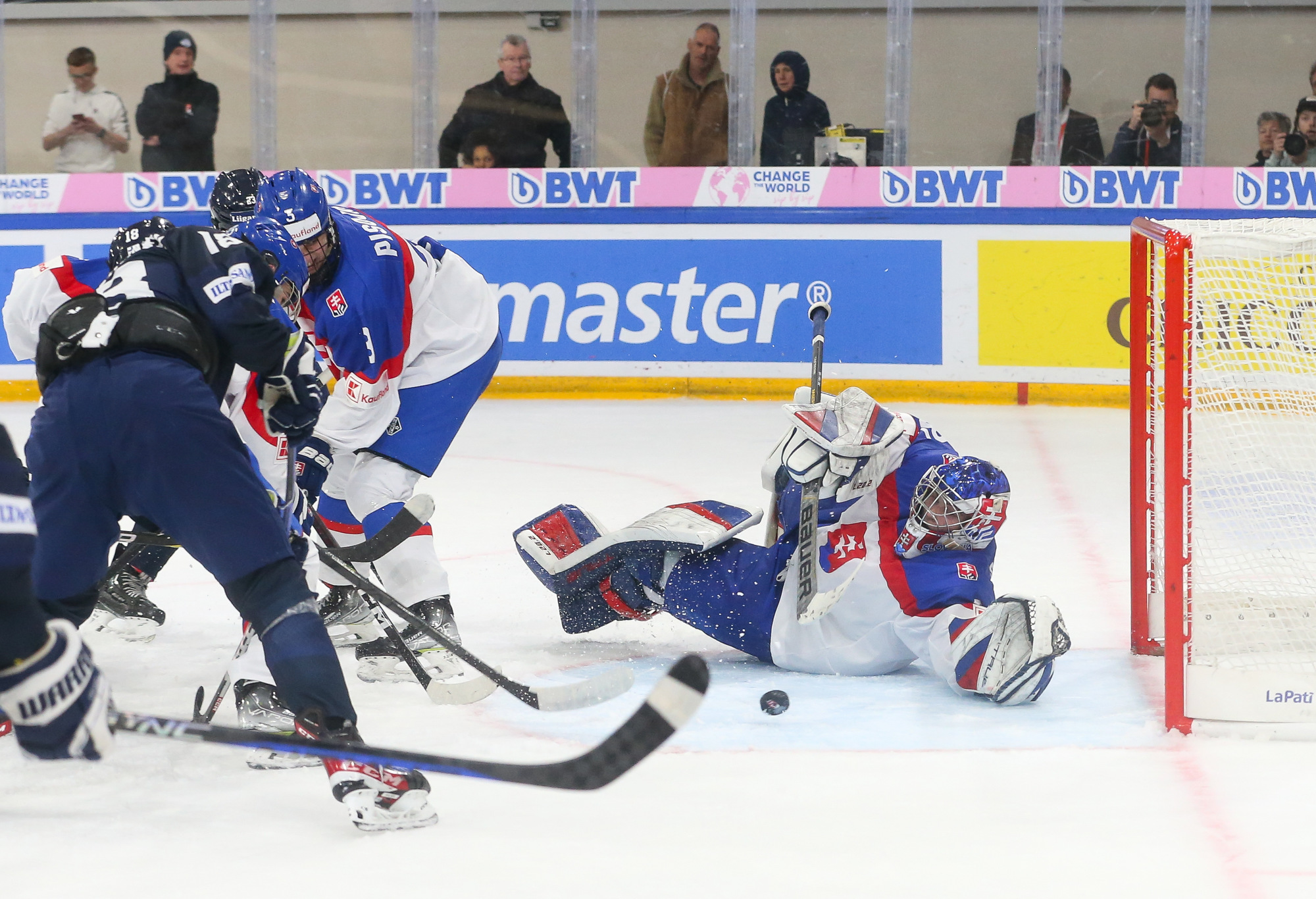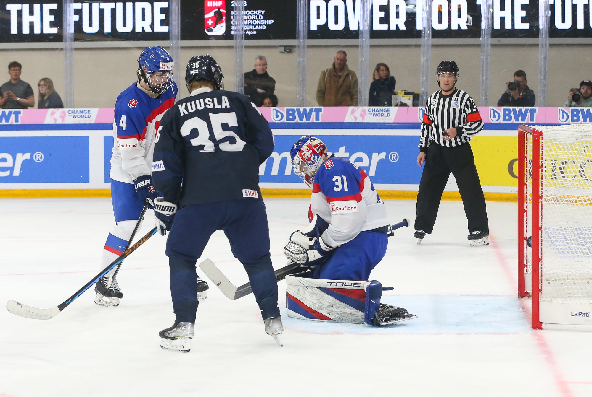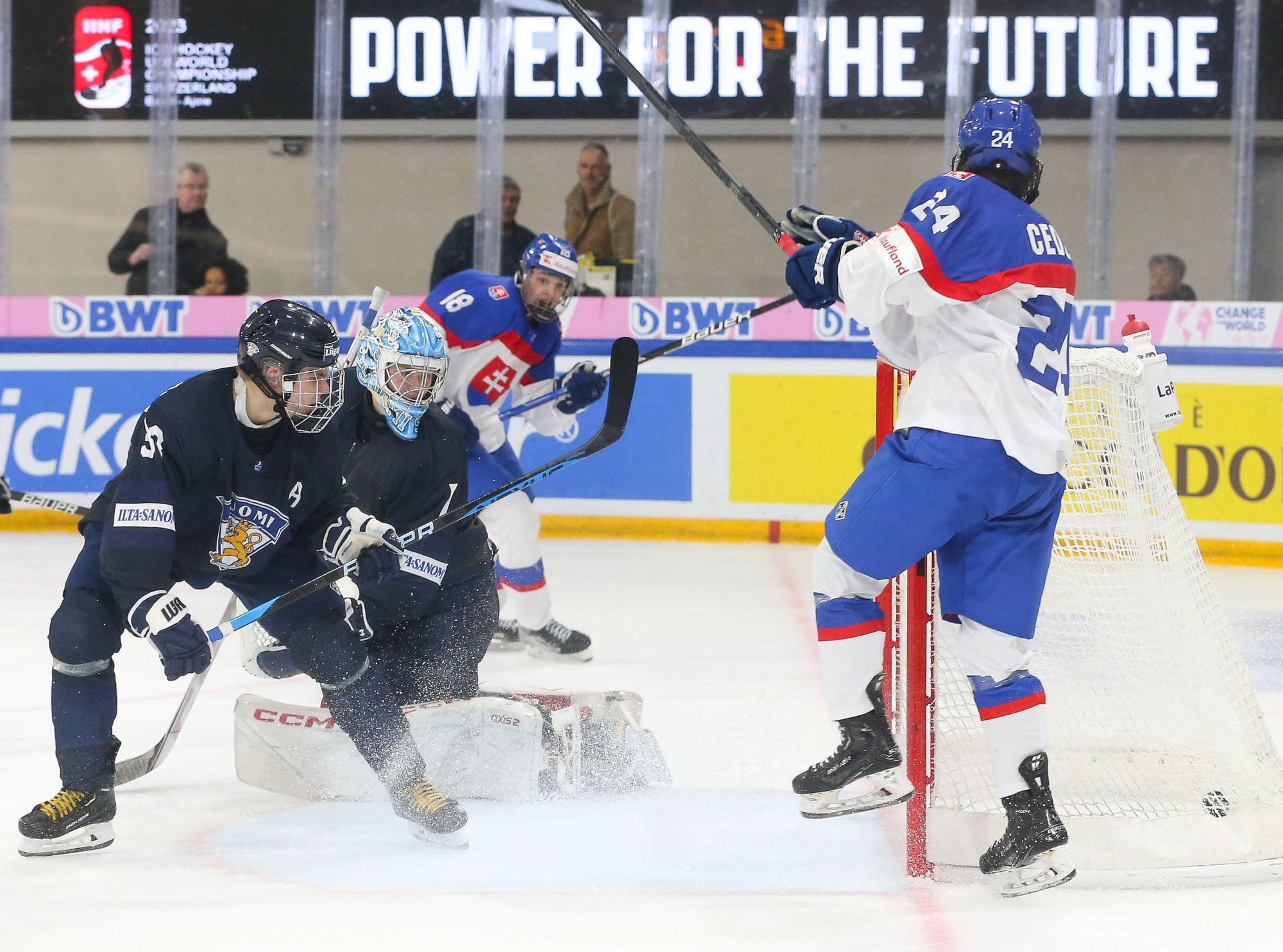 The first quarter-final to be played in Ajoie was set up for drama – and got it from the first minute. Slovakia, very much the outsider again a Finland team looking to improve on last year’s bronze medal, stunned everyone with a goal after just 36 seconds. Eperjesi fired in a shot that flashed off the post and Dalibor Dvorsky was never going to miss an uncontested rebound into a wide-open net.