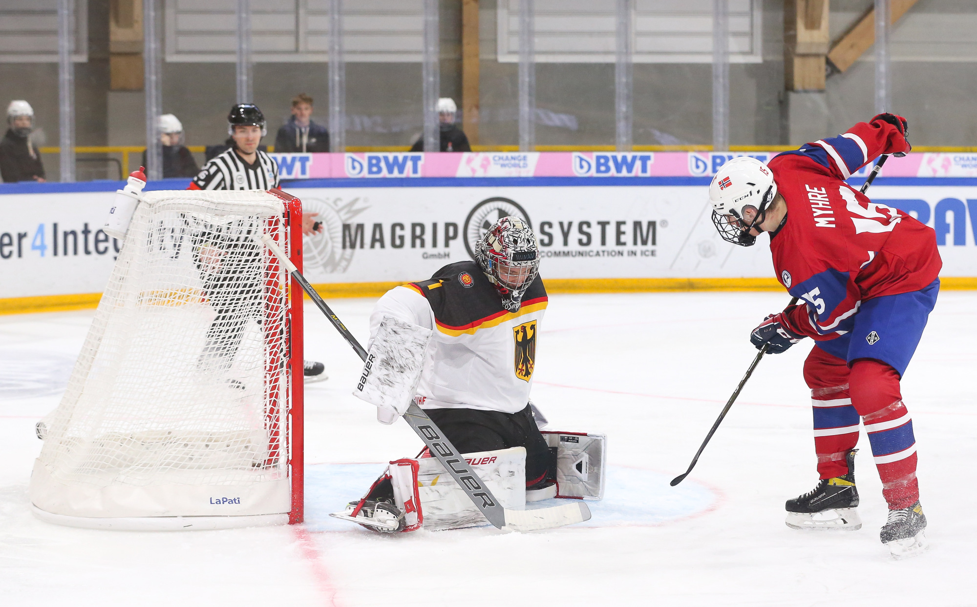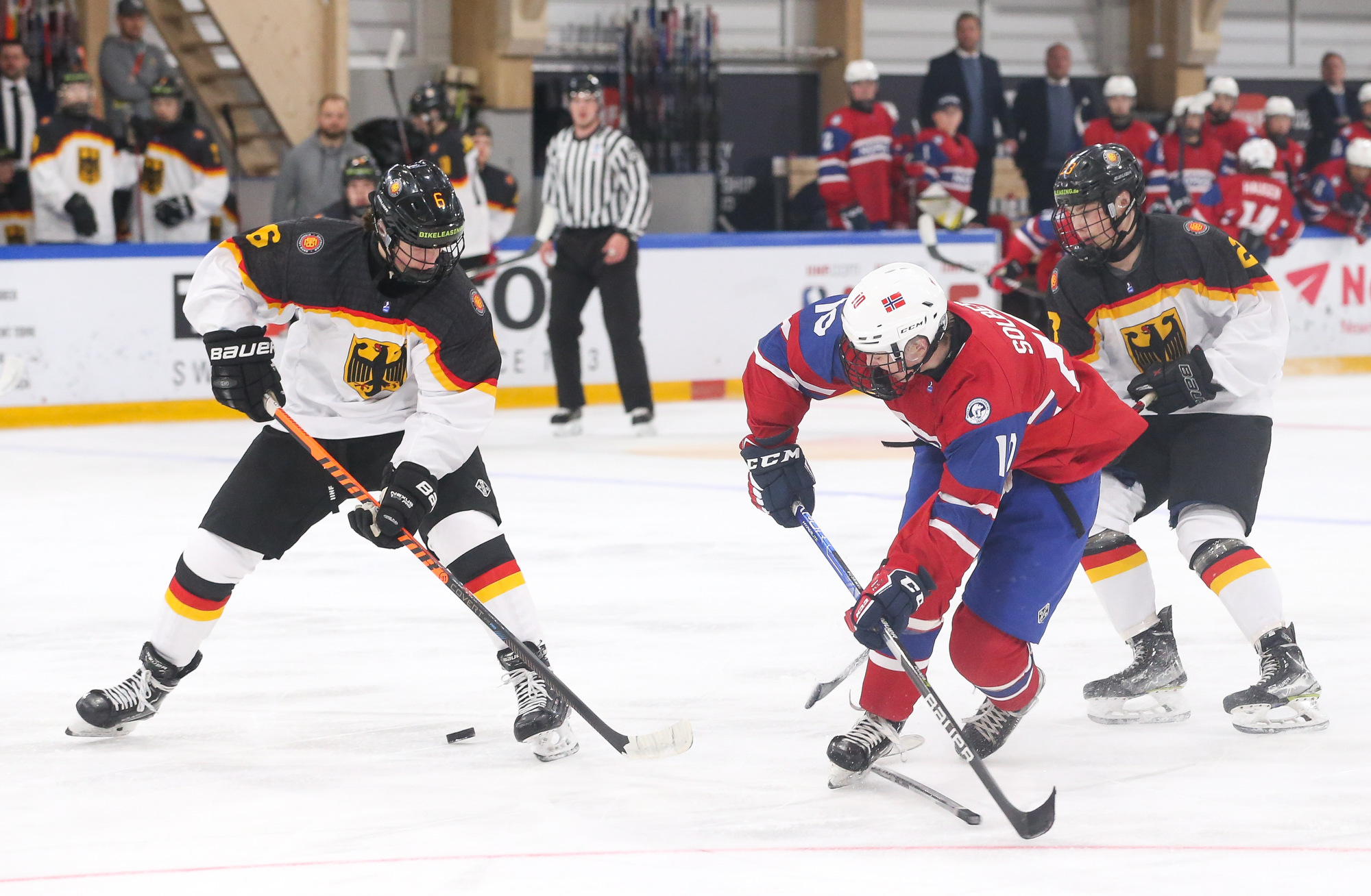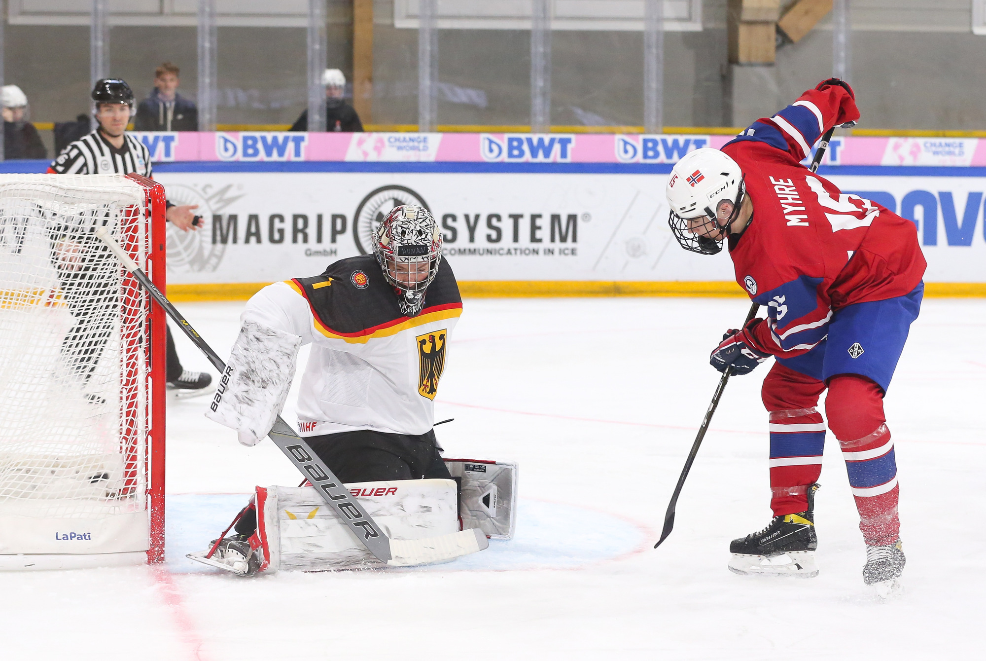In the second period, Philip Hagen's rising centre-point wrister gave Norway a 2-1 lead with the man advantage at 5:26. With traffic in front, the puck eluded German netminder Nico Pertuch high to the stick side.