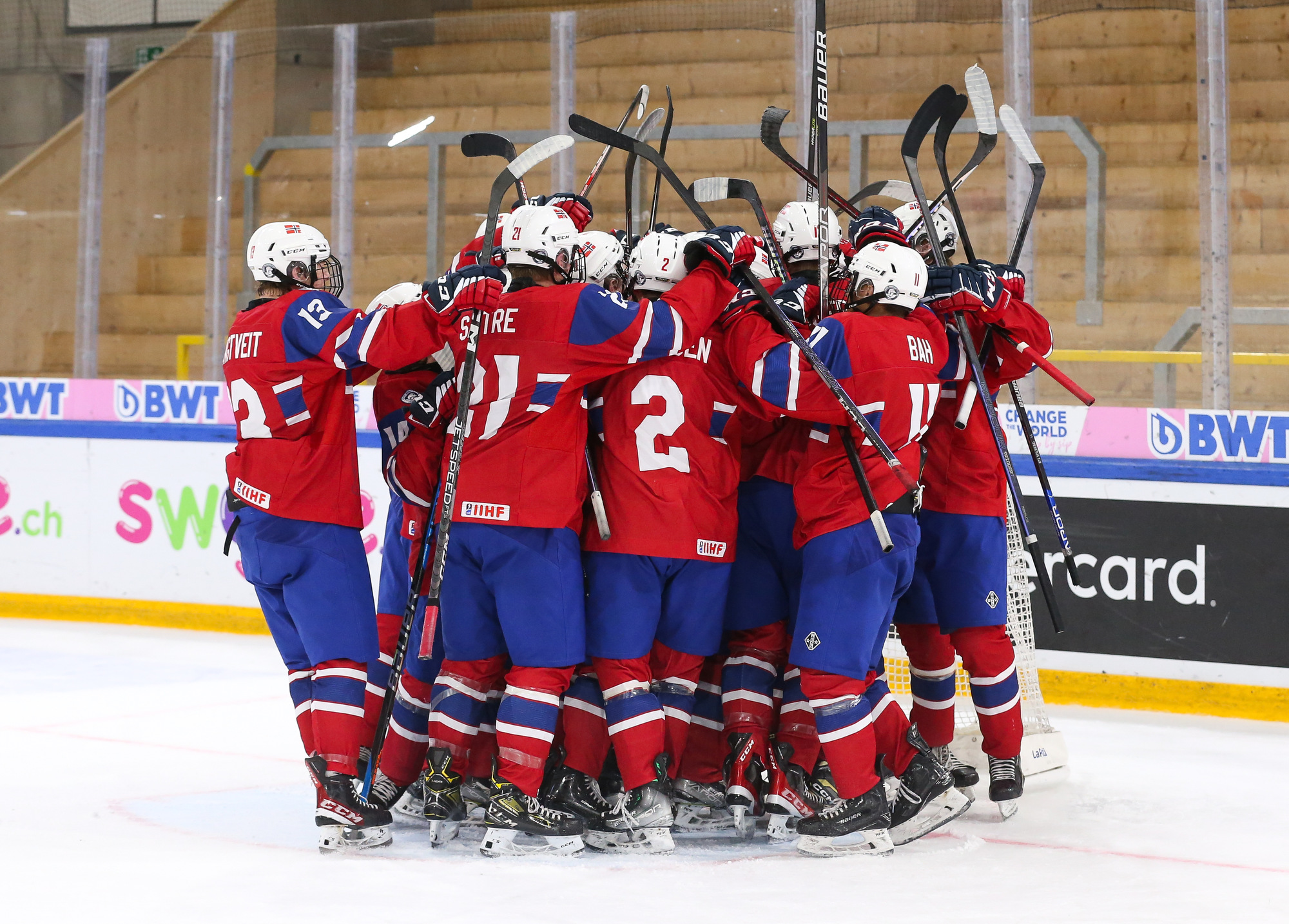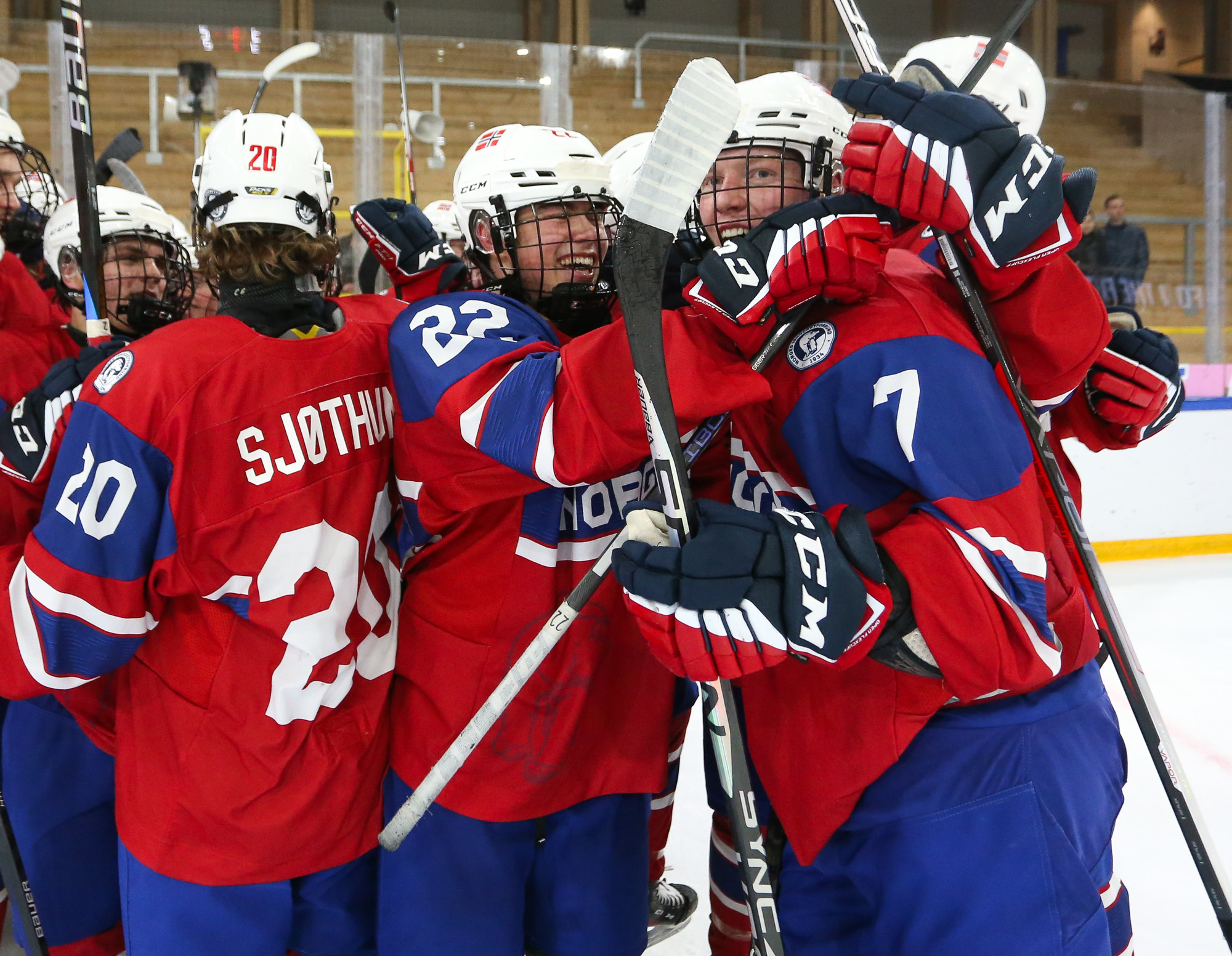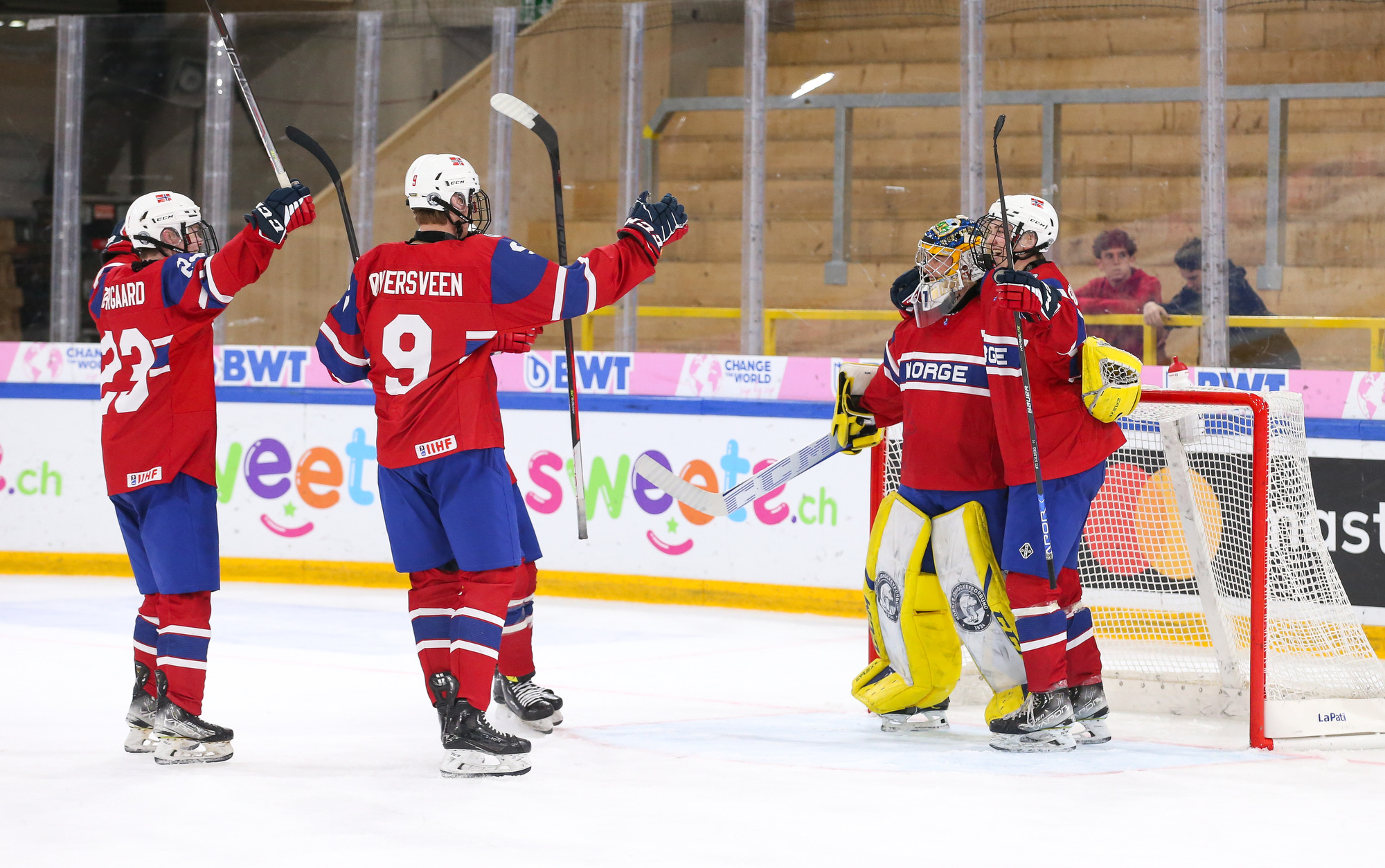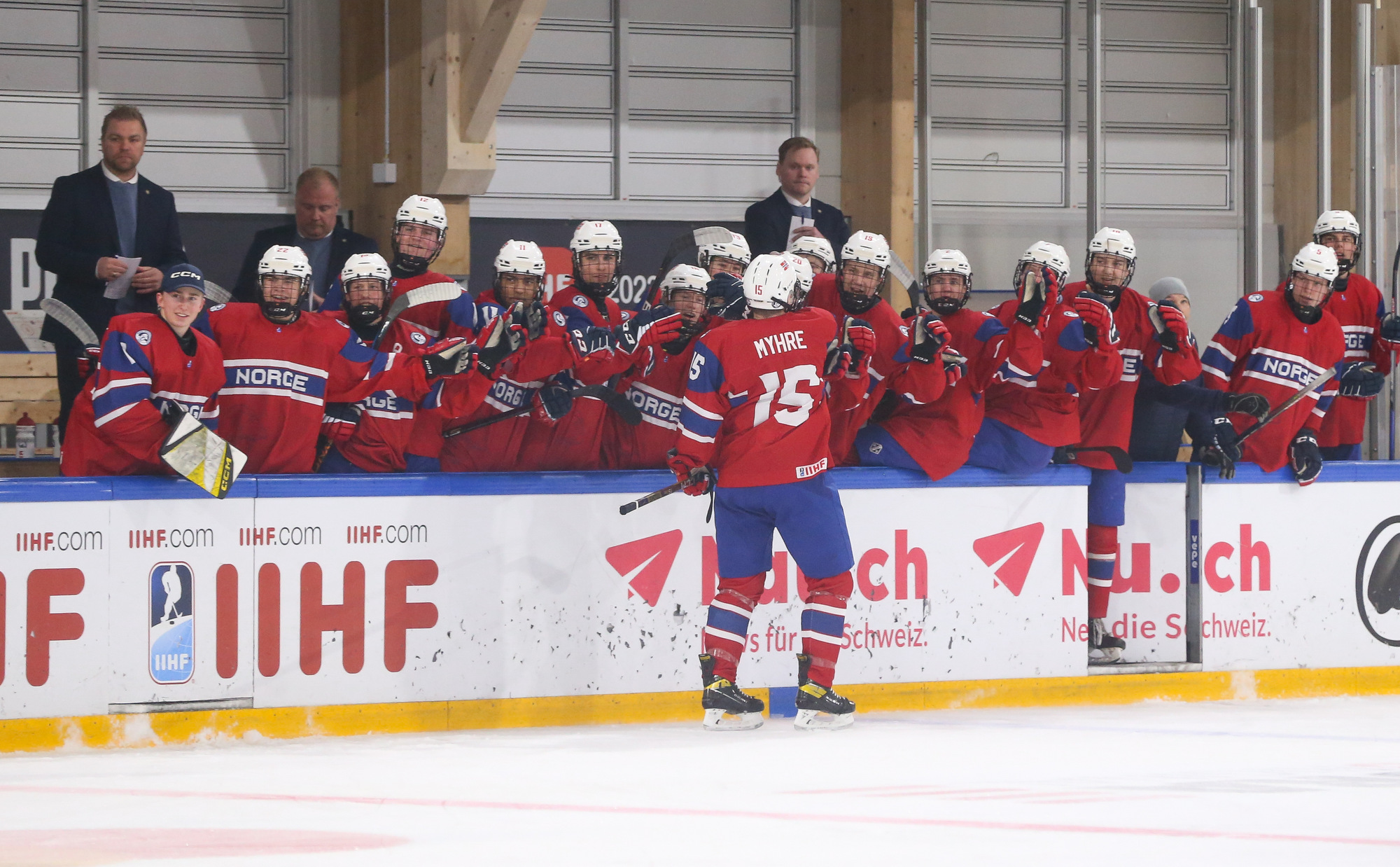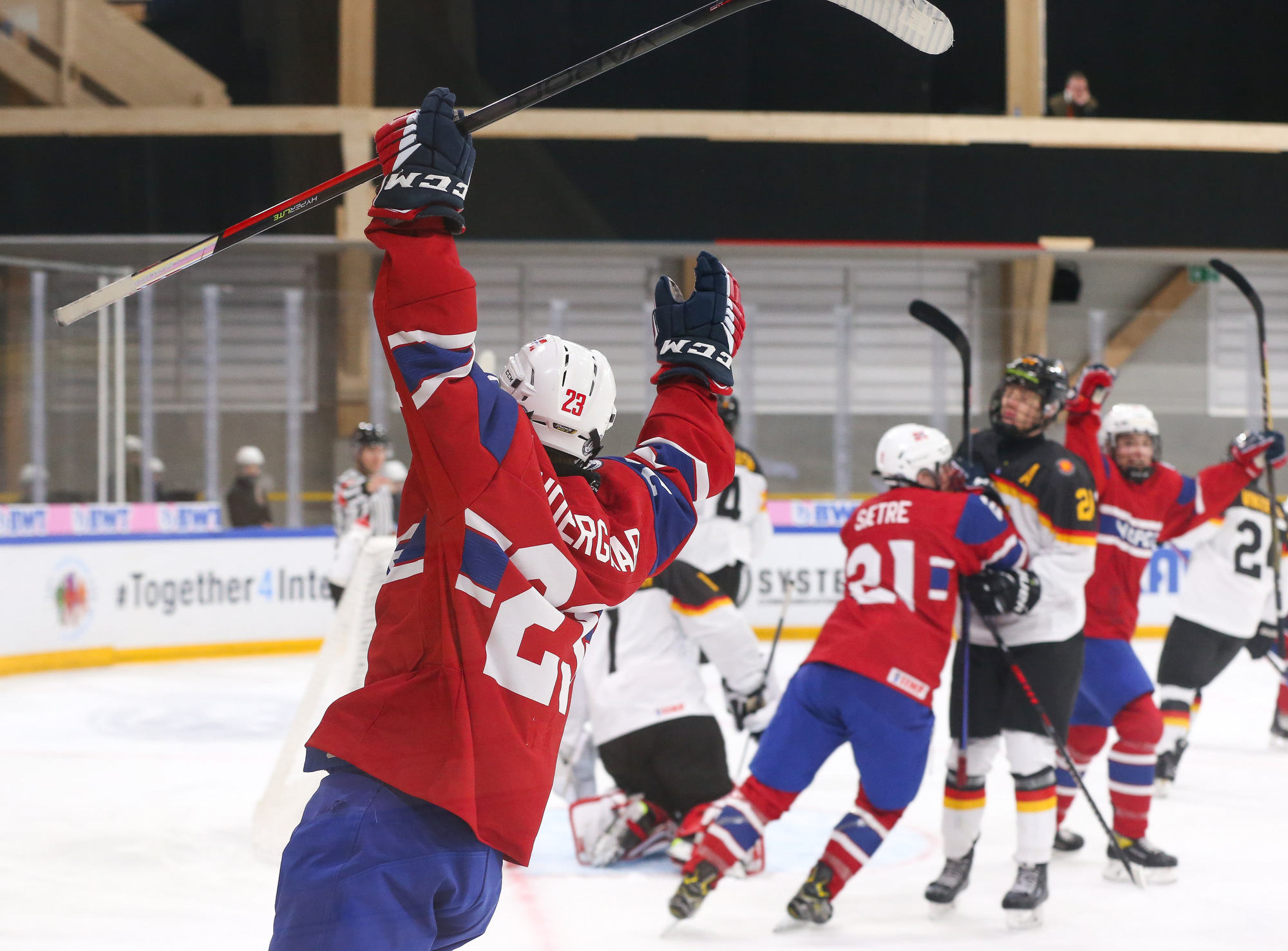 Norway celebrates after Jorgen Myhre's (#15) first-period goal in the deciding 3-2 victory over Germany in relegation play at the 2023 U18 Worlds