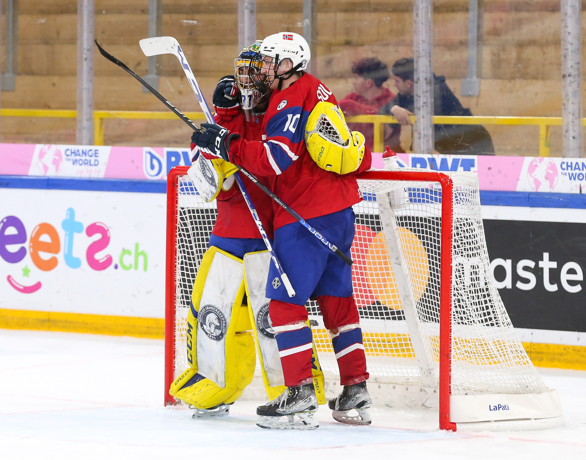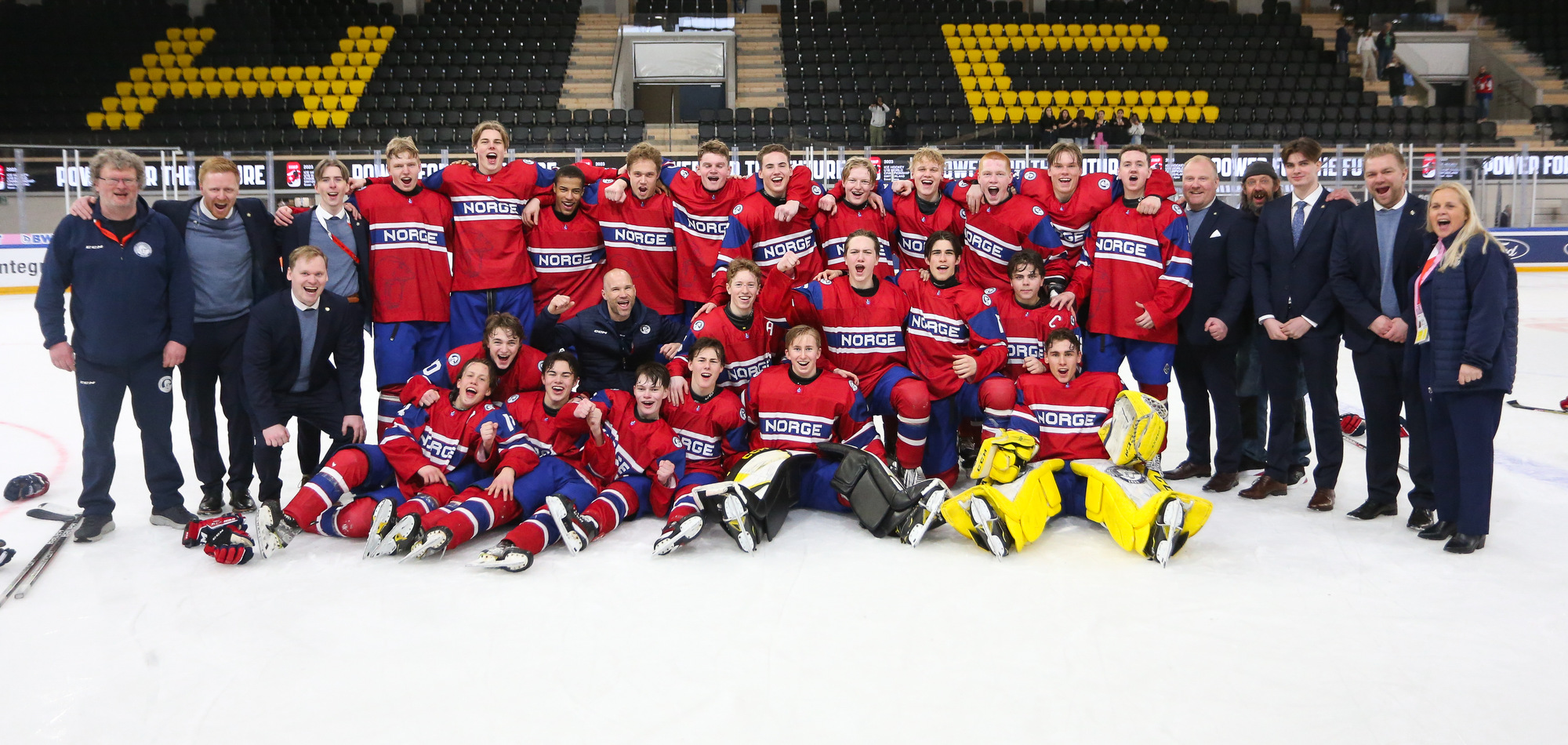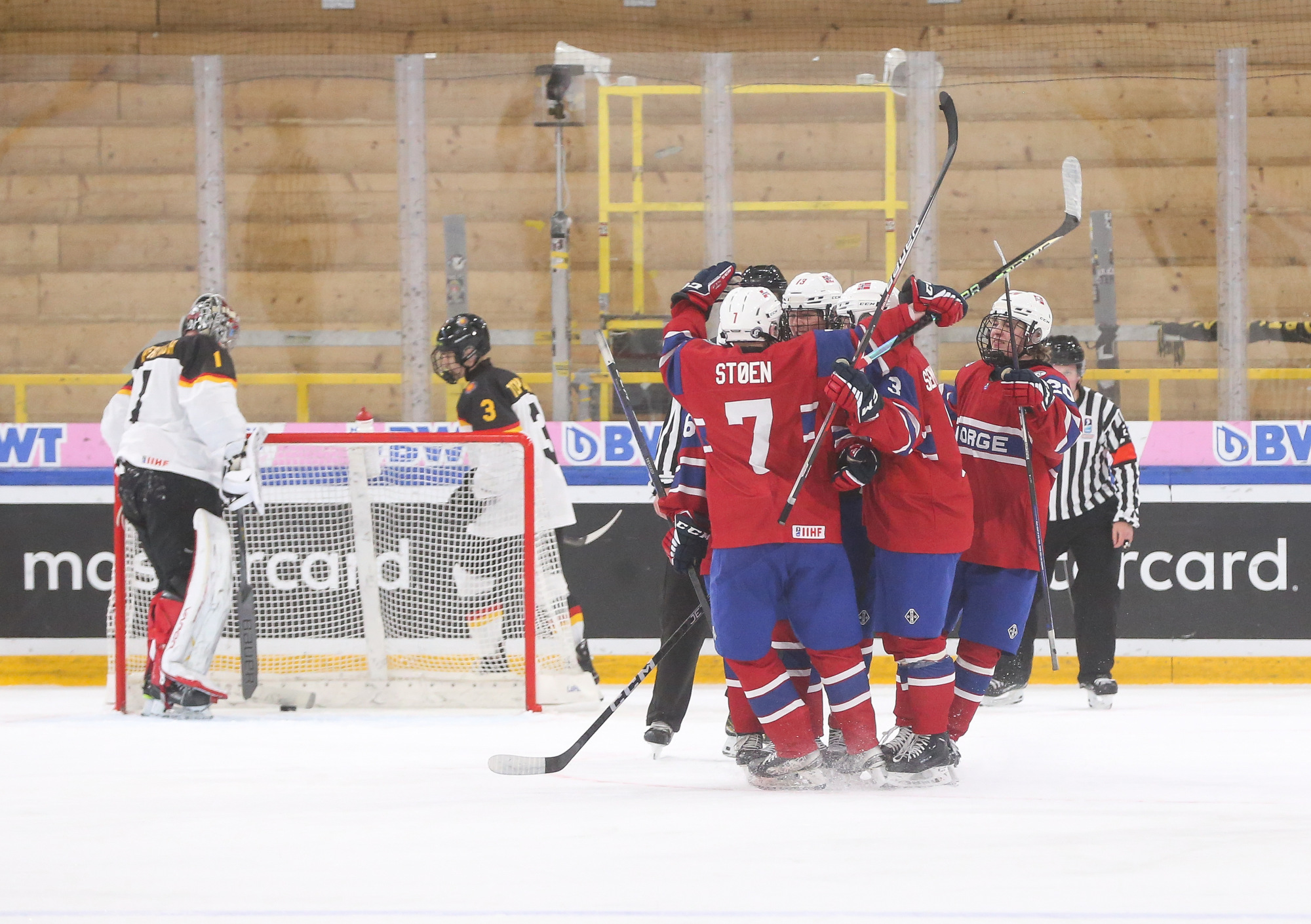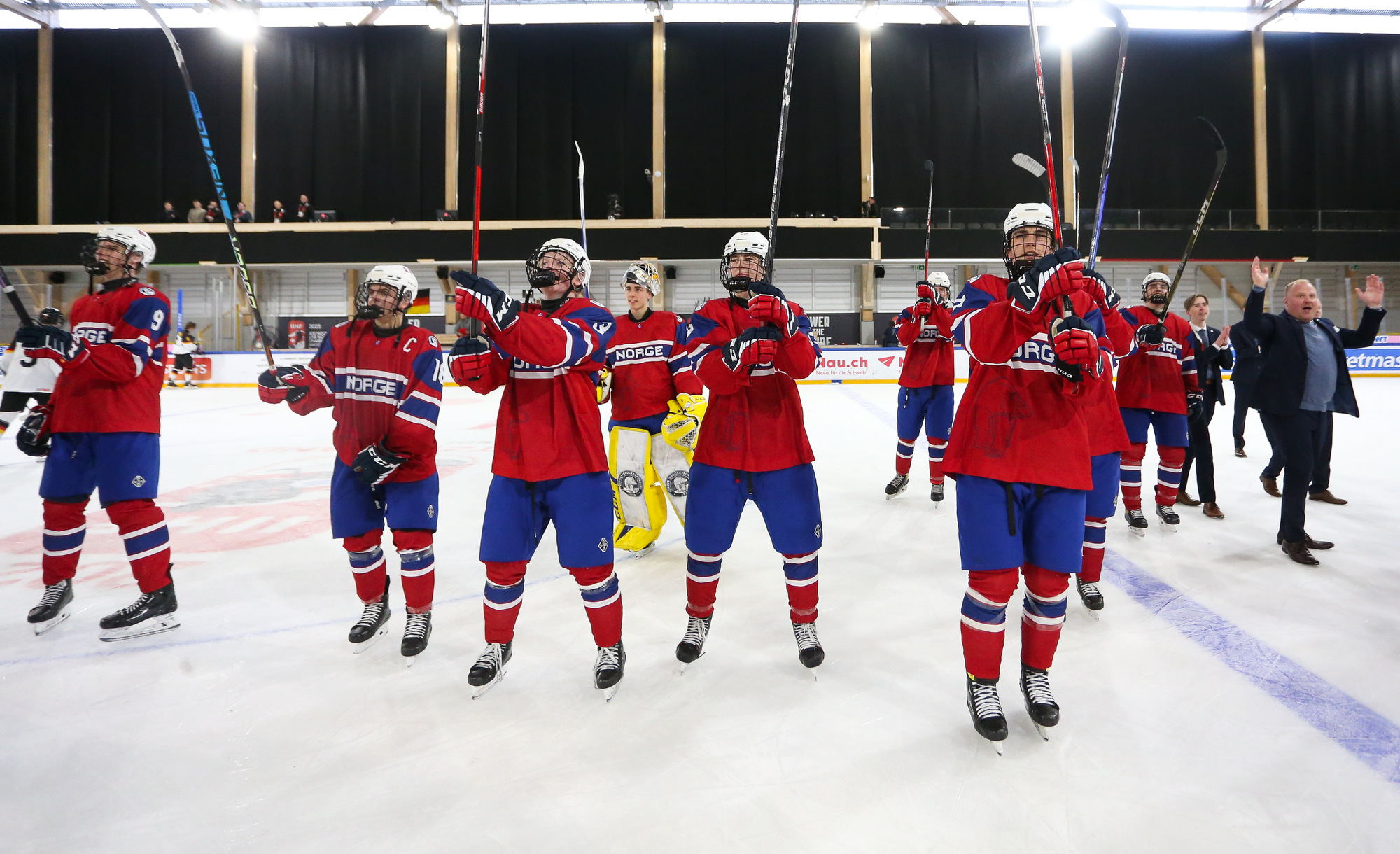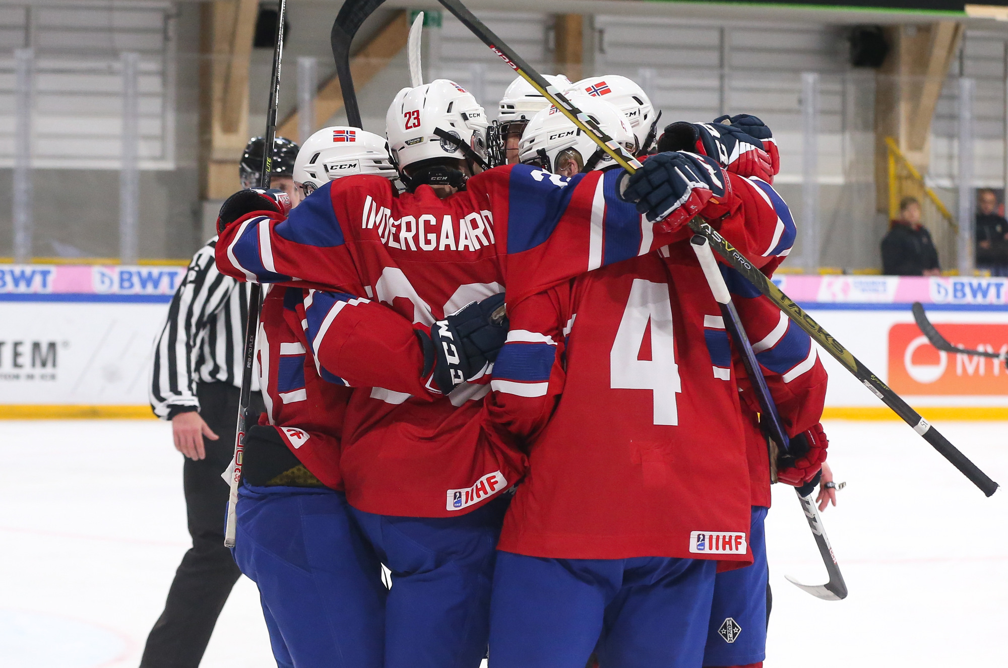 Norway celebrates after Jorgen Myhre's (#15) first-period goal in the deciding 3-2 victory over Germany in relegation play at the 2023 U18 Worlds