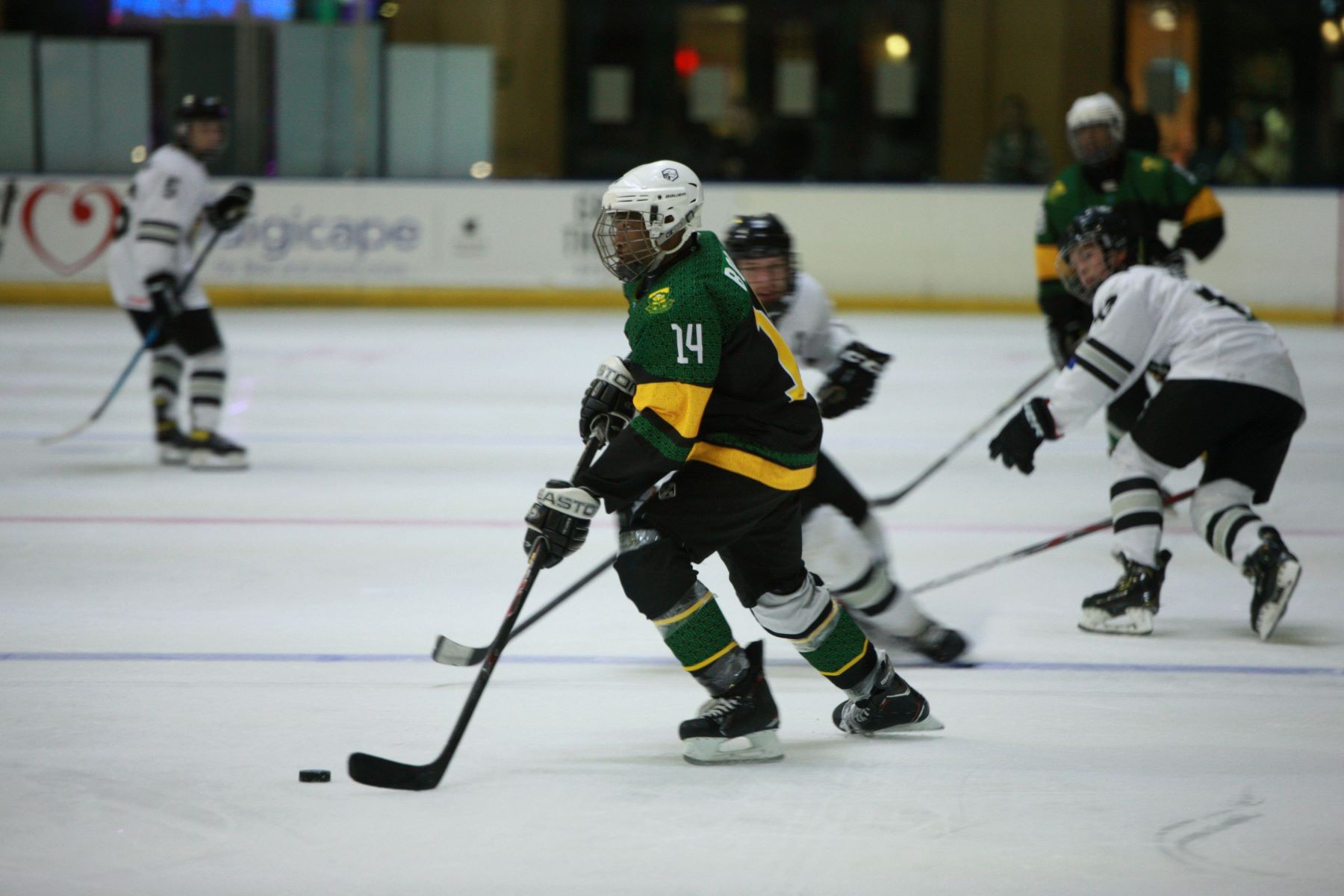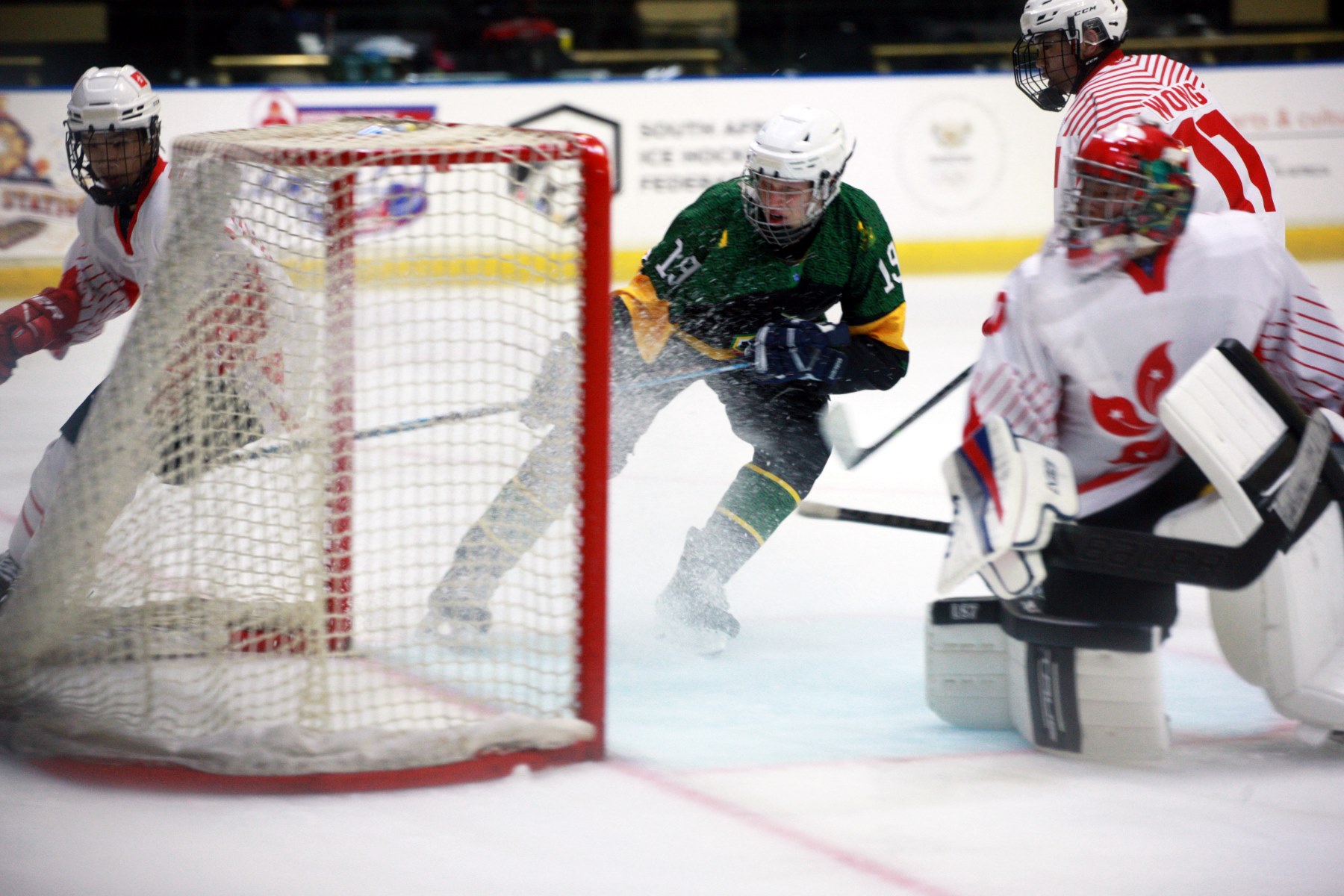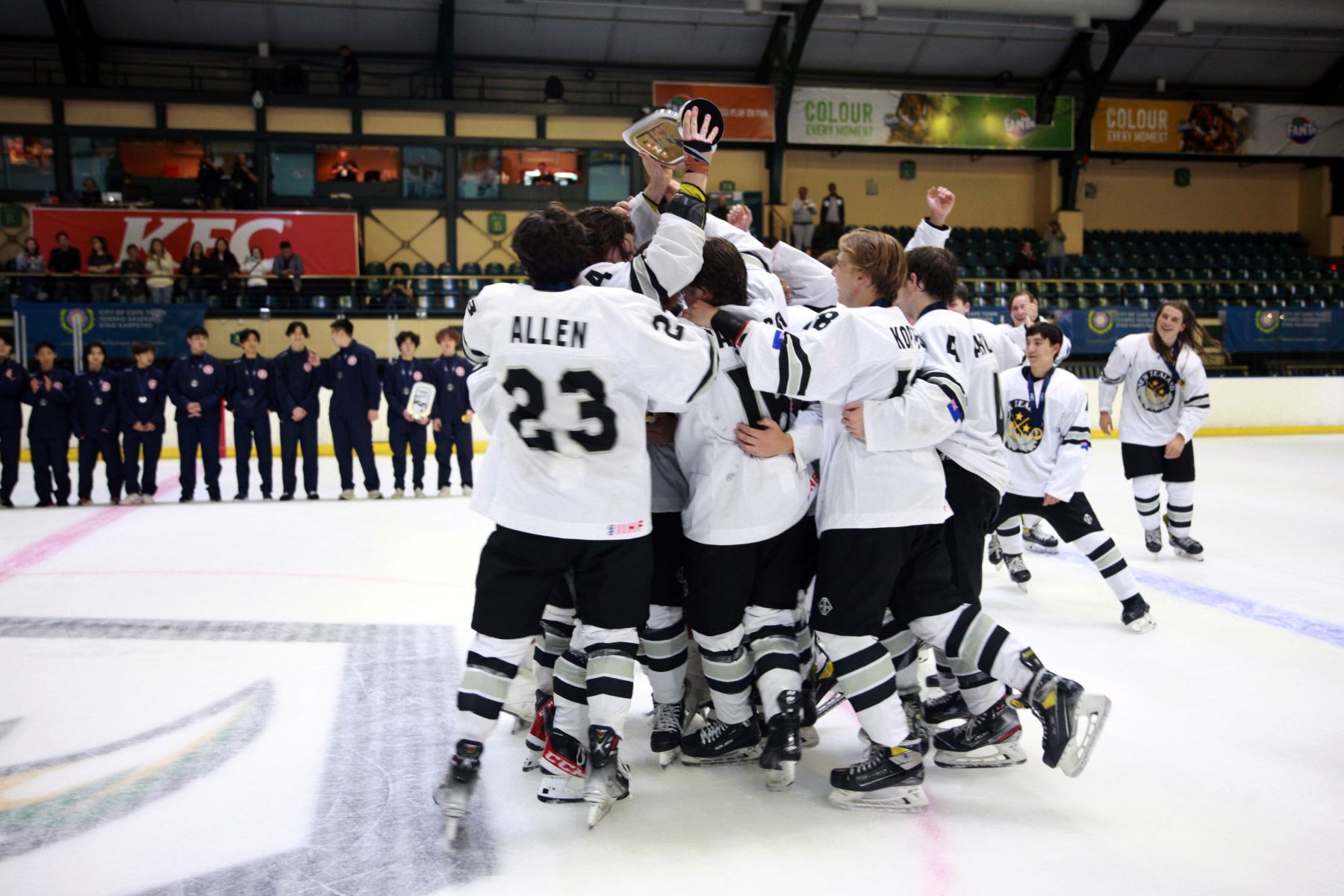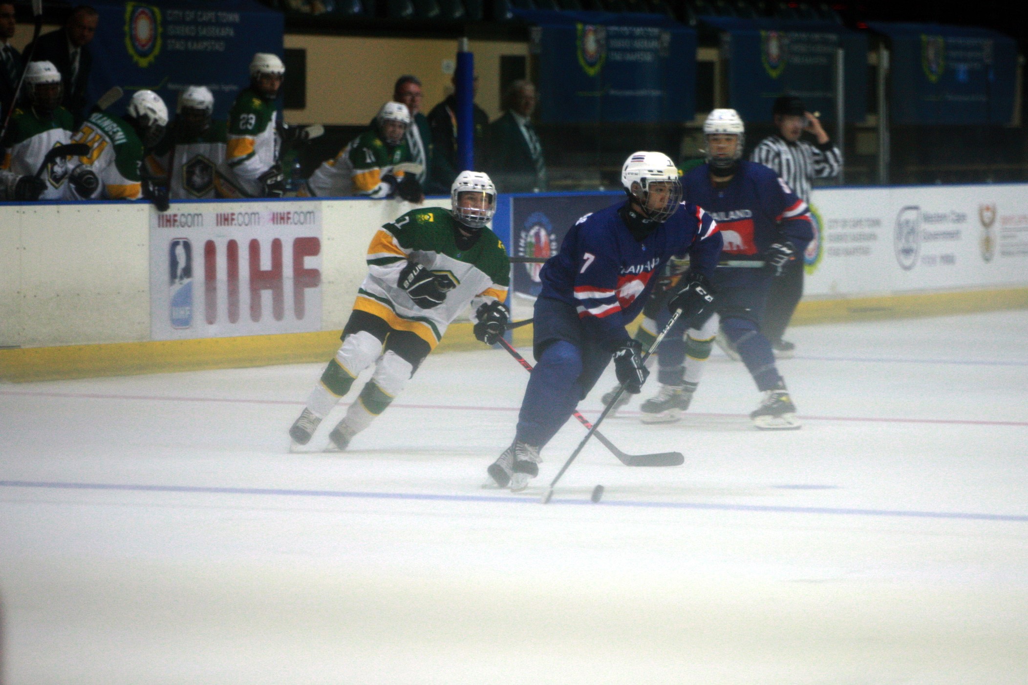As host nation South Africa faced New Zealand, looking for its first win, it enjoyed the full support of the Thailand contingent. New Zealand needed a win in regulation to take gold in a three-way tie with its Asian rivals, but if South Africa could take even one point from the game, Thailand would finish on top of the pile.However, the young Ice Blacks gave South Africa little chance in Thursday’s game. New Zealand won 7-1, outshooting the opposition 60-8. There was some brave resistance from home goalies Nico Janse van Rensberg (40 saves from 44 shots) and Connor Gilbert (15 from 16), but the onslaught was irresistible. Once Nash Hayward Jones opened the scoring with a shorthanded goal in the 15th minute, there was little doubt about the final outcome. South Africa came close to tying the game late in the first period: many in the arena thought that Noam Levin’s deflected shot had found the target, but it rippled the twine from behind the goal rather than crossing the goal line.