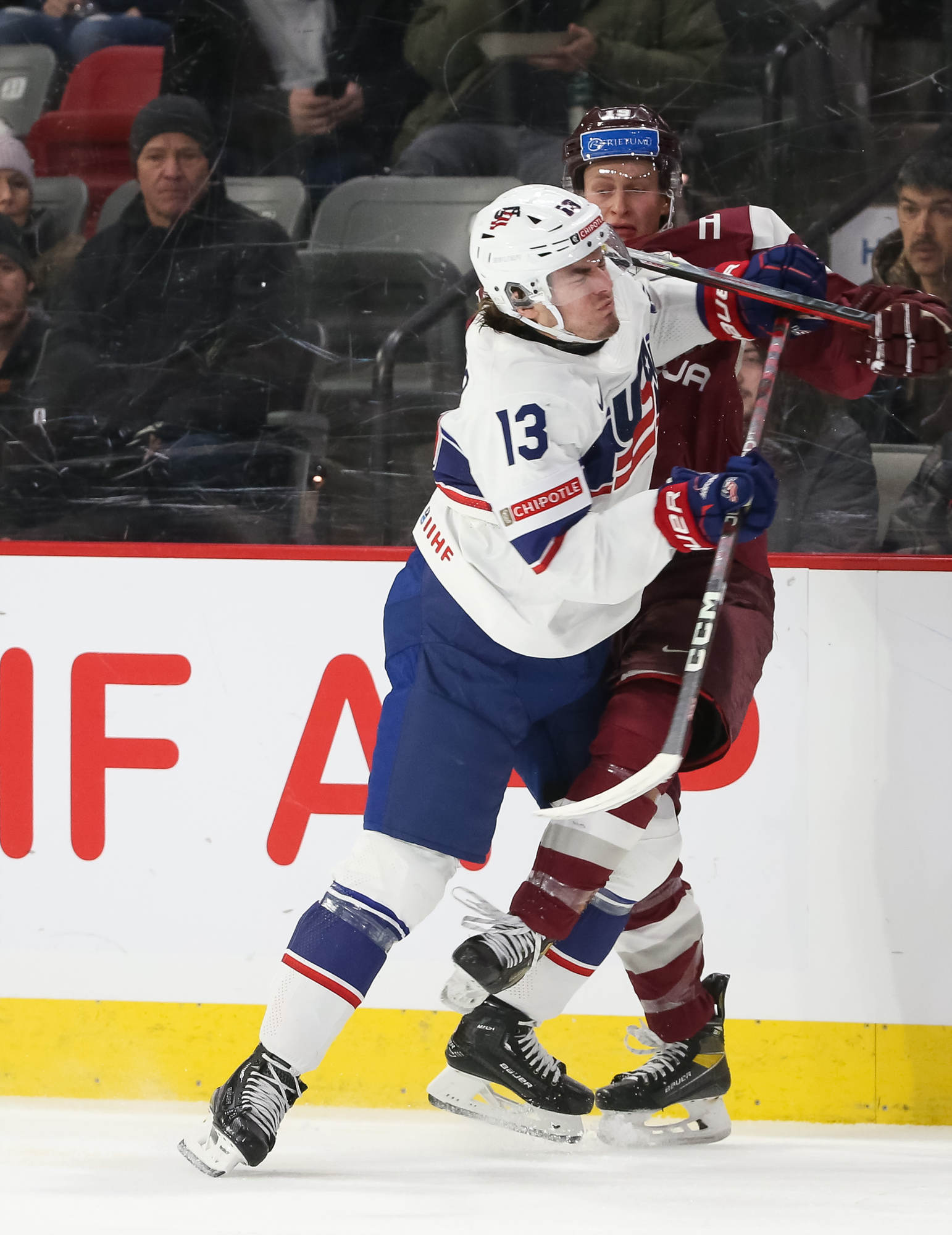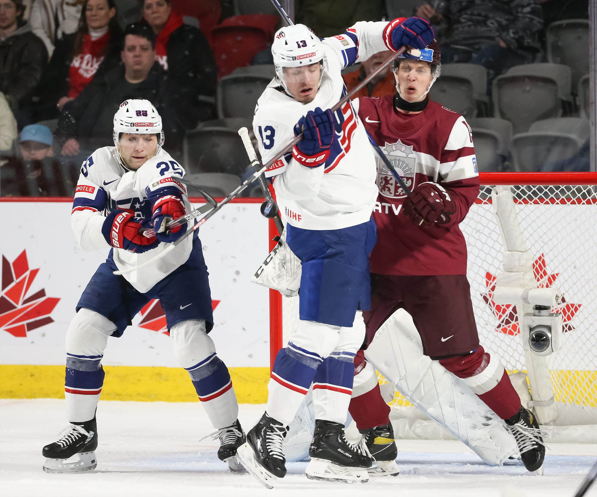 Team USA's Tyler Boucher (#13) is hit by the puck as he battles for position against Latvia's Darels Dukurs (#19).