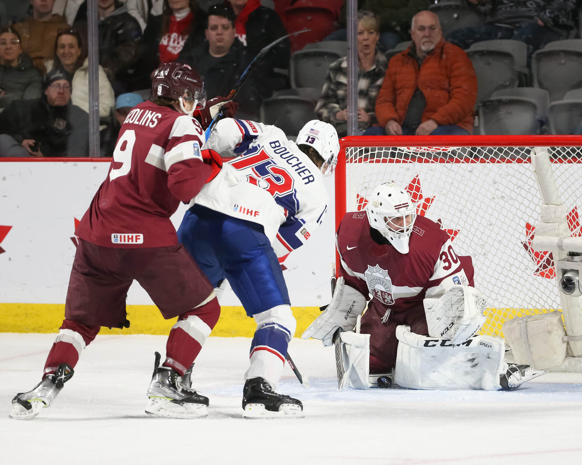 The U.S. set a strong skating tempo from the drop of the puck. But Latvia held its own in the first period, playing committed defensive hockey, despite failing to capitalize with Gavin Brindley off for slashing. Shots only favoured the Stars and Stripes 9-8.
