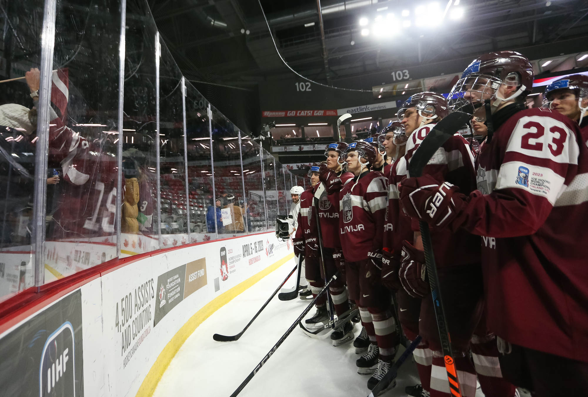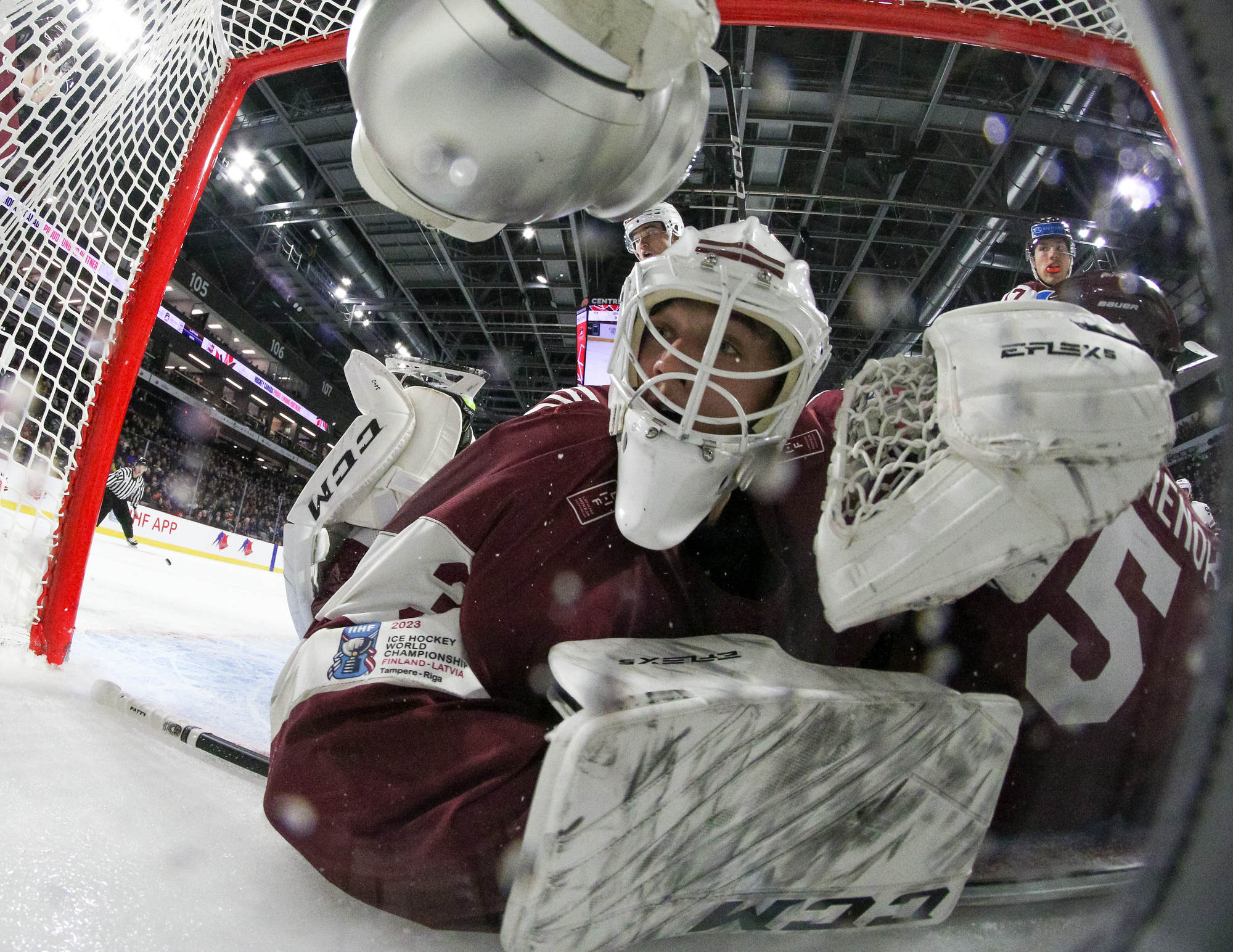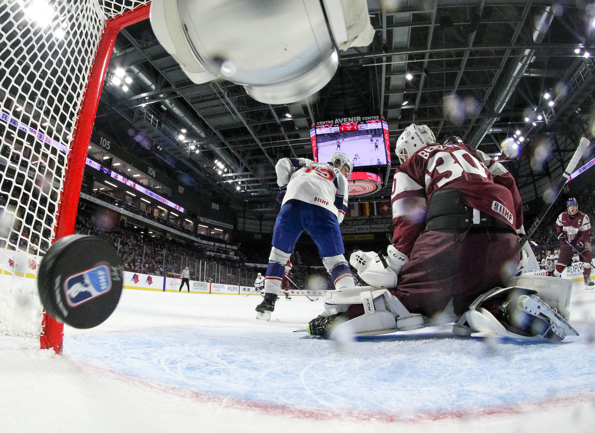 Latvia had an answer at 4:59. The goal was a thing of beauty. On a 2-on-1 break versus defenceman Jack Peart, Ravinskis worked a give-and-go to perfection with Rullers. Ravinskis slammed the puck into the open side as the crowd cheered for the underdogs. It was Latvia's first shot of the second period.