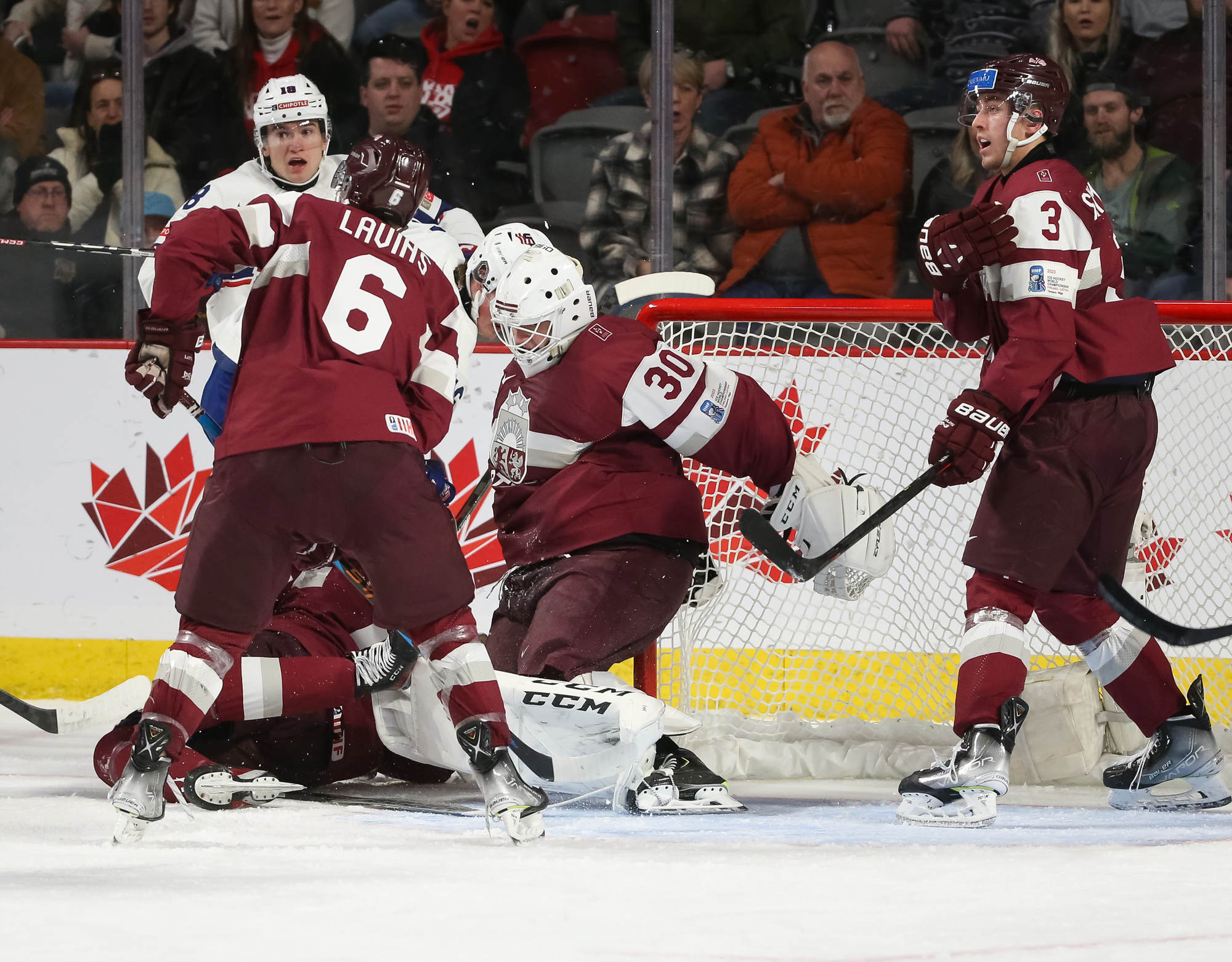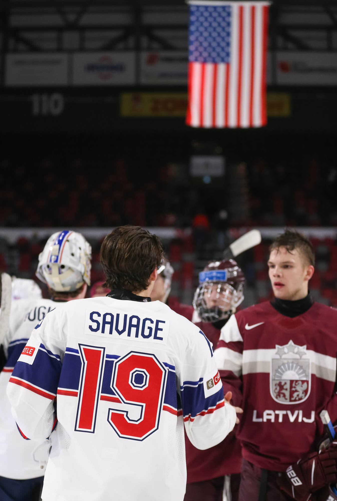 Savage made it 4-2 at 6:48 as he coolly converted a rebound with Berzins sprawling. At 13:29, Hughes scored on a long shot from the right point that dinged in off the goalie's right post. There would be no late Latvian comeback.