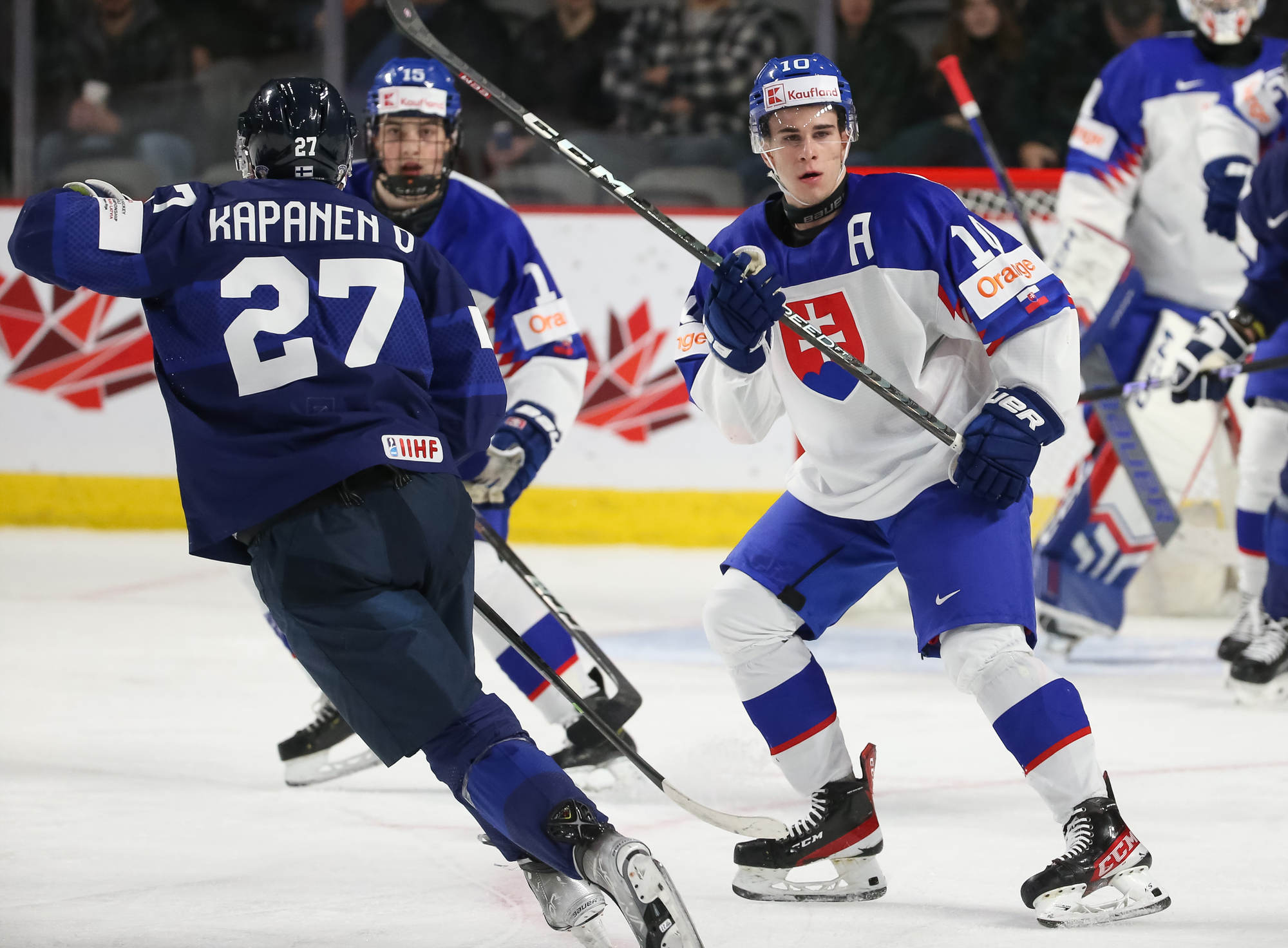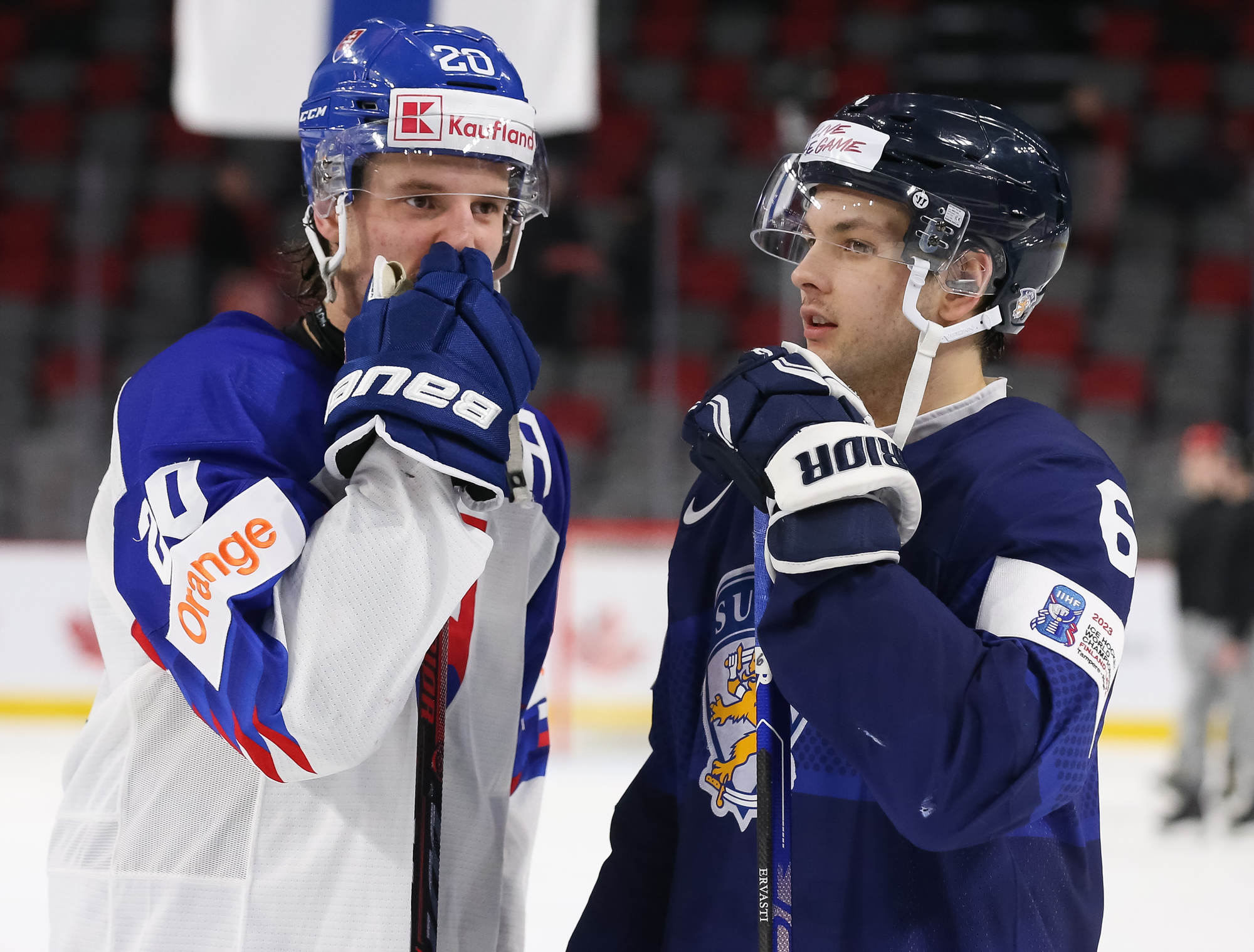 Finland outpaced Slovakia 5-2 to earn its first three-point win of the 2023 World Juniors. Pictured are Finnish captain Oliver Kapanen (L) and Slovakia's Dalibor Dvorsky (R).