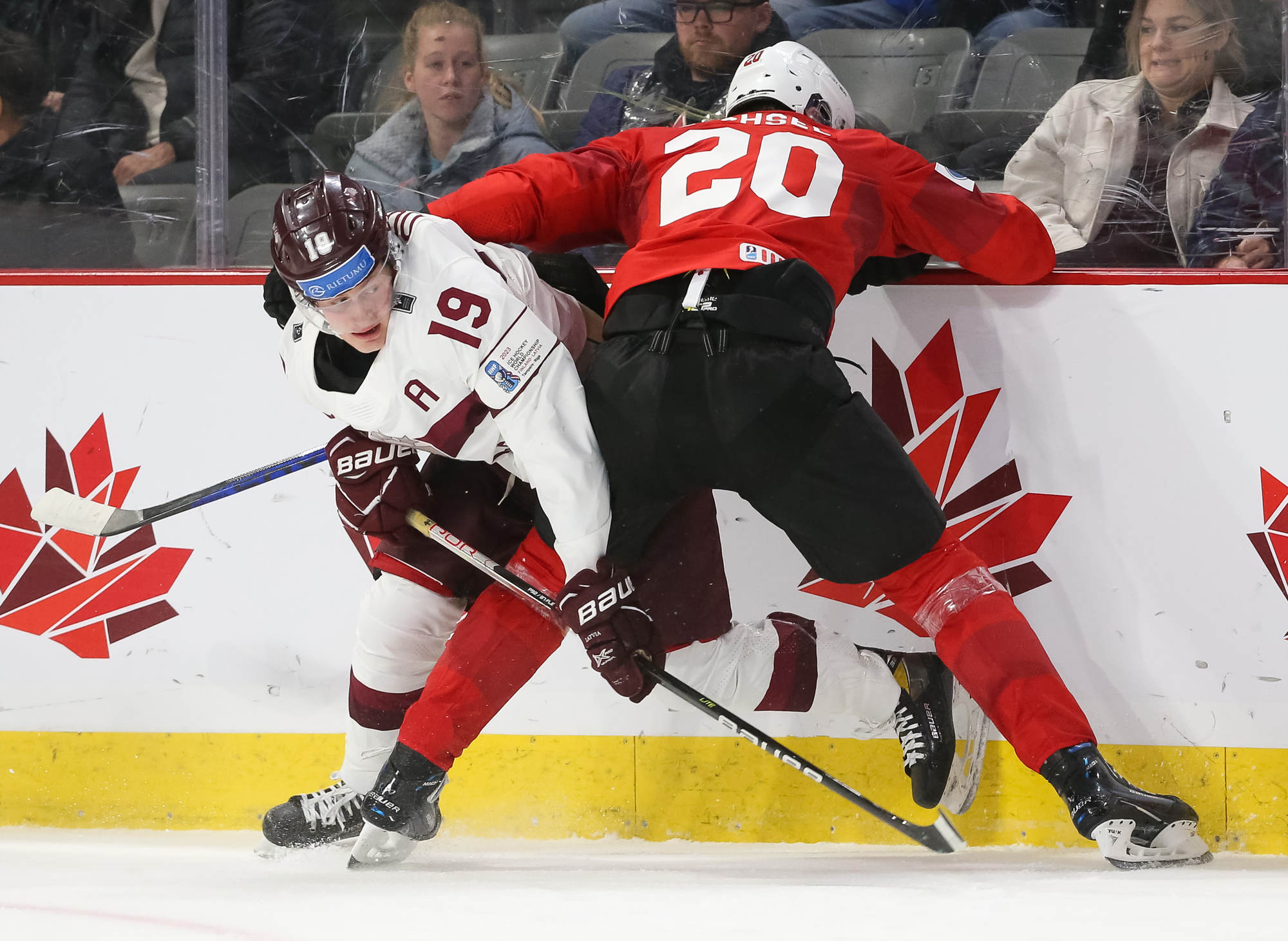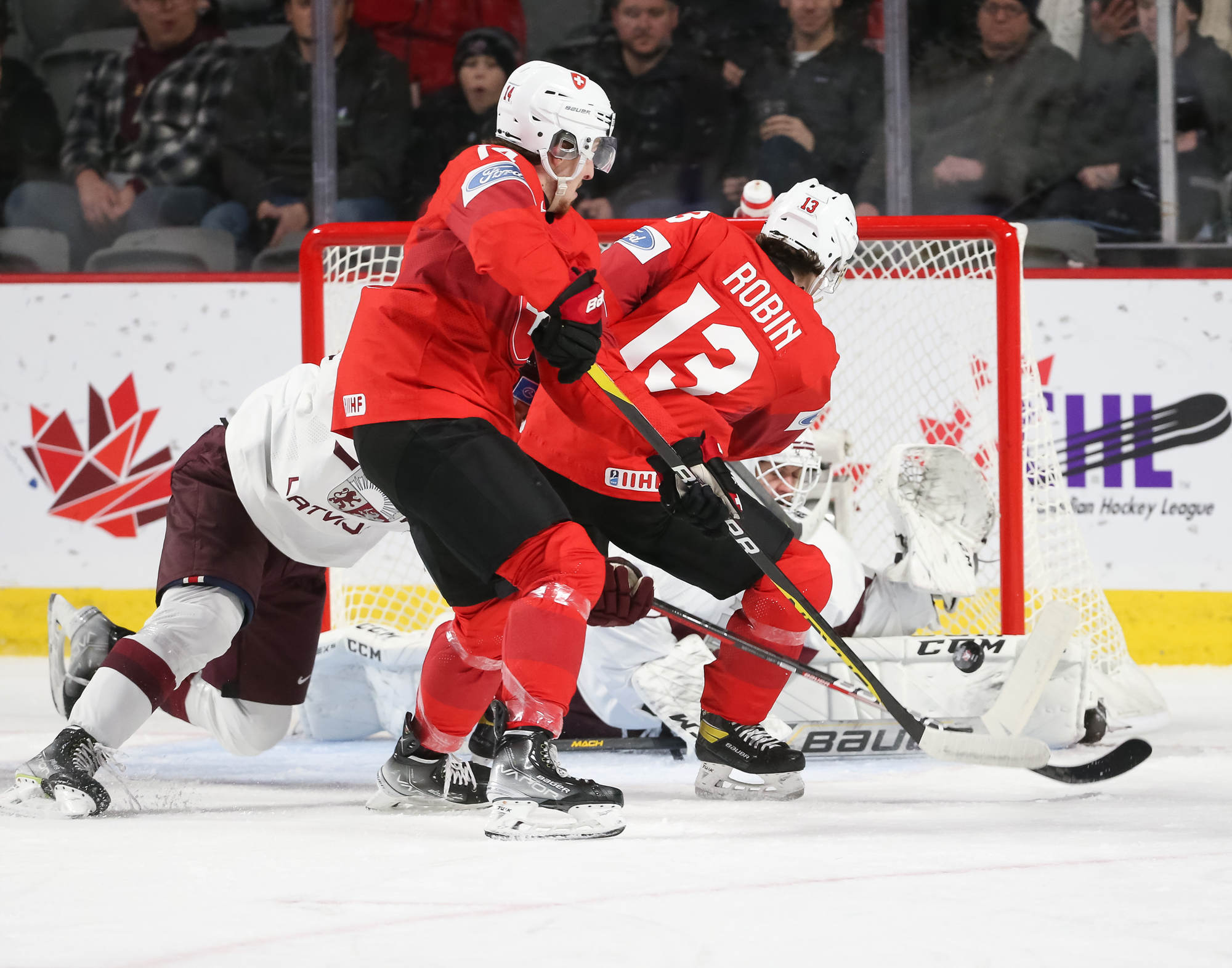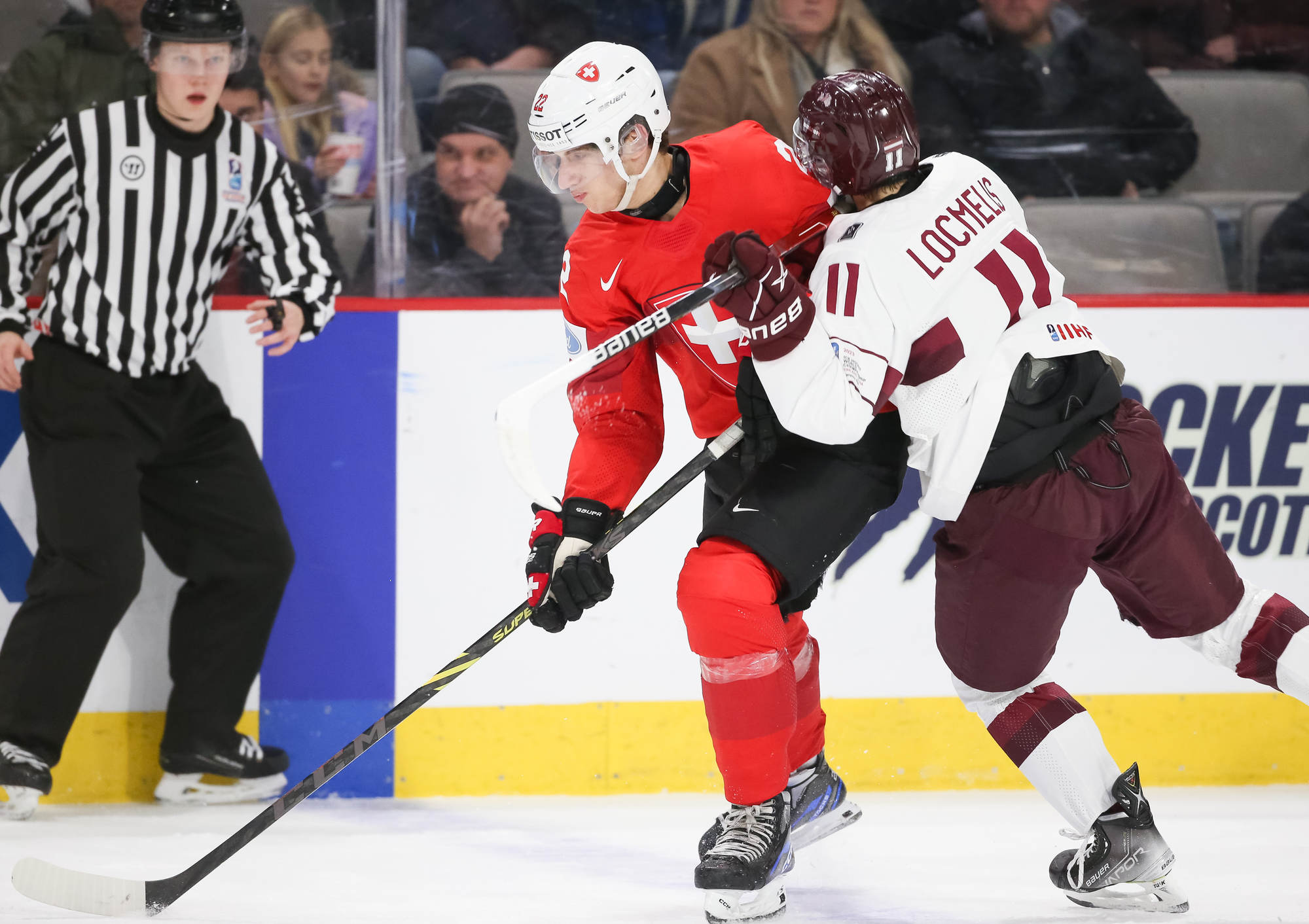 The Swiss physical play continued as towering blueliner Lian Bichsel stapled Latvian assistant captain Darels Dukurs to the boards. But the Latvians were undaunted.