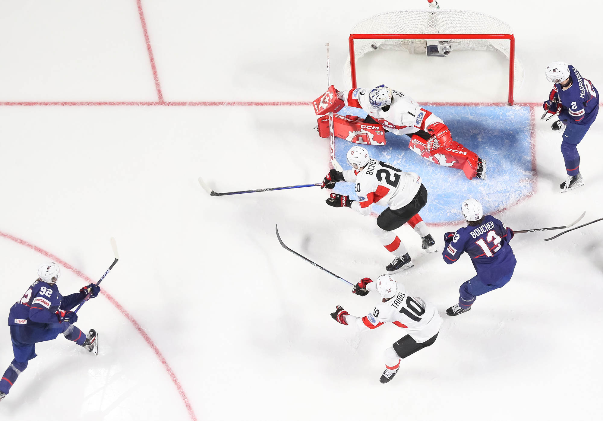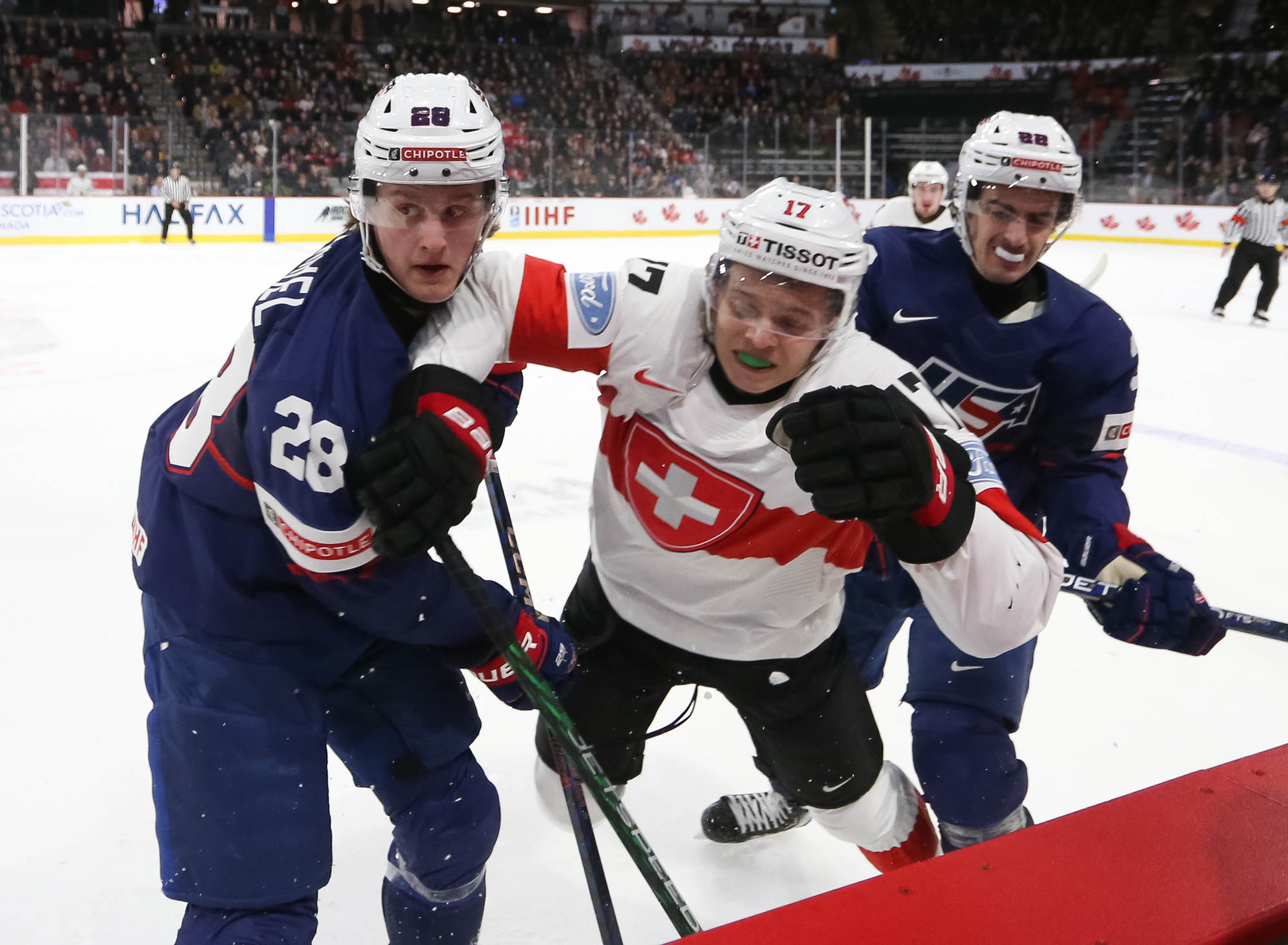 Switzerland then had a golden chance to get on the board on an odd-man break. An onrushing Mischa Ramel's shot from the left side spawned a juicy rebound for Jeremy Jabola, but U.S. defenceman Ryan Ufko was there to check his stick.