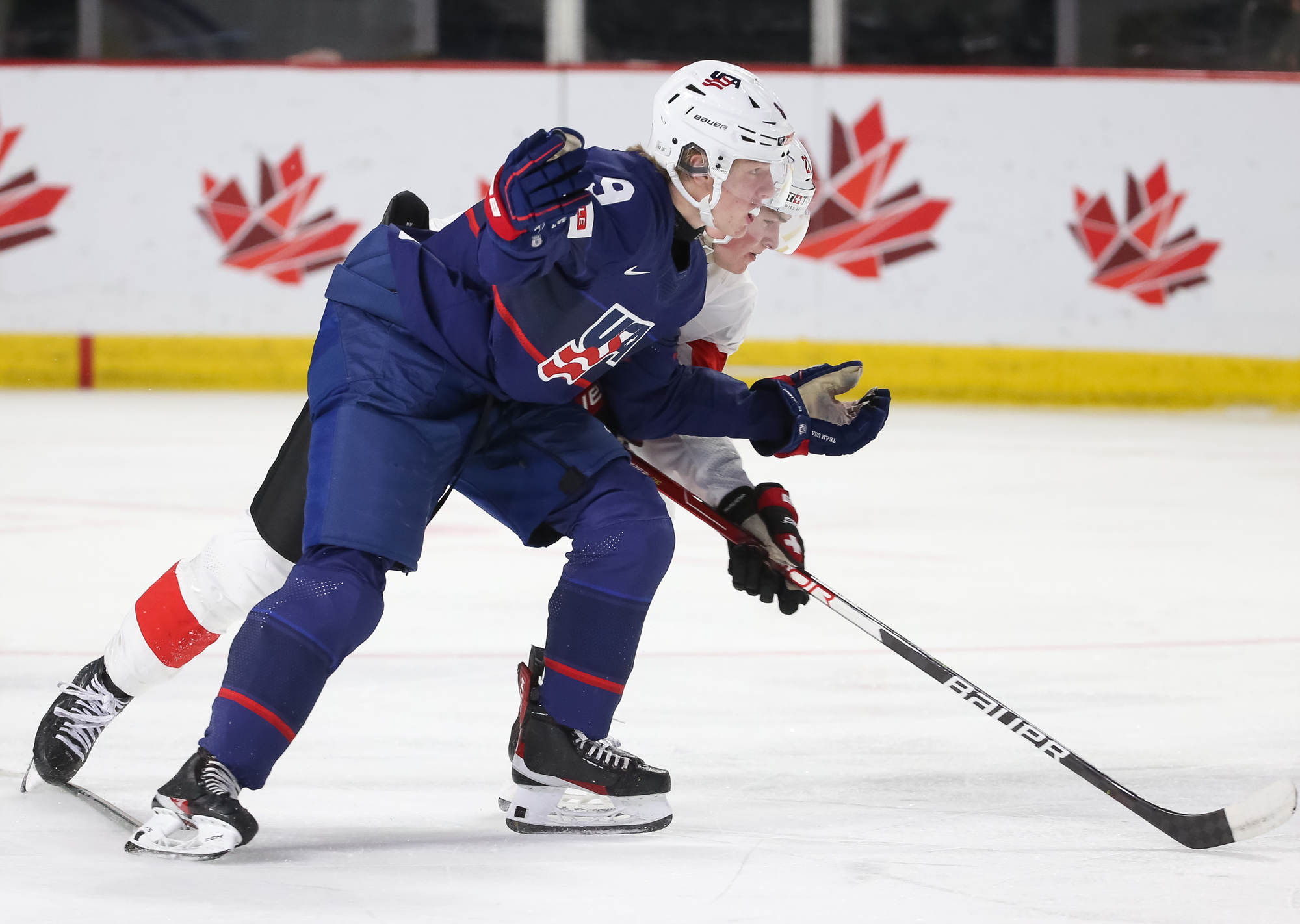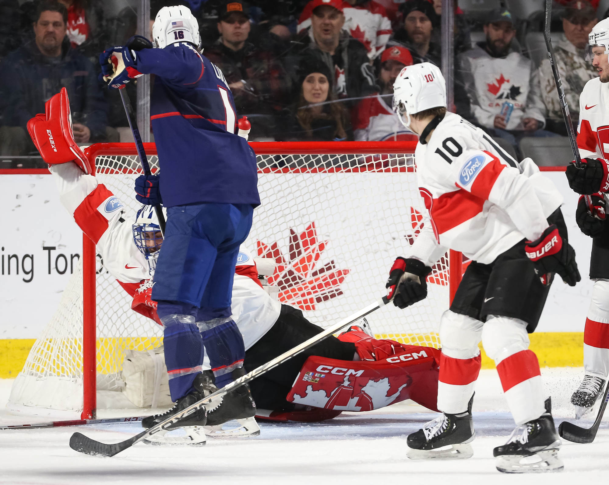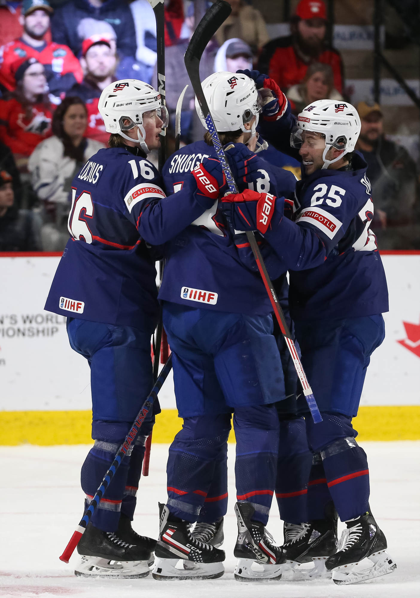 At 16:40, Snuggerud gave the U.S. a 3-0 lead. Jackson Blake cut around the Swiss goal and found Snuggerud with a sweet feed in the left faceoff circle. He fell to his knees as he whipped the puck into the net.