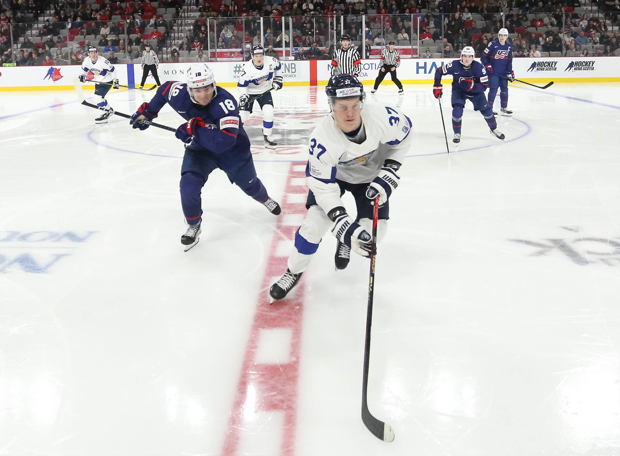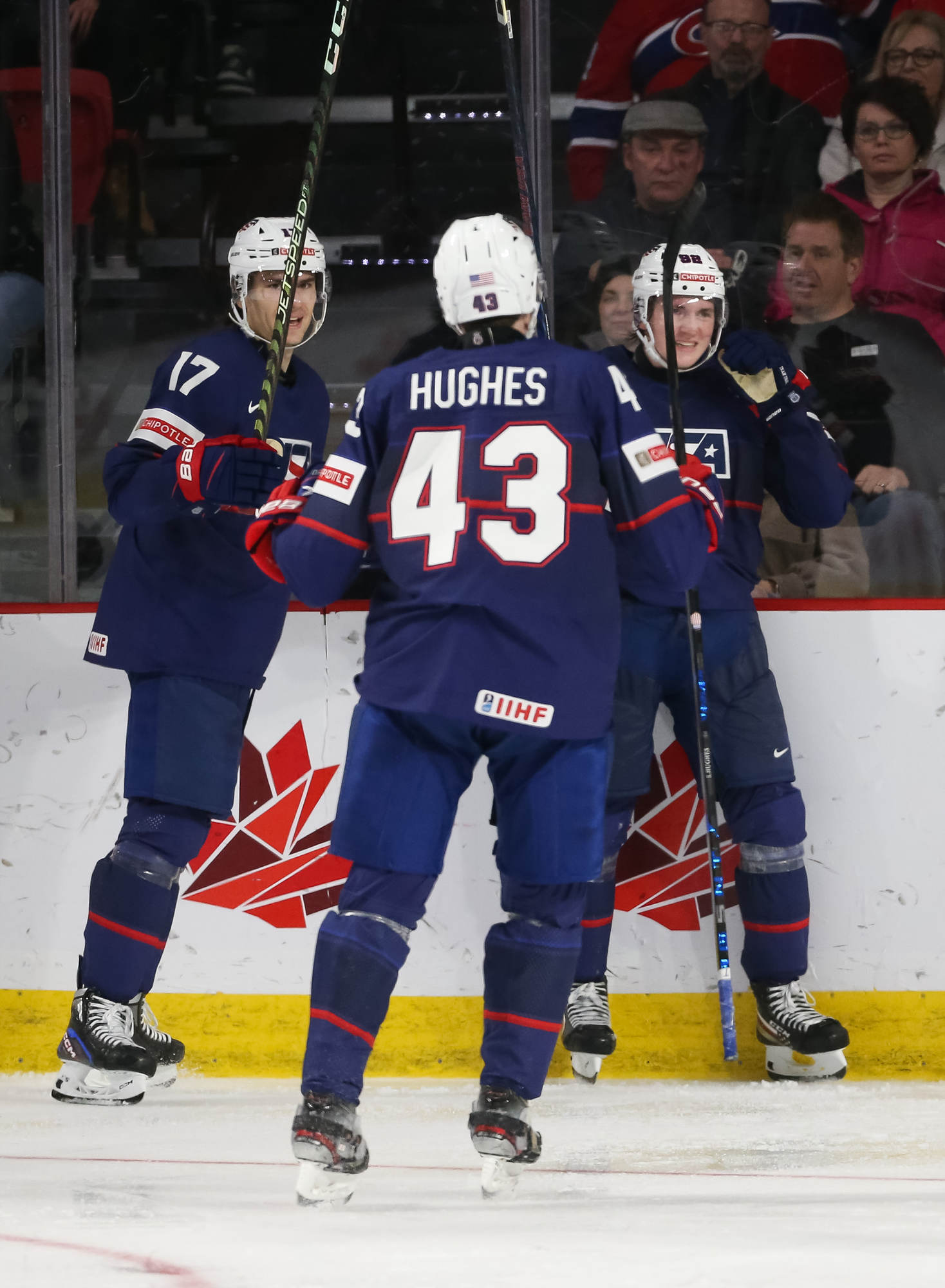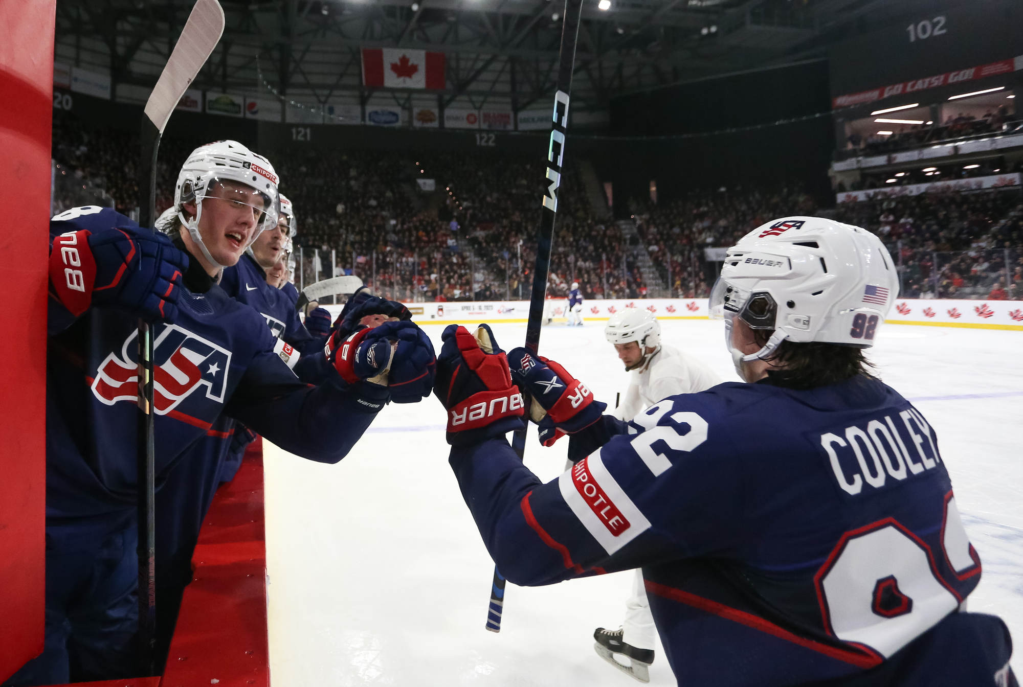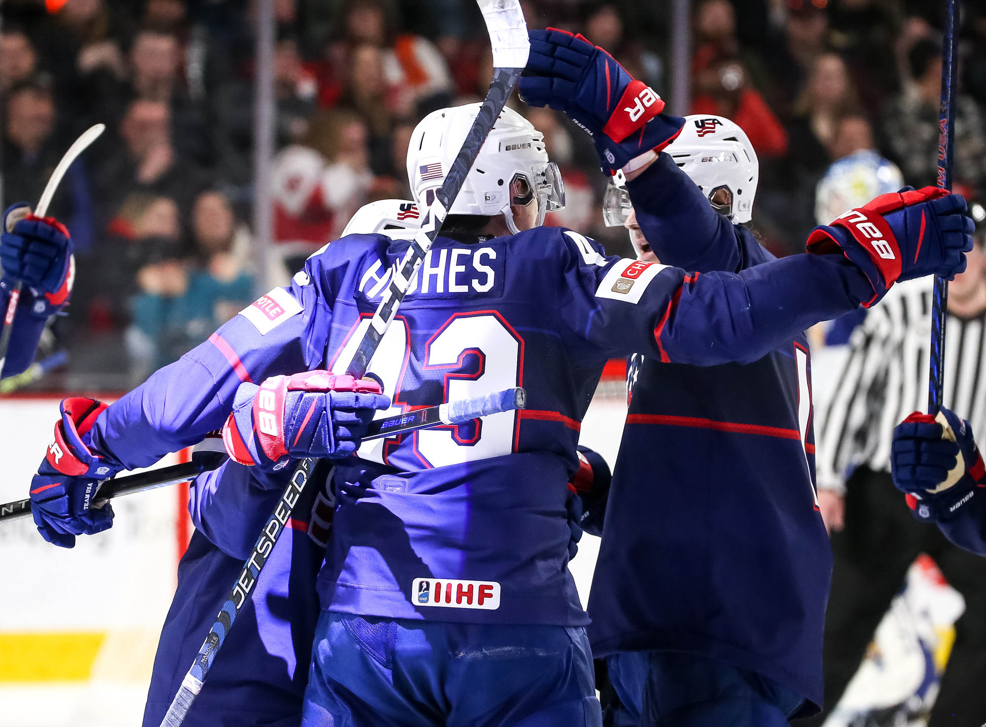 The U.S.'s Jimmy Snuggerud (#18) led the way with four points in a 6-2 American romp to clinch first place in Group B on New Year's Eve at the 2023 World Juniors in Moncton.