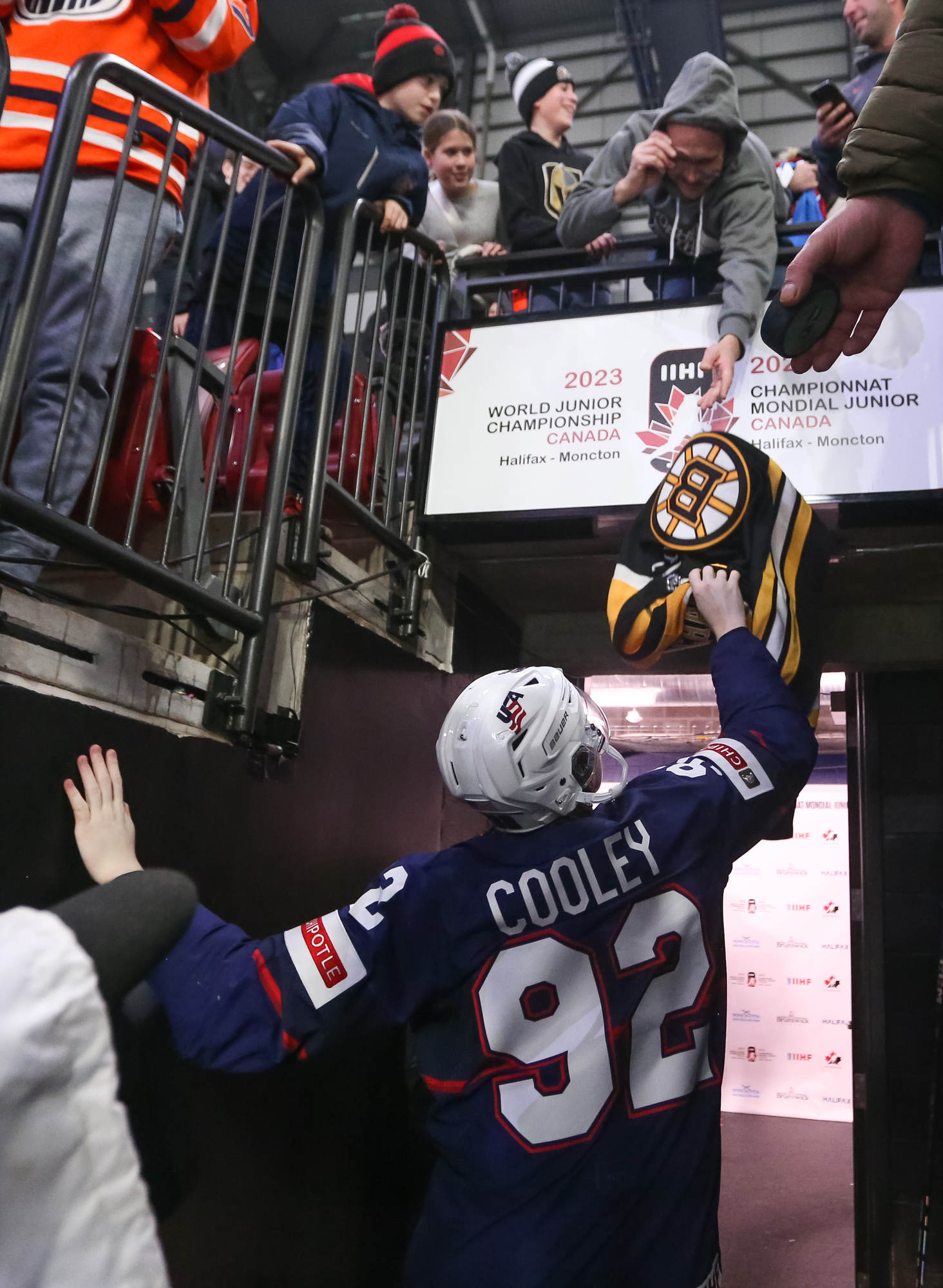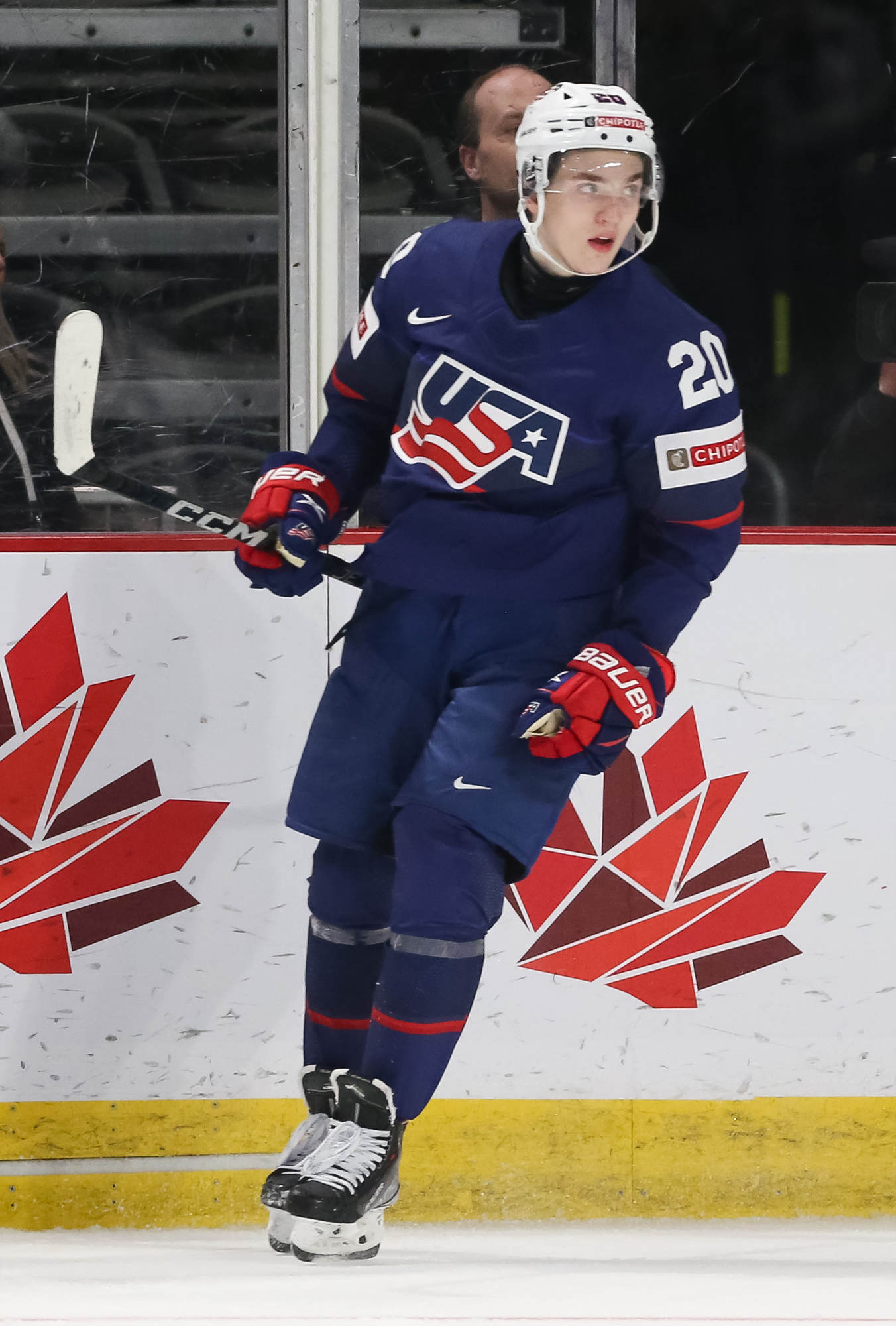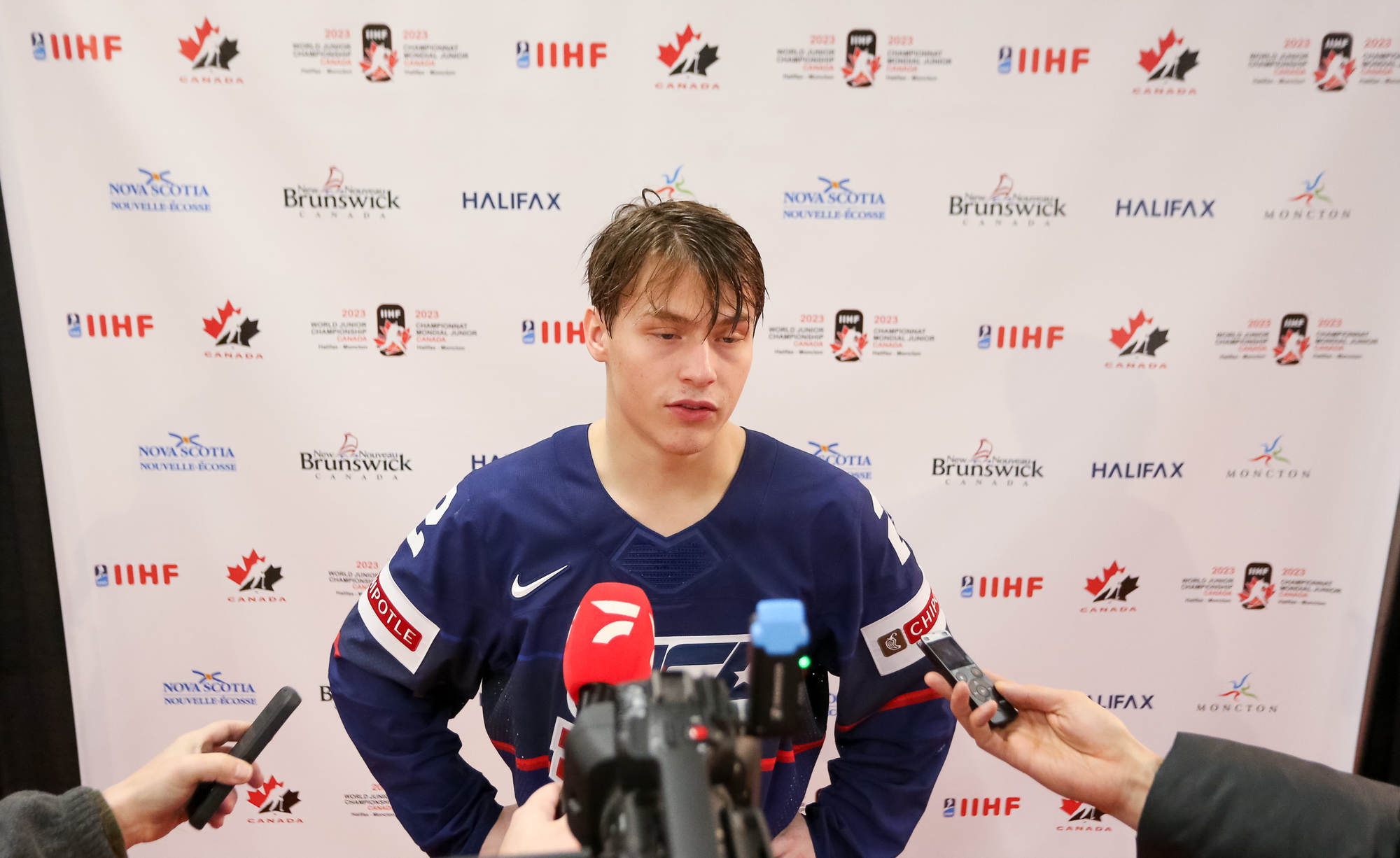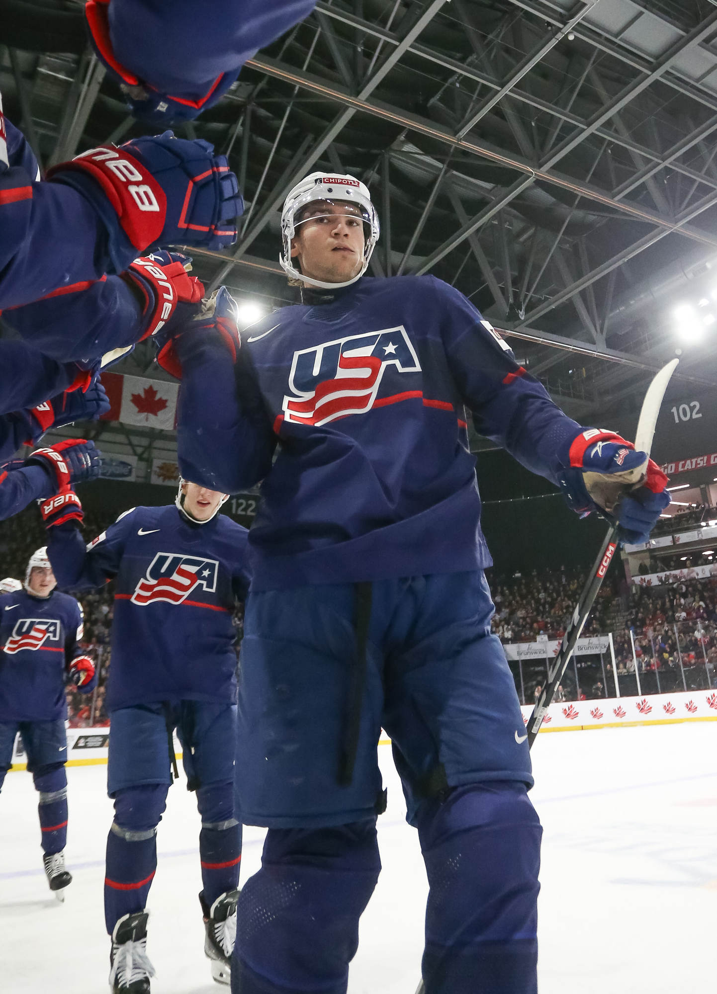 The U.S.'s Jimmy Snuggerud (#18) led the way with four points in a 6-2 American romp to clinch first place in Group B on New Year's Eve at the 2023 World Juniors in Moncton.