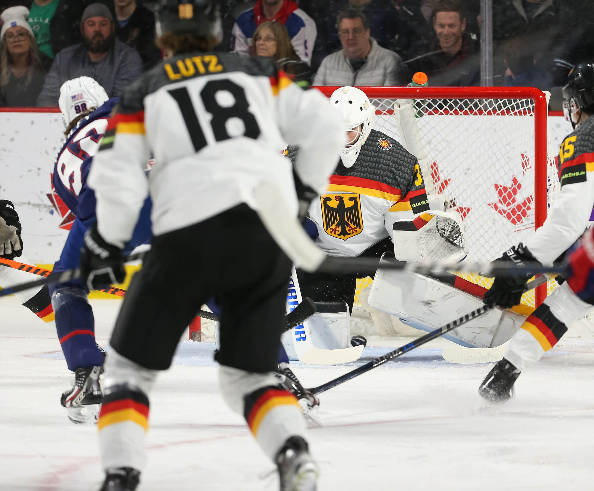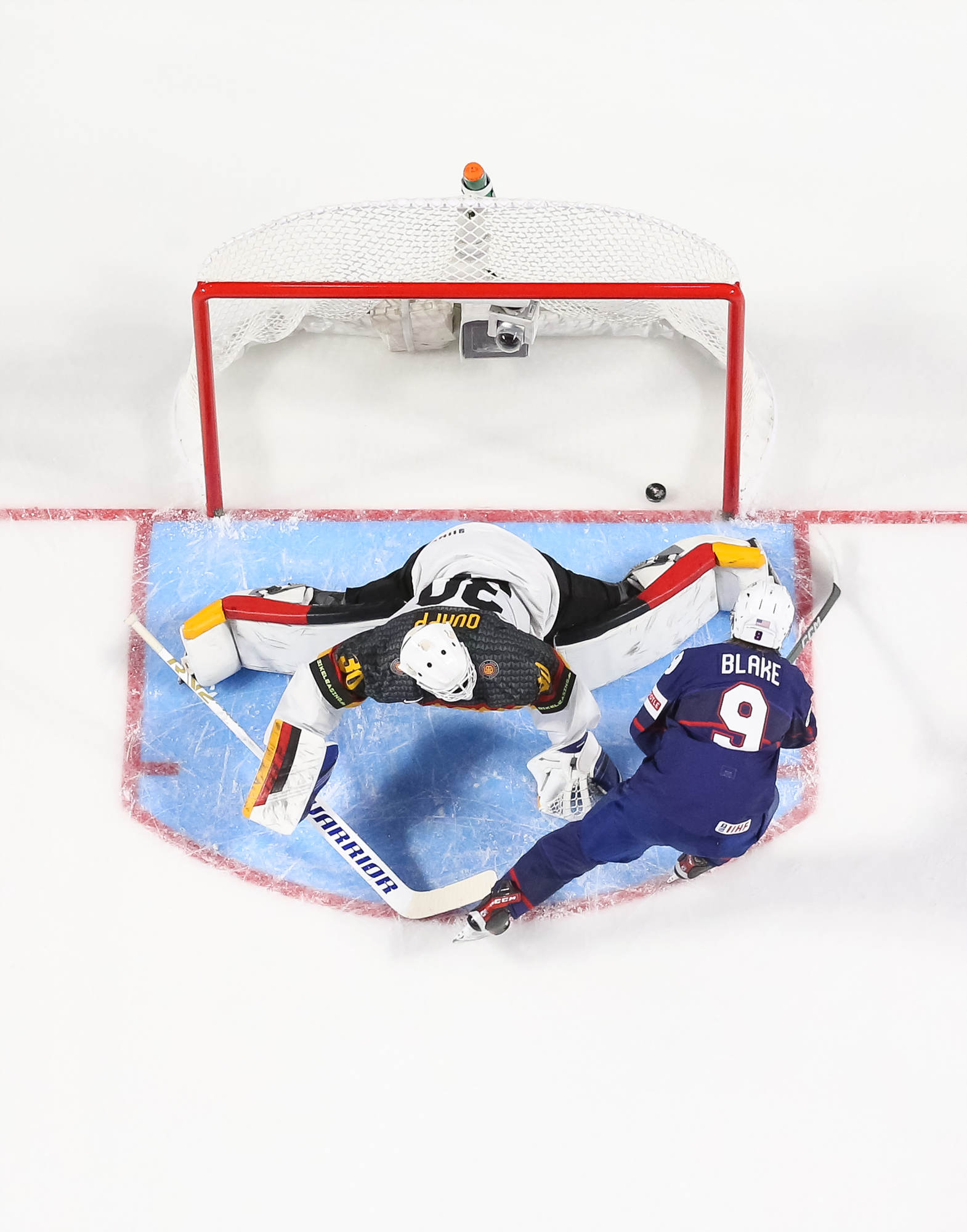 The Americans continued to confound Germany with their playmaking, scoring three more goals in a span of 2:16. Rutger McGroarty found Lucius cross-ice in the left faceoff circle, and he skimmed the disc to Blake on the doorstep. He coolly tucked it past Quapp's left skate for a 4-0 gap at 9:05.