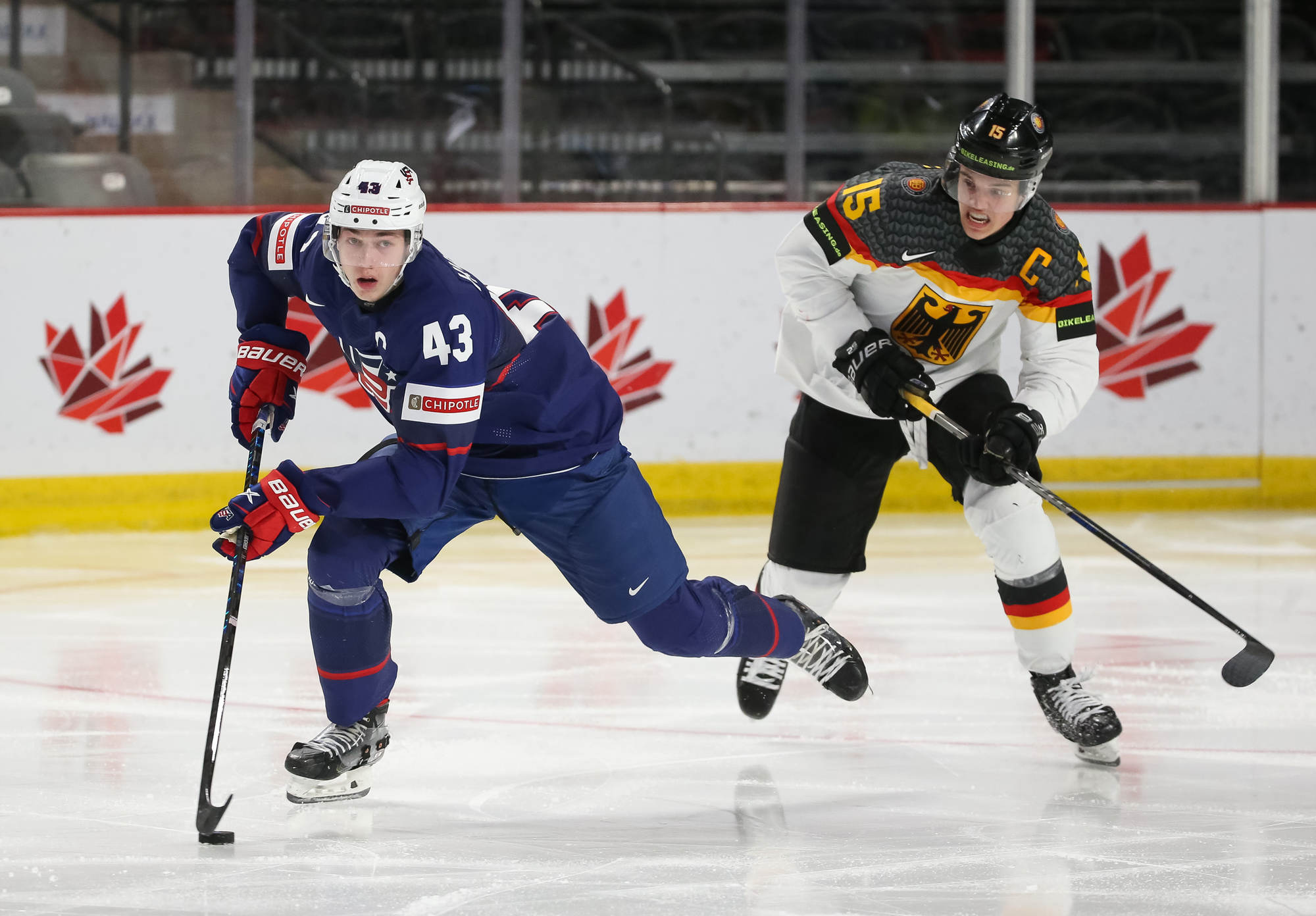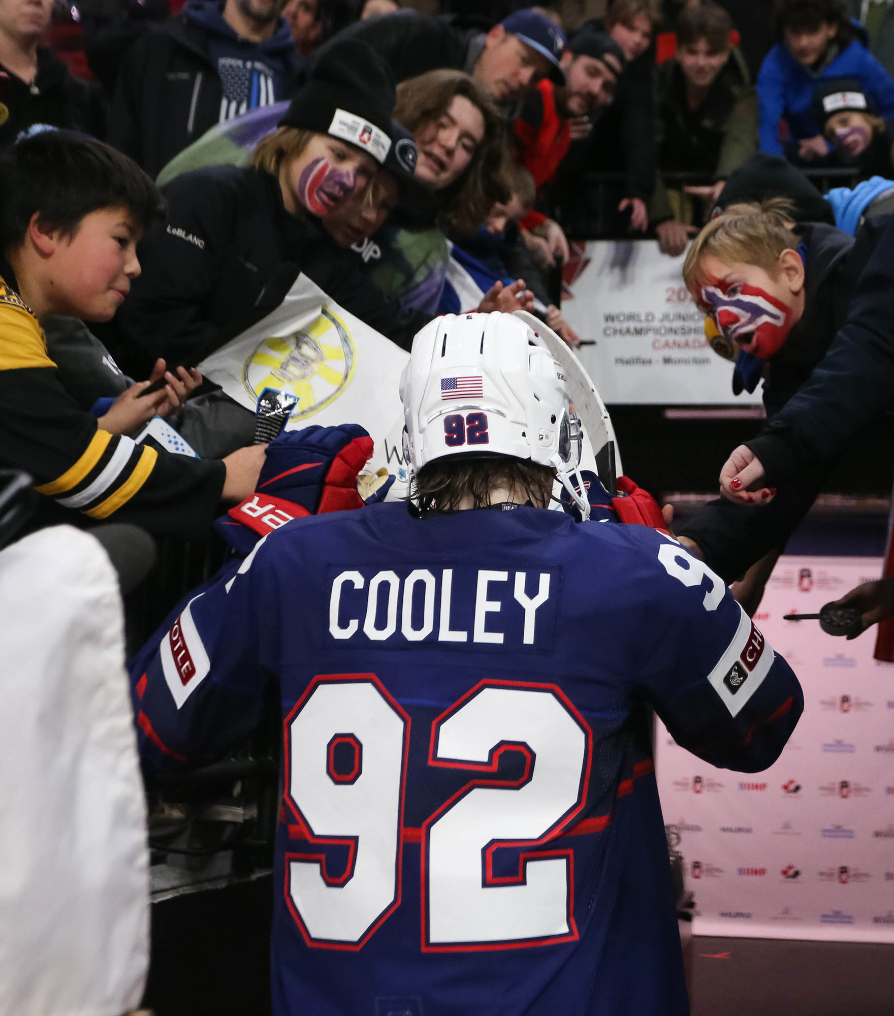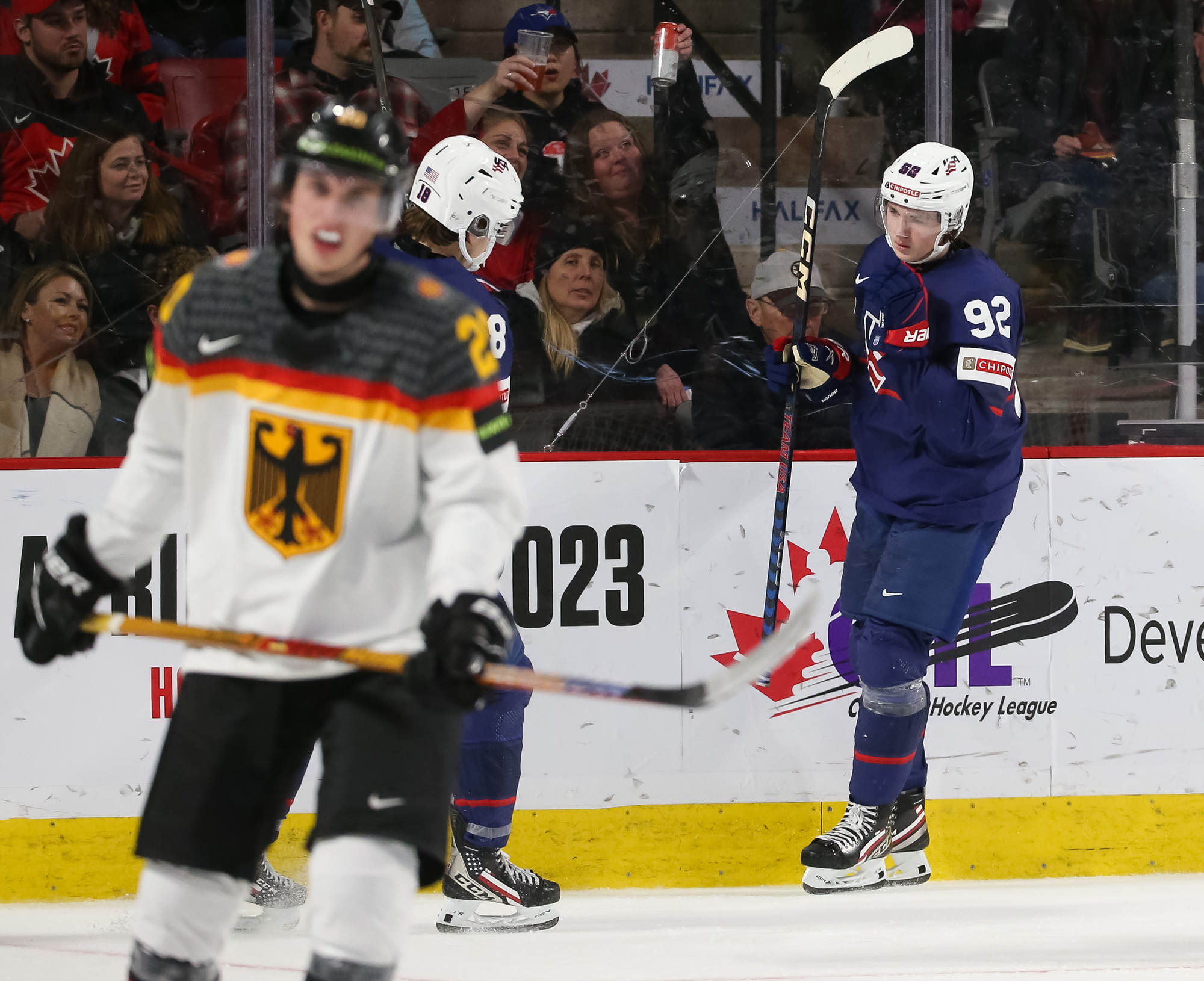 The U.S.'s Logan Cooley (#92) scored a hat trick and added an assist in an 11-1 quarter-final thrashing of Germany at the 2023 World Juniors in Moncton.