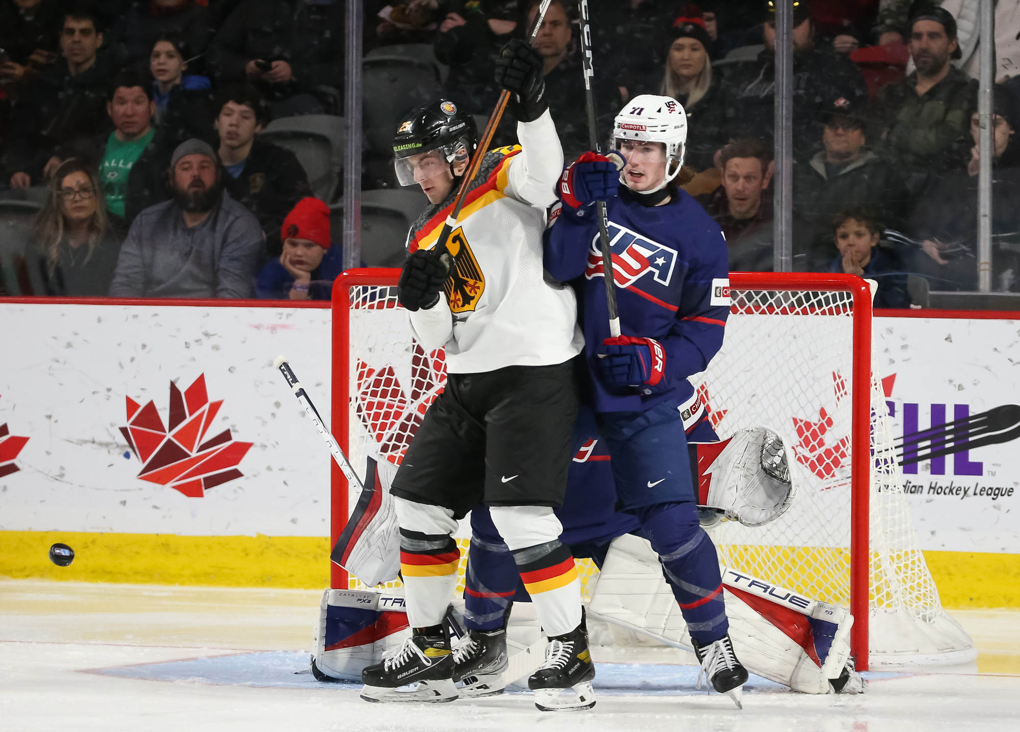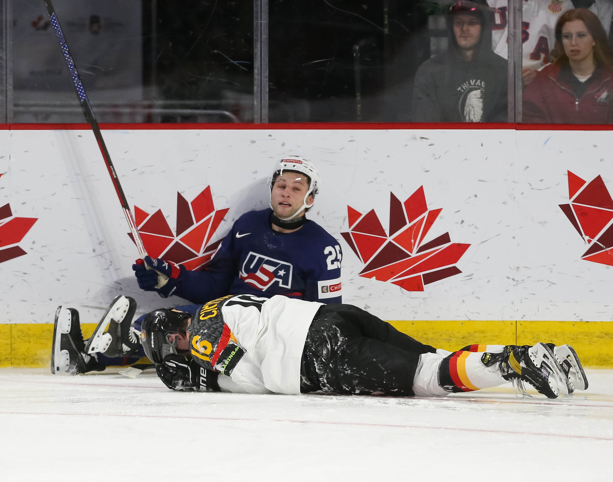In the third period, there was some concern right after Kenny Connors made it 9-0 for the Americans at 4:36. Dylan Duke, who had taken the puck hard to the net from the right, got turned around and inadvertently laid a weird hard reverse hit on Germany's Sebastian Cimmerman. The EHC Munchen prospect was helped off the ice.