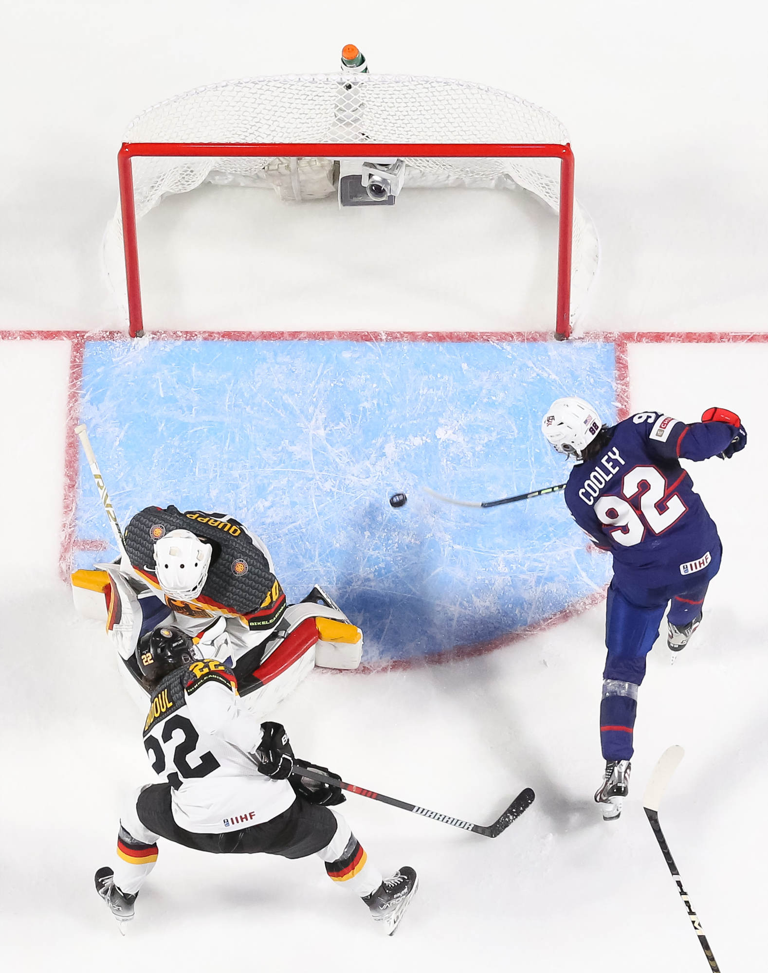 At 11:03, Cooley made it 5-0 when the German goalie couldn't control Ufko's shot and left the puck sitting at his feet. Just 18 seconds later, Gauthier sniped home the sixth American goal from the left faceoff circle.