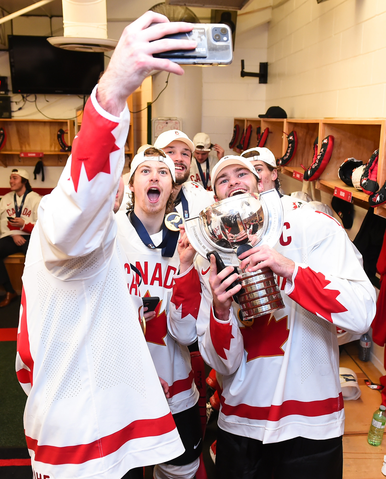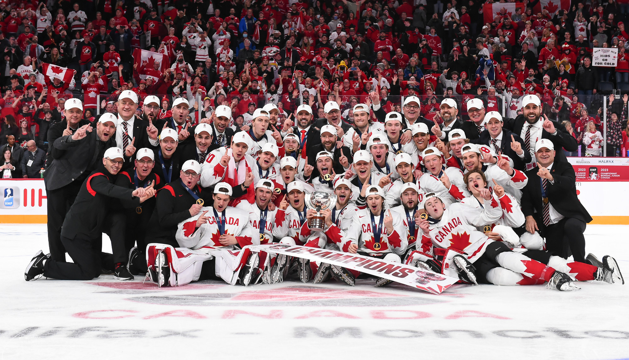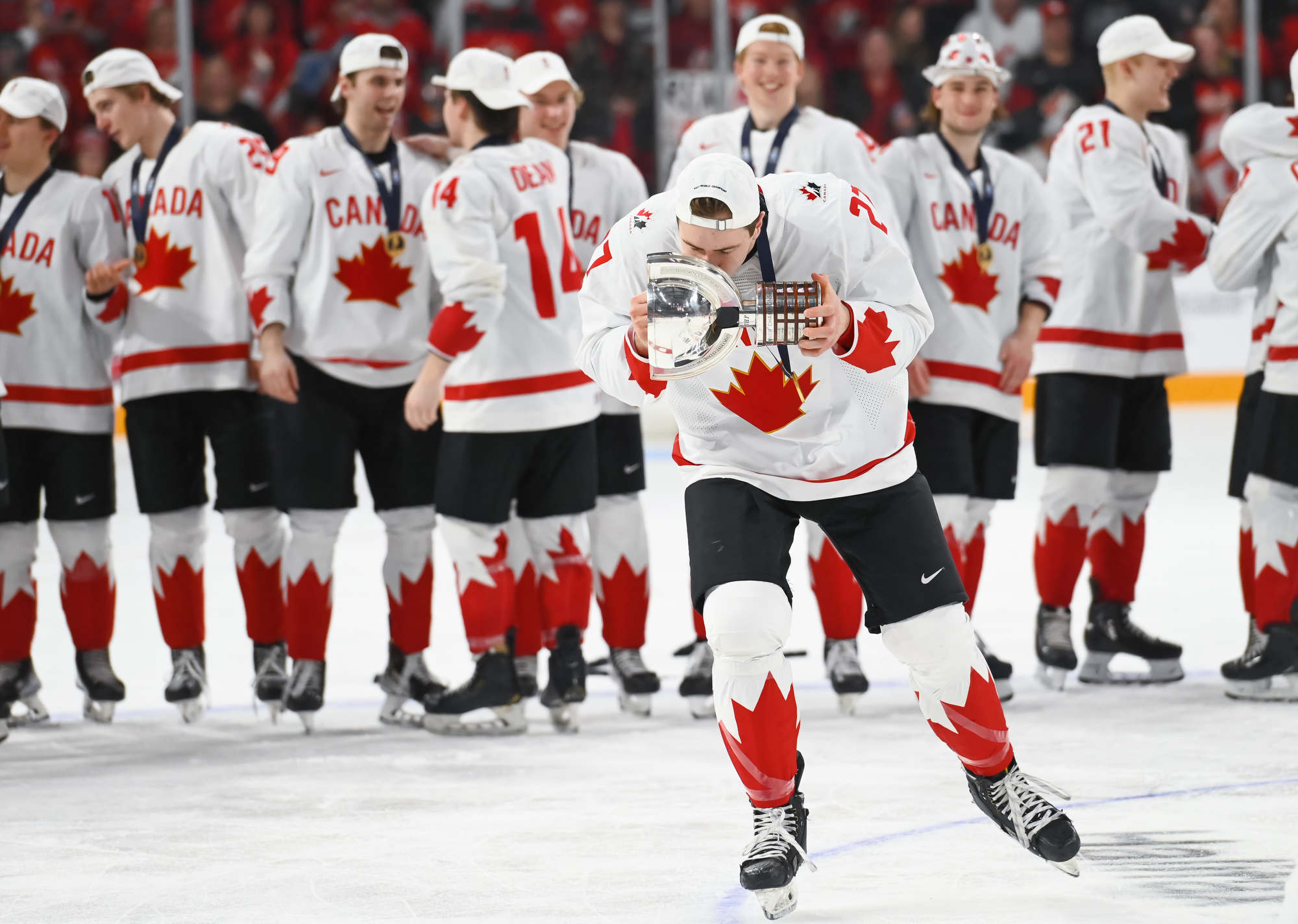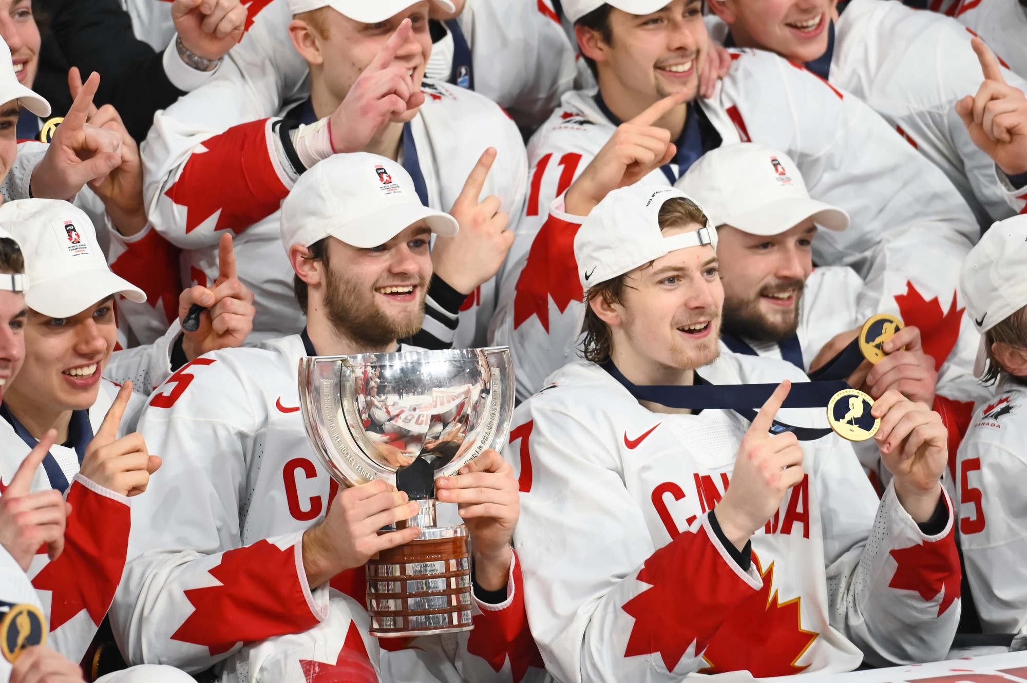 Team Canada players celebrate with the trophy after beating Czechia in overtime for gold at the 2023 IIHF World Junior Championship.