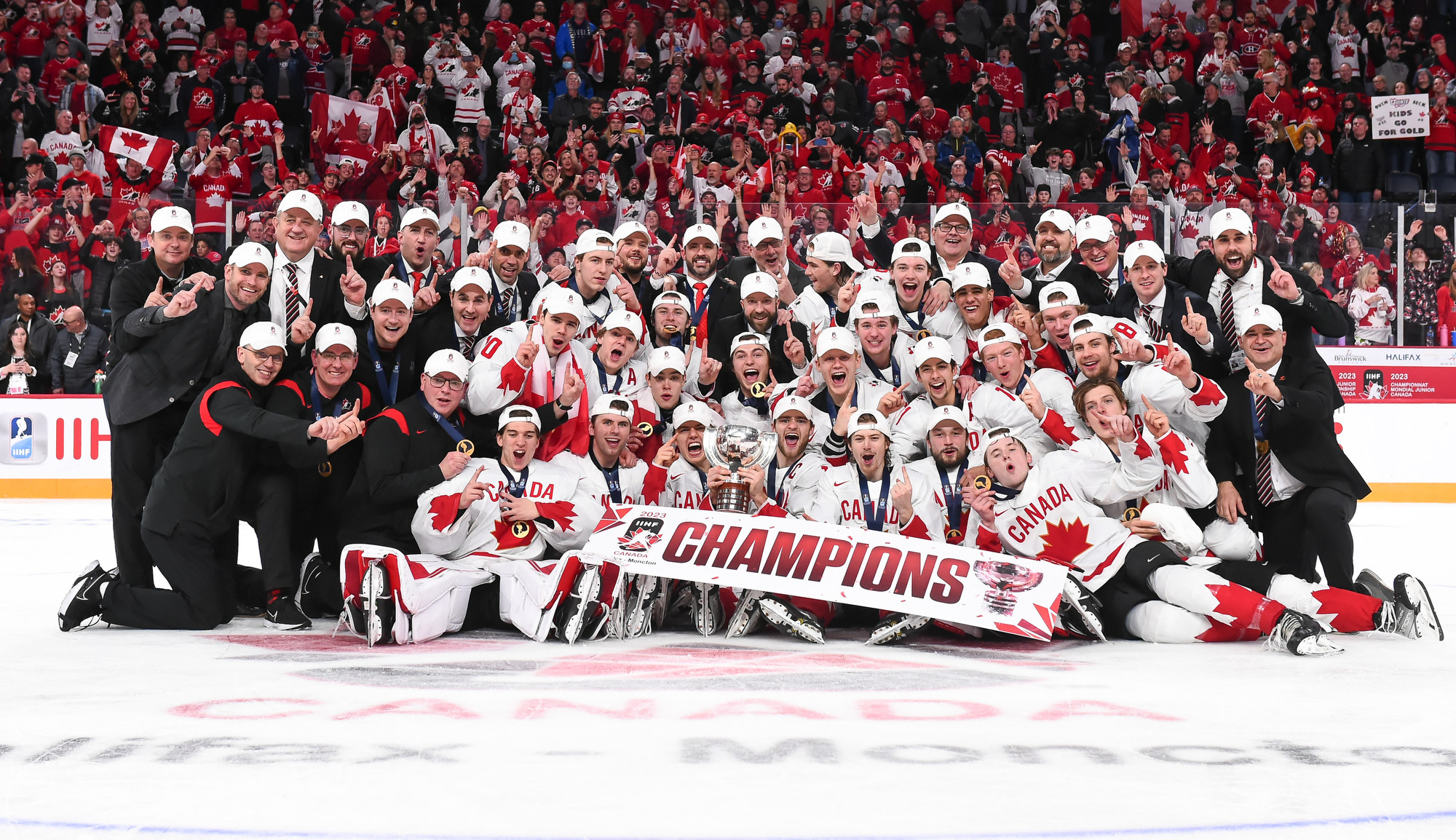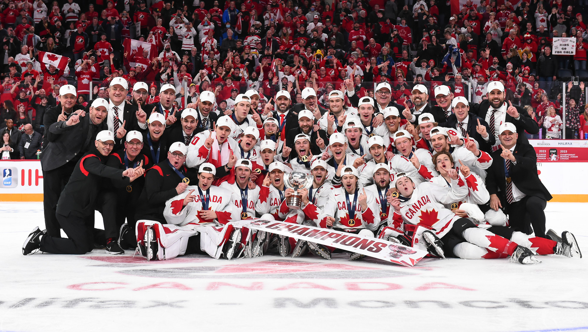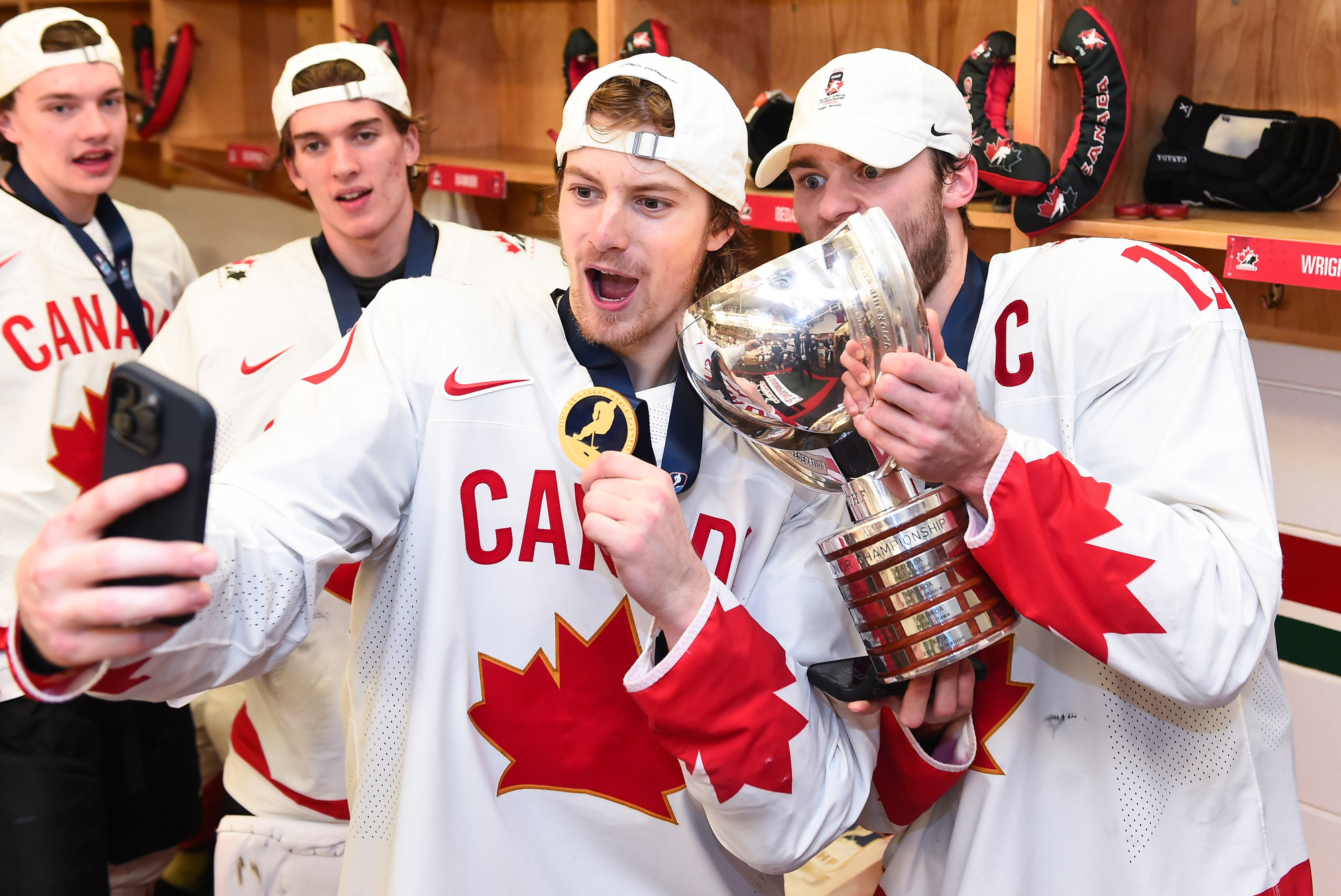 Team Canada players celebrate with the trophy after beating Czechia in overtime for gold at the 2023 IIHF World Junior Championship.