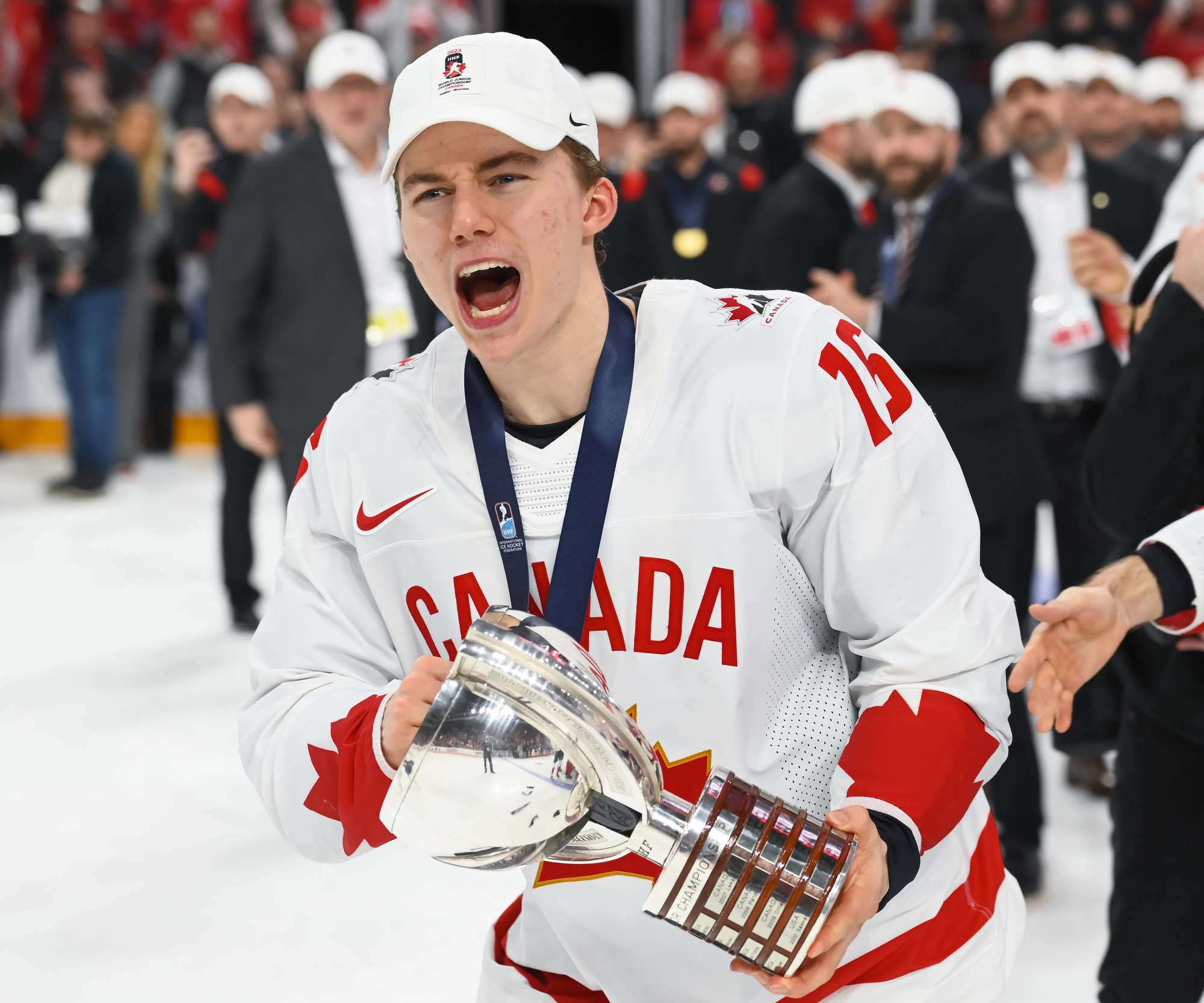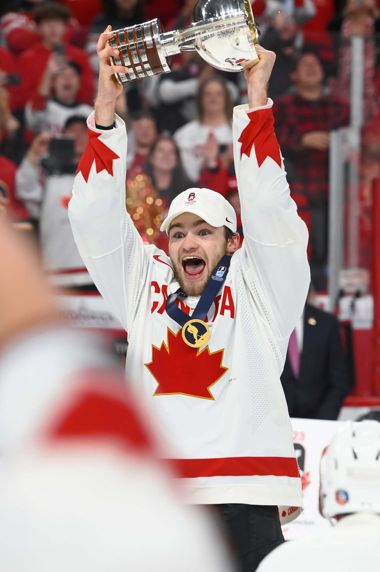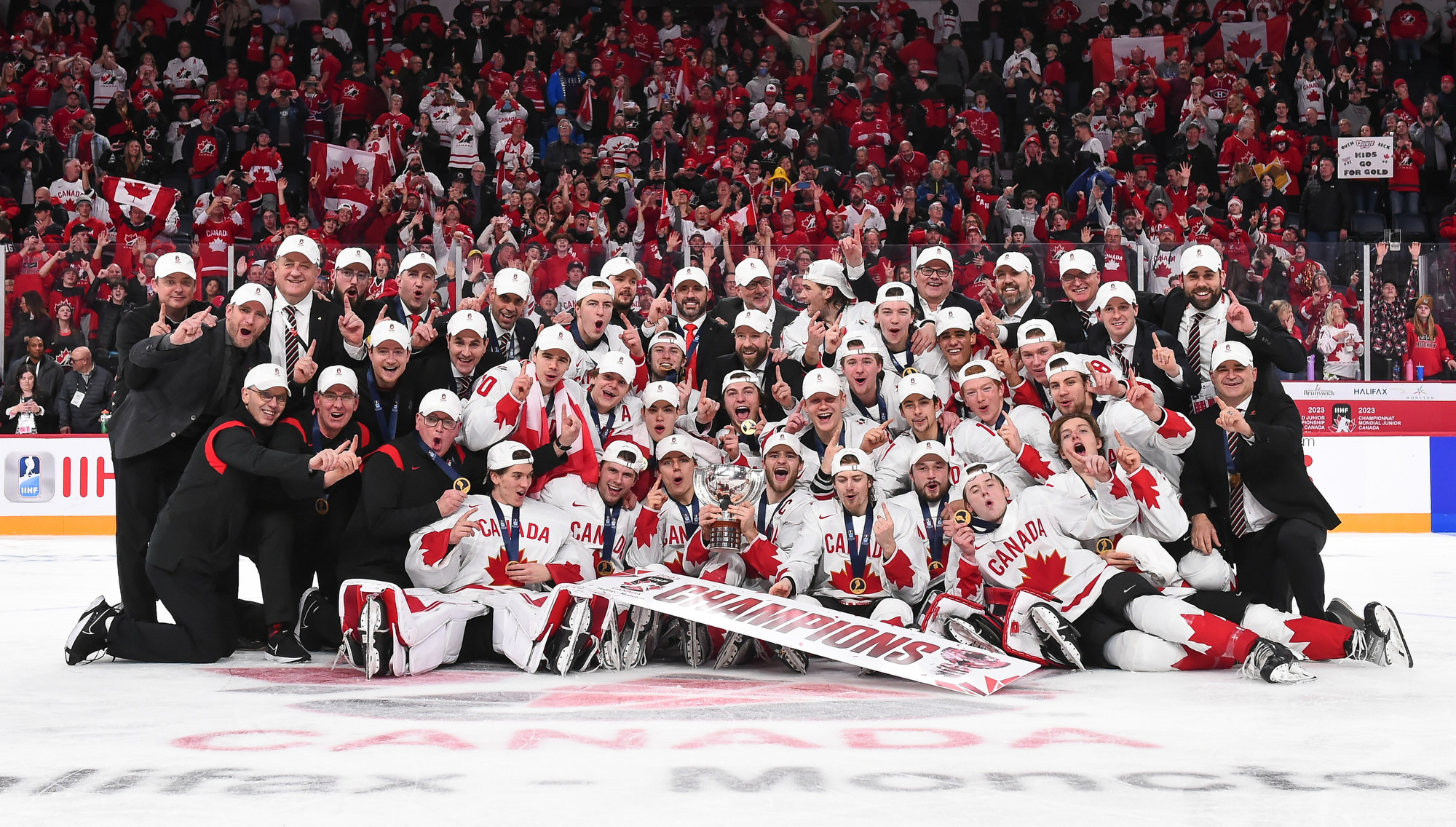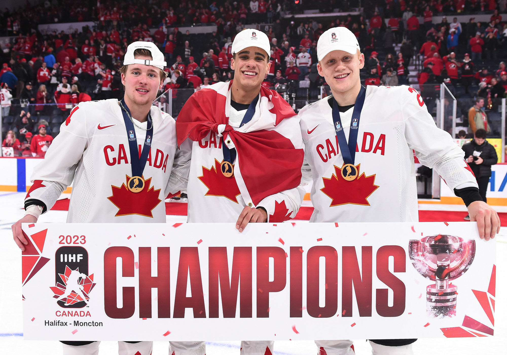 Team Canada players celebrate with the trophy after beating Czechia in overtime for gold at the 2023 IIHF World Junior Championship.