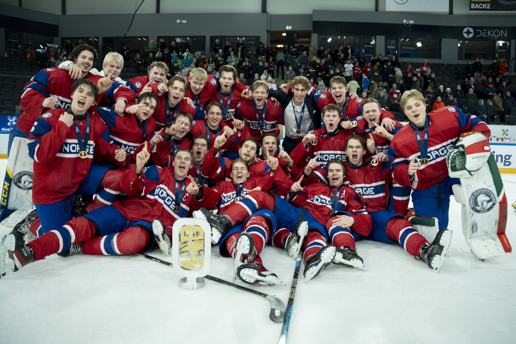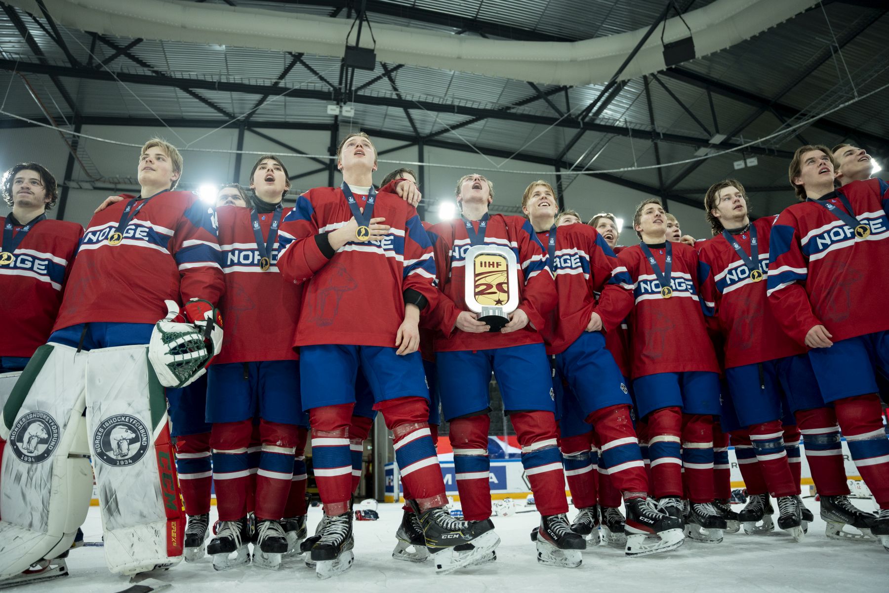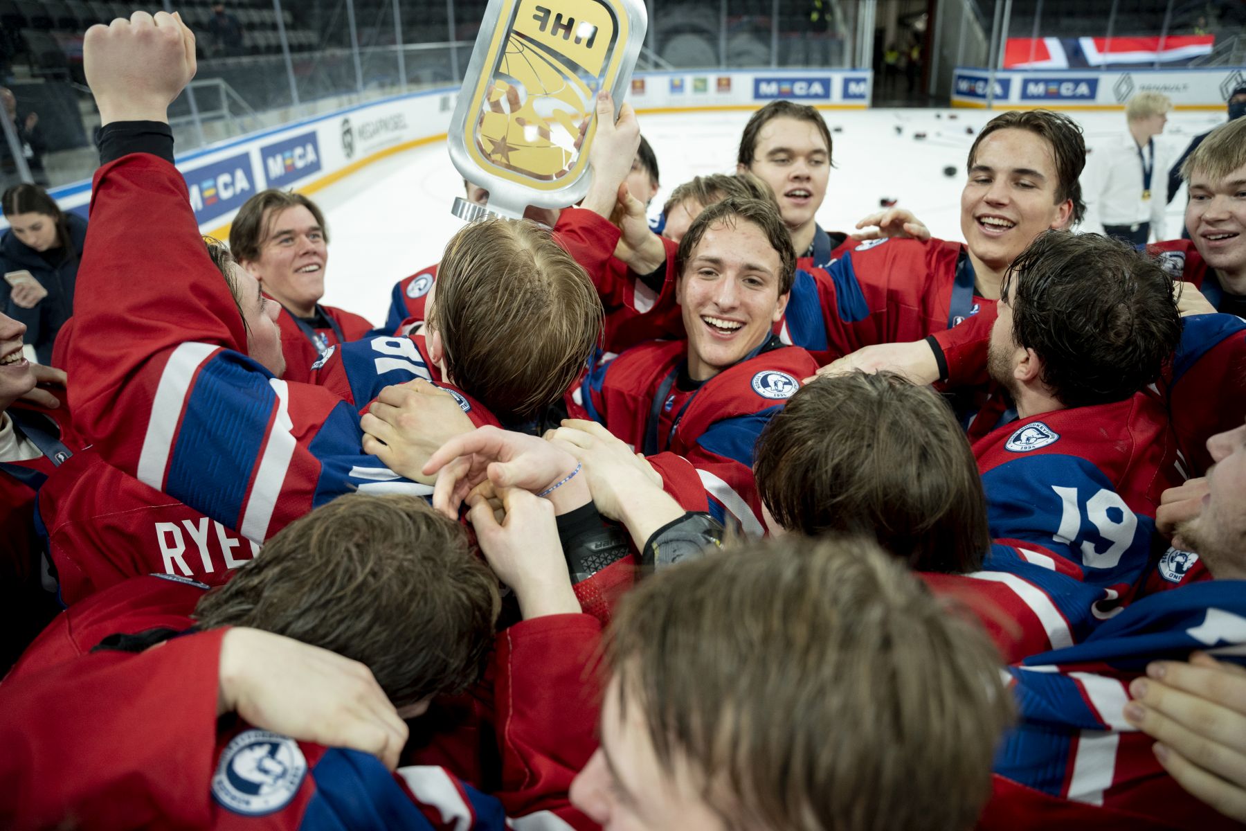 The Norwegian team celebrates with the trophy after beating Kazakhstan in the deciding game for gold at the 2023 IIHF Ice Hockey U20 World Championship Division I Group A.