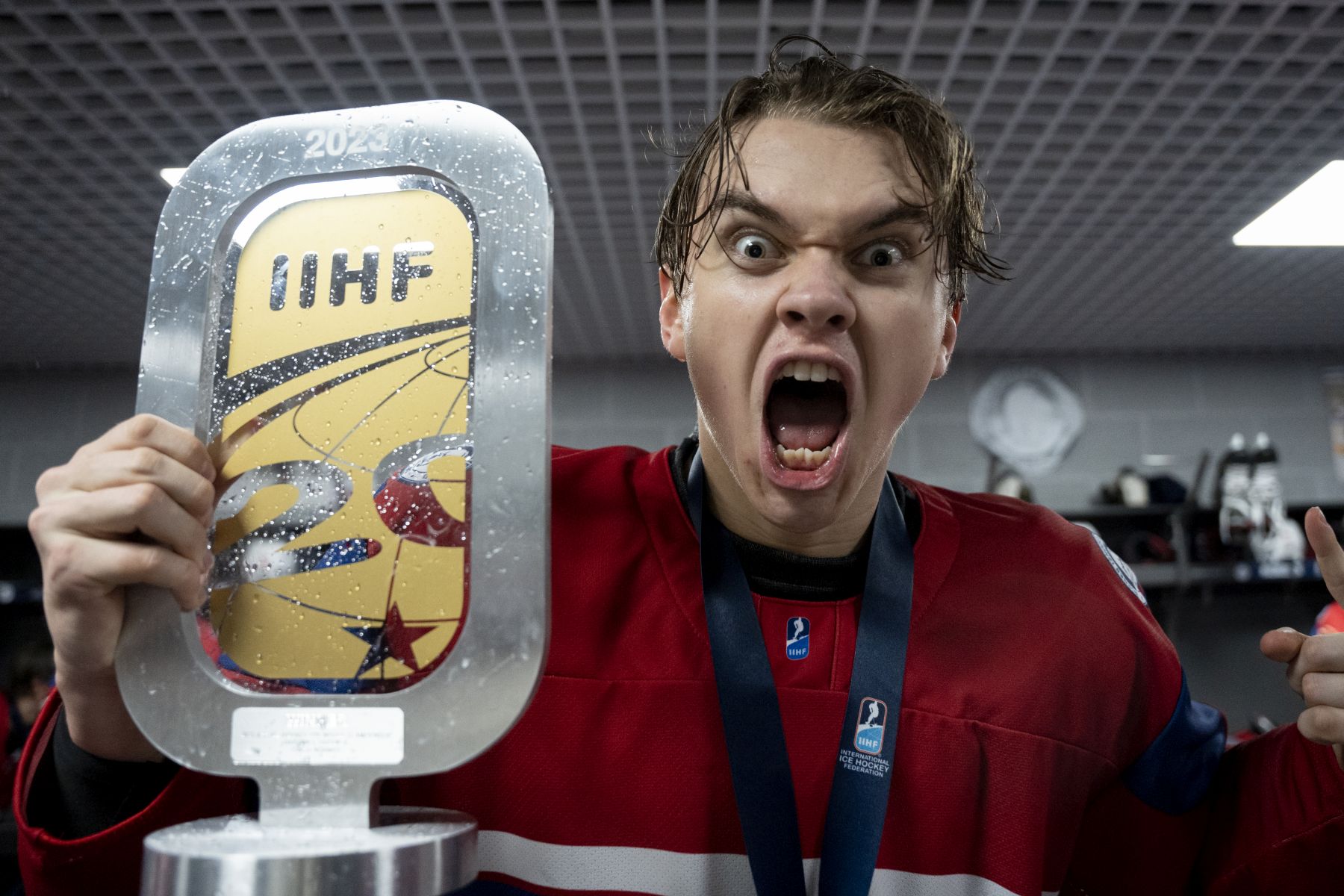 A Norwegian player celebrates with the trophy in the dressing room after the win against Kazakhstan in the deciding game for gold at the 2023 IIHF Ice Hockey U20 World Championship Division I Group A.
