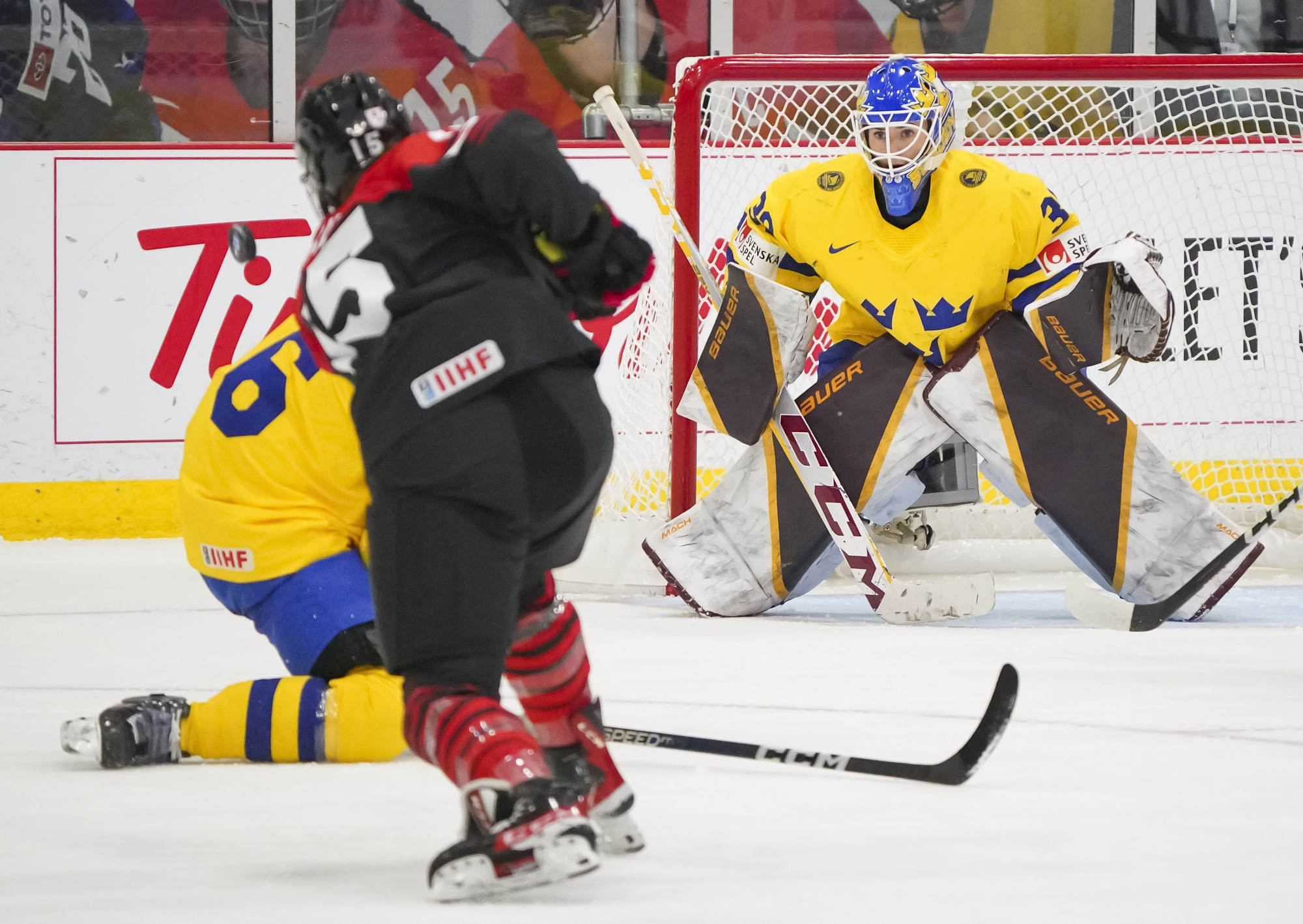 Sweden jumped into the lead midway through the first on a quick shot by Bouveng in the slot. It was the fifth time in six games that the Swedes had scored first, and the lead held up through the rest of the period.