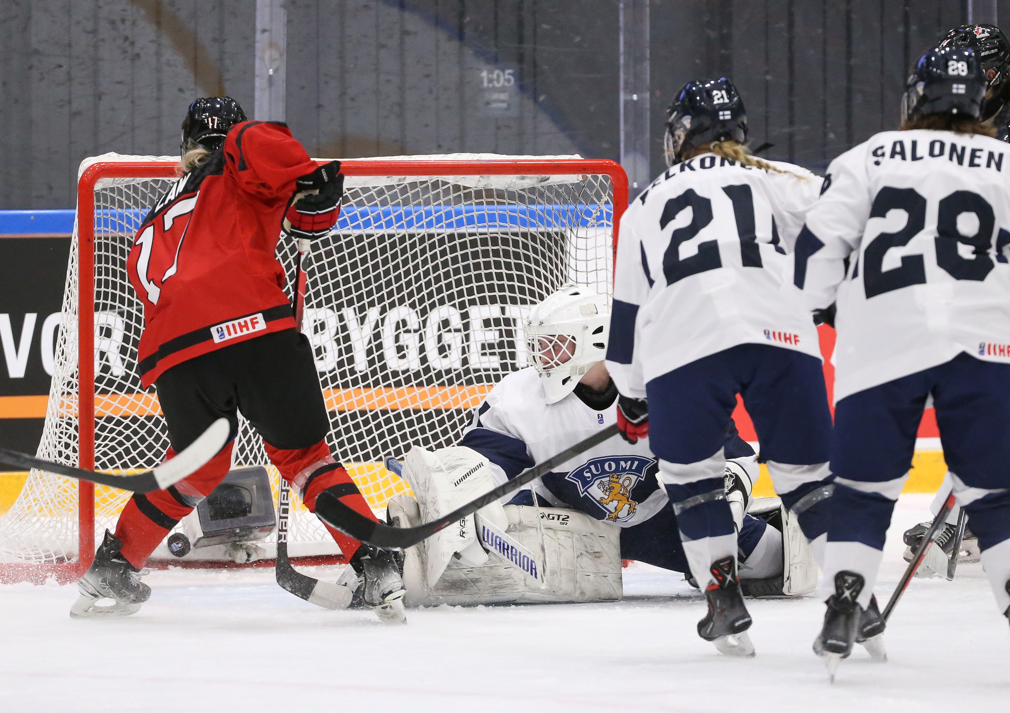 After two minutes of play with 4-on-4, Abby Stonehouse jumped out of the penalty box and was taken down by a Finnish defender. While the Finns were waiting for the referee to call the penalty, Keira Hurry fired a wrister that beat Kuja-Halkola on the glove side. Kraemer’s assist ion the goal was her third point of the game.