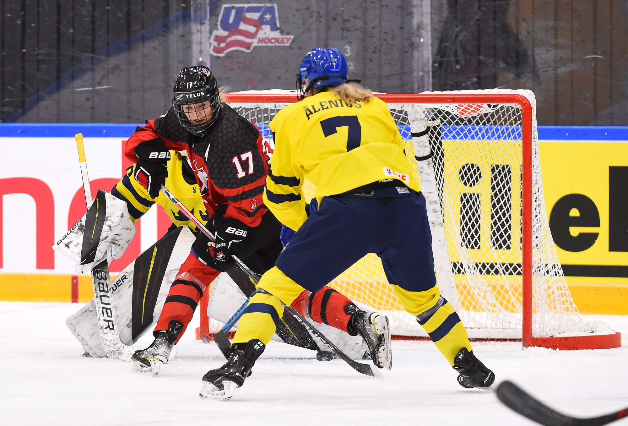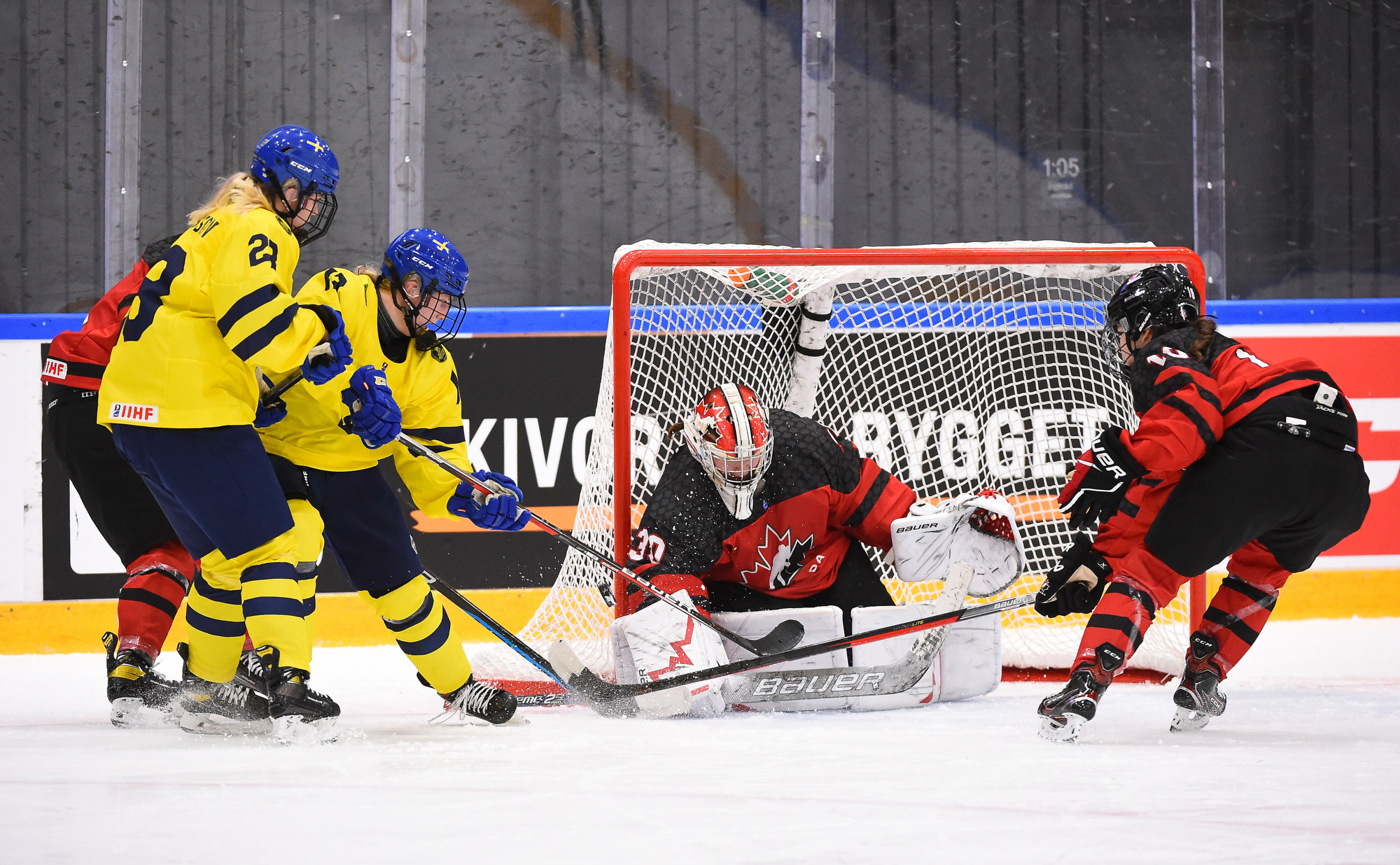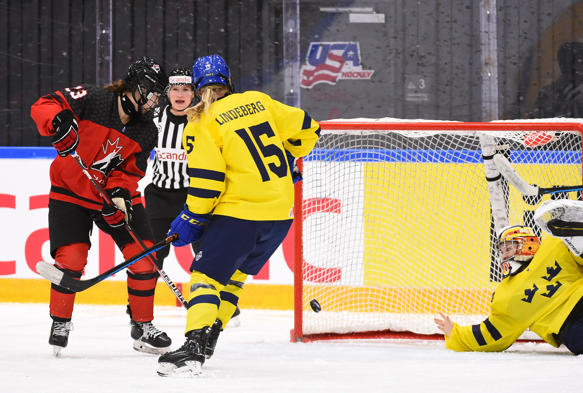 Canada broke the tie five minutes into the period when Sweden’s goalie Frank got tangled with her own defender by the side of the net making a save, and Caitlin Kraemer tapped the puck in.