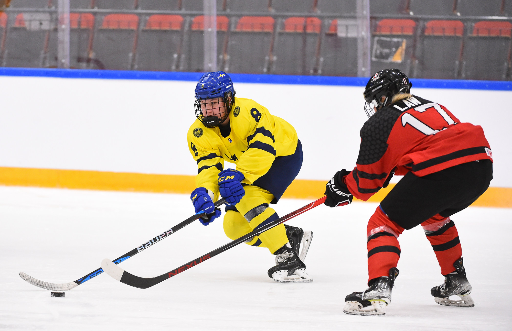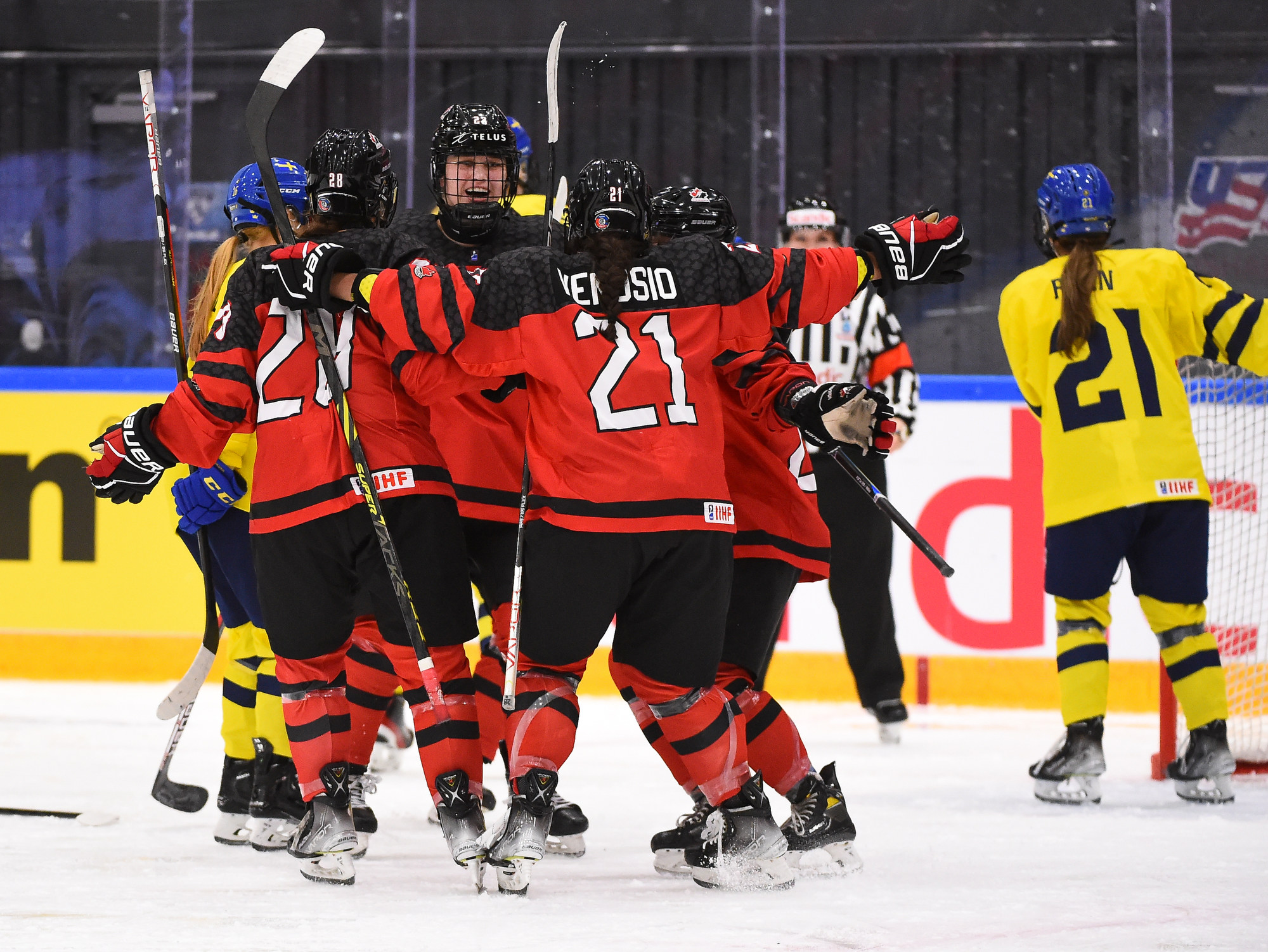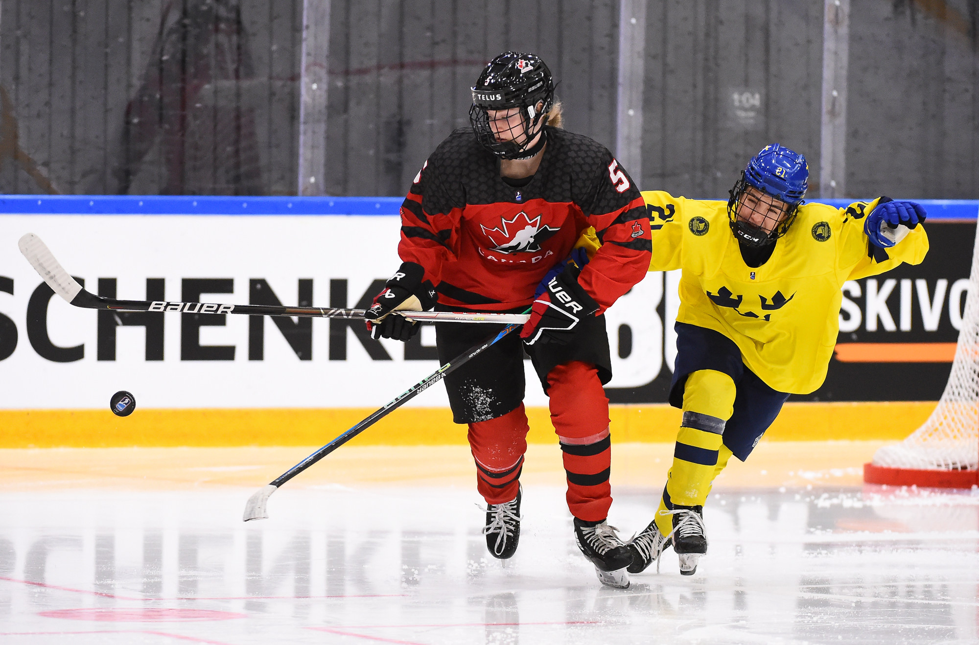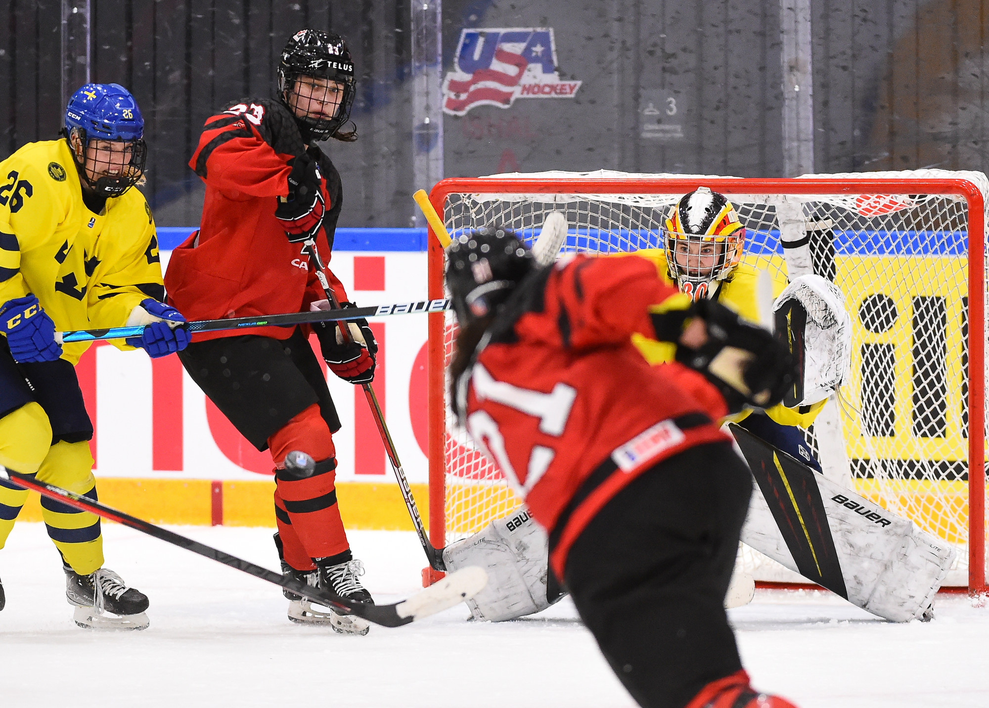 Canada broke the tie five minutes into the period when Sweden’s goalie Frank got tangled with her own defender by the side of the net making a save, and Caitlin Kraemer tapped the puck in.