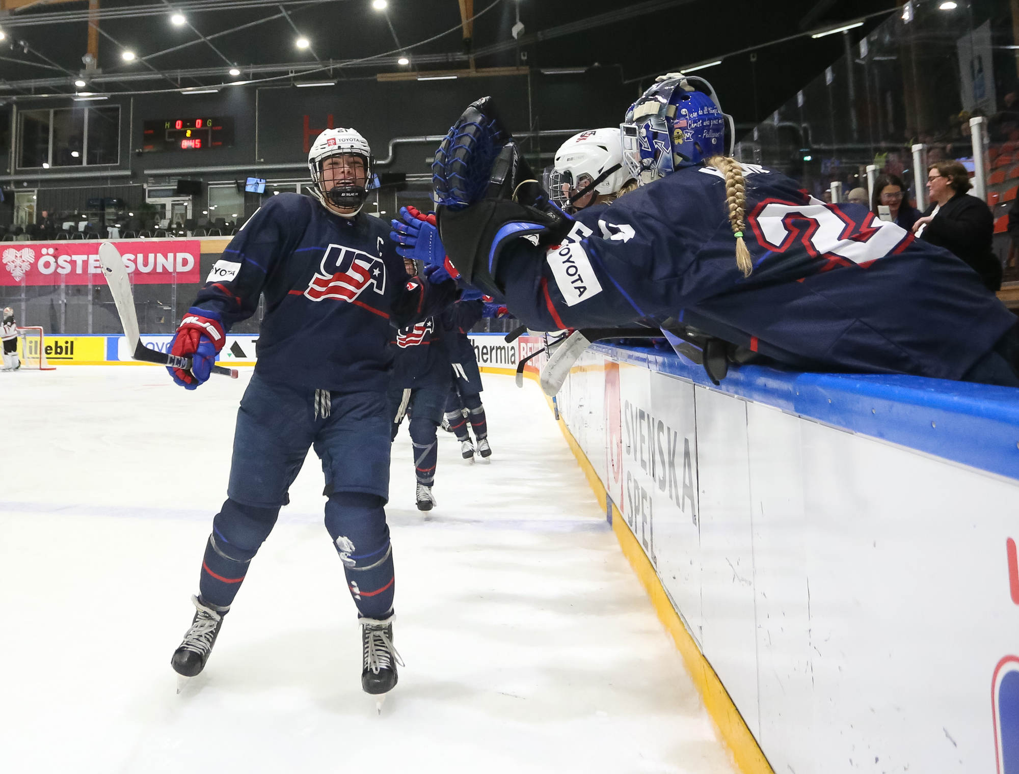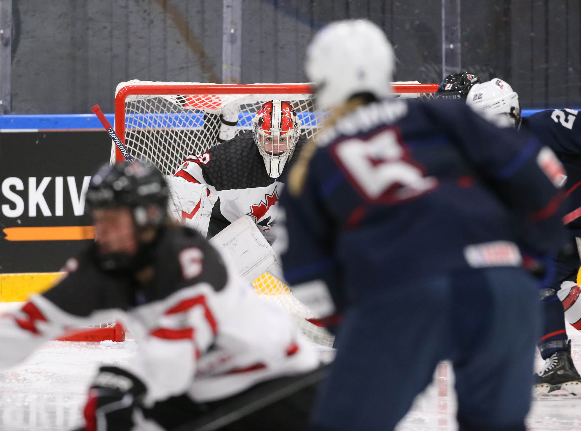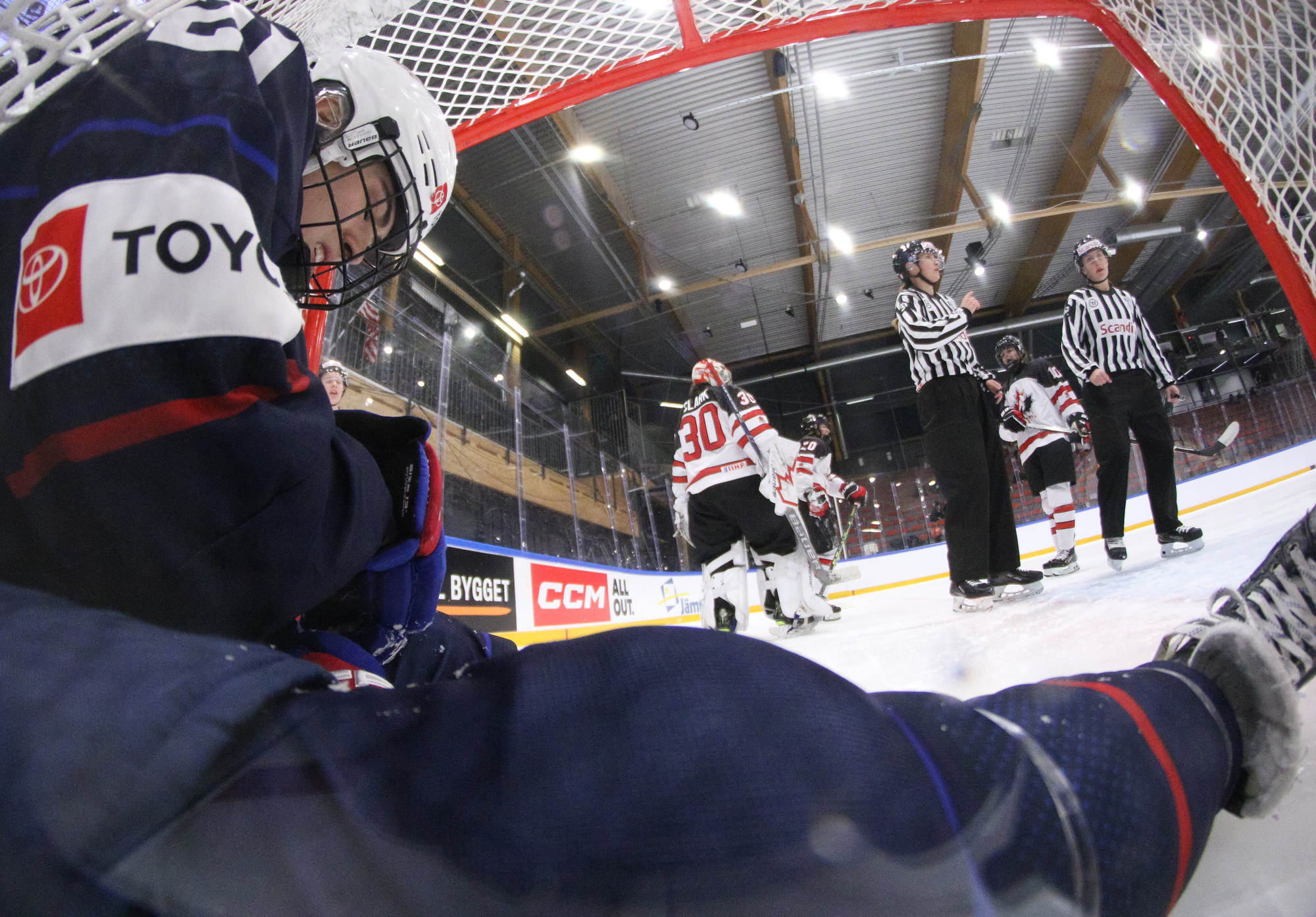 Canada extended the lead on a controversial sequence 3:12 into the third period. With Bergmann well out of the crease, Samantha Taber sprawled along the goal line and was pushed into the net as the whistle blew. Referees never signaled a goal on the ice. The Canadians erupted in celebration while U.S. players reacted as if play had stopped.