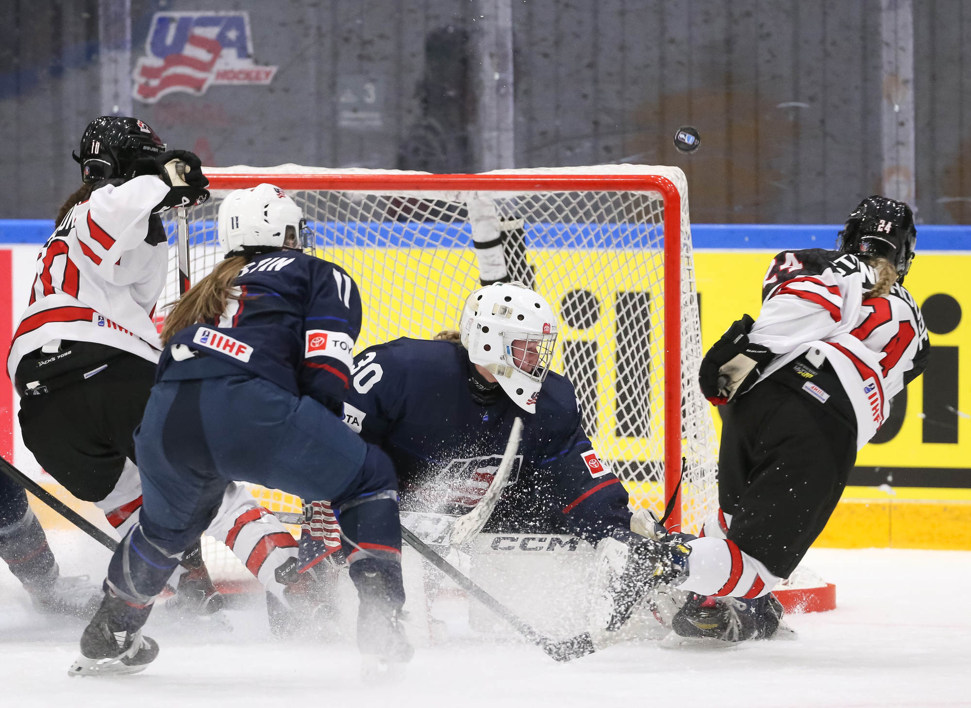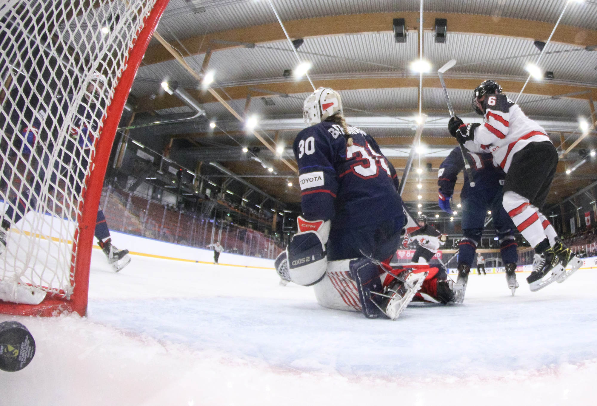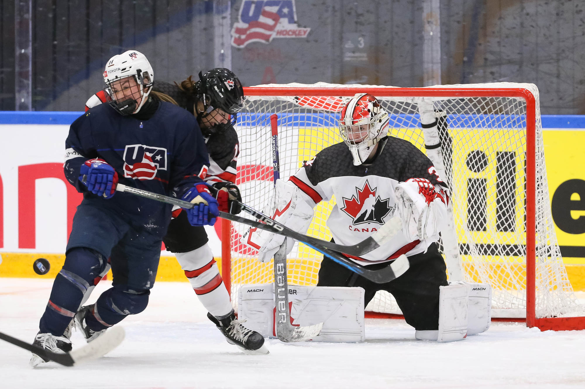 With 3:34 left in the contest and Canada's Baxter in the box for cross-checking, the U.S. pulled Bergmann for a 6-on-4. The power play unraveled quickly with a misplayed puck along the blue line, followed shortly thereafter by a cross-checking penalty by Molly Jordan to wipe out the advantage.